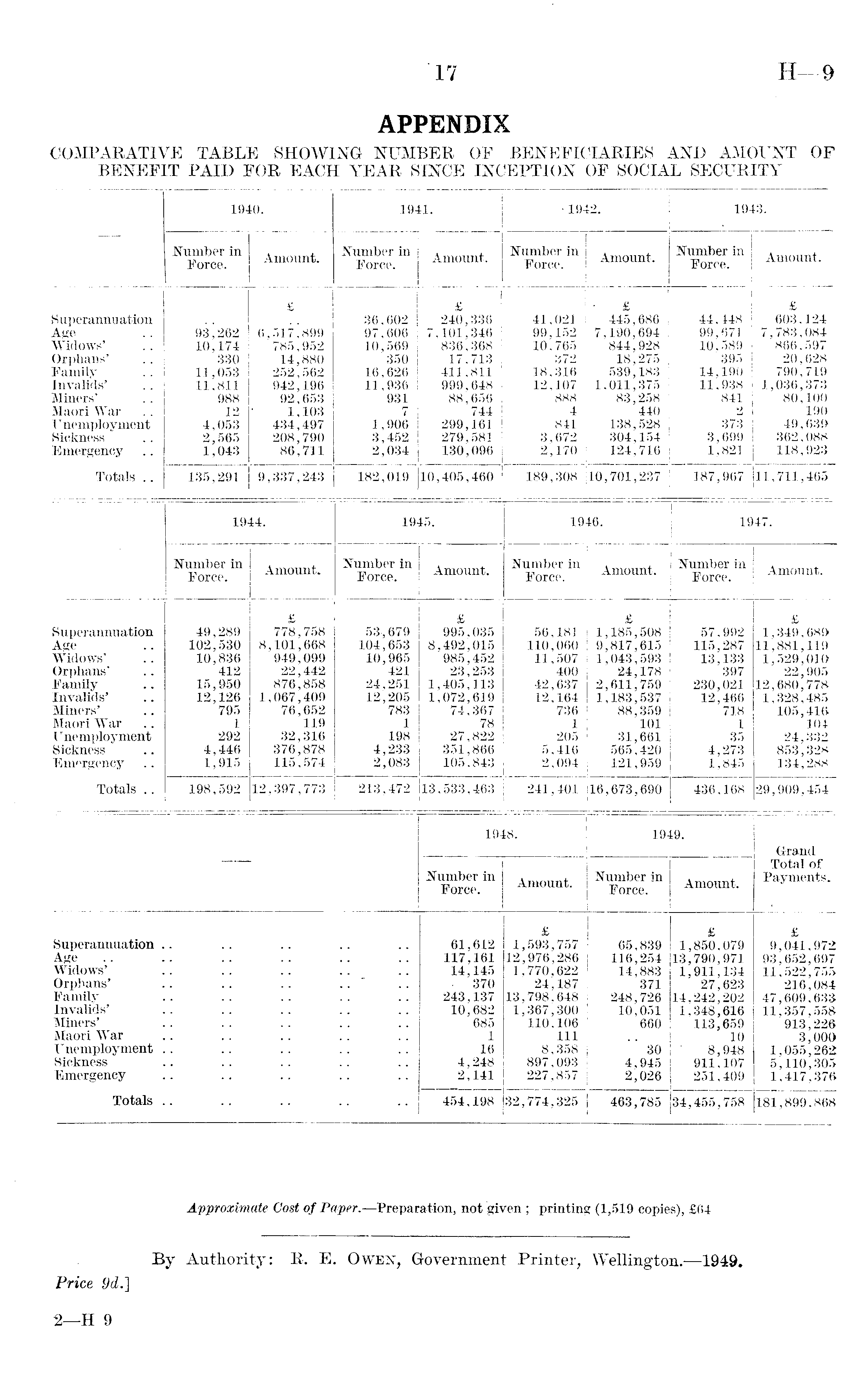 1940. 1941. ■ 1942. 1943. Number in Force. Amount. Number in Force. Amount. Number in Force. Amount. Number in Force. 1 Amount. Superannuation Age Widows' Orphans' Family Invalids' Miners' Maori War Unemployment Sickness Emergency 10,174 330 11,053 11,811 988 12 4,053 2,565 1,043 £ 785,952 14,880 252,562 942,196 92,653 1,103 434,497 208,790 86,711 36,602 97,606 10,569 350 16,626 11,936 931 1,906 3,452 2,034 £ 240,336 7,101,346 836,368 17,713 411,811 999,648 88,656 744 299,161 279,581 130,096 41,021 99,152 10,765 372 18,316 12,107 888 | 4 841 3,672 2,170 £ 445,686 7,190,694 844,928 18,275 539,183 1,011,375 83,258 440 138,528 304,154 124,716 | 44,448 1 99,671 : 10,589 395 14,190 11,938 841 2 373 3,699 1,821 £ 603,124 7,783,084 866,597 20,628 790,719 1,036,373 80,100 190 49,639 362,088 118,923 Totals .. 135,291 9,337,243 182,019 10,405,460 189,308 10,701,237 187,967 11,711,465 1944. 1945. 1946. 1347. Number in Force. Amount. Number in Force. Amount. Number in Force. Amount. Number in Force. Amount. Superannuation Age Widows' Orphans' Family Invalids' Miners' Maori War Unemployment Sickness Emergency 49,289 102,530 10,836 412 15,950 12,126 795 1 292 4,446 1,915 £ 778,758 8,101,668 949,099 22,442 876,858 1,067,409 76,652 119 32,316 376,878 115,574 53,679 104,653 10,965 ' 421 24,251 12,205 783 1 198 4,233 2,083 £ 995,035 8,492,015 985,452 23,253 1,405,113 1,072,619 74,367 78 27,822 351,866 105,843 56,181 110,060 11,507 400 42,637 12,164 736 1 205 5,416 2,094 £ 1,185,508 9,817,615 1,043,593 24,178 2,611,759 1,183,537 88,359 101 31,661 565,420 121,959 i 57,992 115,287 13,133 397 230,021 12,466 718 1 35 4,273 1,845 £ 1,349,689 11,881,119 1,529,010 22,905 12,680,778 1,328,485 105,416 104 24,332 853,328 134,288 Totals .. 198,592 12,397,773 213,472 jl3,533,463 241,401 jl6,673,690 436,168 29,909,454 1948. 1949. Grand Number in Force. Amount. Number in Force. Amount. Total of Payments. Superannuation Age Widows' Orphans' Family Invalids' Miners' Maori War Unemployment Sickness Emergency :: - :: 61,612 117,161 14,145 370 243,137 10,682 685 1 16 4,248 2,141 £ 1,593,757 12,976,286 1,770,622 24,187 13,798,648 1,367,300 110,106 111 8,358 897,093 227,857 65,839 116,254 14,883 371 248,726 10,051 660 30 4,945 2,026 £ 1,850,079 13,790,971 1,911,134 27,623 14,242,202 1,348,616 113,659 10 8,948 911,107 251,409 £ 9,041,972 93,652,697 11,522,755 216,084 47,609,633 11,357,558 913,226 3,000 1,055,262 5,110,305 1,417,376 Totals . 454,198 32,774,325 463,785 34,455,758 181,899,868