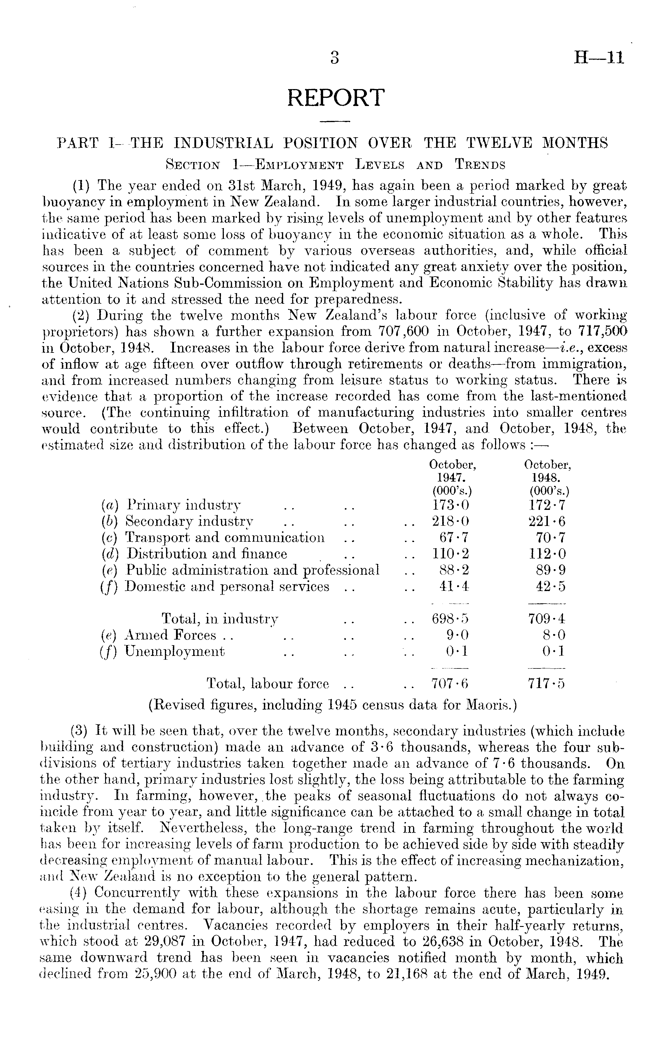 REPORT PART I—THE INDUSTRIAL POSITION OVER THE TWELVE MONTHS Section I—Employment Levels and Trends (1) The year ended on 31st March, 1949, has again been a period marked by great buoyancy in employment in New Zealand. In some larger industrial countries, however, the same period has been marked by rising levels of unemployment and by other features indicative of at least some loss of buoyancy in the economic situation as a whole. This has been a subject of comment by various overseas authorities, and, while official sources in the countries concerned have not indicated any great anxiety over the position, the United Nations Sub-Commission on Employment and Economic Stability has drawn attention to it and stressed the need for preparedness. (2) During the twelve months New Zealand's labour force (inclusive of workingproprietors) has shown a further expansion from 707,600 in October, 1947, to 717,500 in October, 1948. Increases in the labour force derive from natural increase—i.e., excess of inflow at age fifteen over outflow through retirements or deaths —from immigration, and from increased numbers changing from leisure status to working status. There is evidence that a proportion of the increase recorded has come from the last-mentioned source. (The continuing infiltration of manufacturing industries into smaller centres would contribute to this effect.) Between October, 1947, and October, 1948, the estimated size and distribution of the labour force has changed as follows : —• October, October, 1947. 1948. (000's.) (000's.) (a) Primary industry .. .. , 173-0 172-7 (b) Secondary industry .. .. .. 218-0 221-6 (c) Transport and communication .. .. 67-7 70-7 (d) Distribution and finance .. .. 110-2 112*0 (e) Public administration and professional .. 88-2 89-9 (/) Domestic and personal services .. .. 41-4 42-5 Total, in industry .. .. 698 • 5 709 • 4 (e) Armed Forces .. .. .. .. 9-0 8-0 (/) Unemployment .. .. .. 0-1 0-1 Total, labour force .. .. 707-6 717-5 (Revised figures, including 1945 census data for Maoris.) (3) It will be seen that, over the twelve months, secondary industries (which include building and construction) made an advance of 3-6 thousands, whereas the four subdivisions of tertiary industries taken together made an advance of 7• 6 thousands. On the other hand, primary industries lost slightly, the loss being attributable to the farming industry. In farming, however, the peaks of seasonal fluctuations do not always coincide from year to year, and little significance can be attached to a small change in total taken by itself. Nevertheless, the long-range trend in farming throughout the world has been for increasing levels of farm production to be achieved side by side with steadily decreasing employment of manual labour. This is the effect of increasing mechanization, and New Zealand is no exception to the general pattern. (4) Concurrently with these expansions in the labour force there has been some easing in the demand for labour, although the shortage remains acute, particularly in the industrial centres. Vacancies recorded by employers in their half-yearly returns, which stood at 29,087 in October, 1947, had reduced to 26,638 in October, 1948. The same downward trend has been seen in vacancies notified month by month, which declined from 25,900 at the end of March, 1948, to 21,168 at the end of March, 1949.