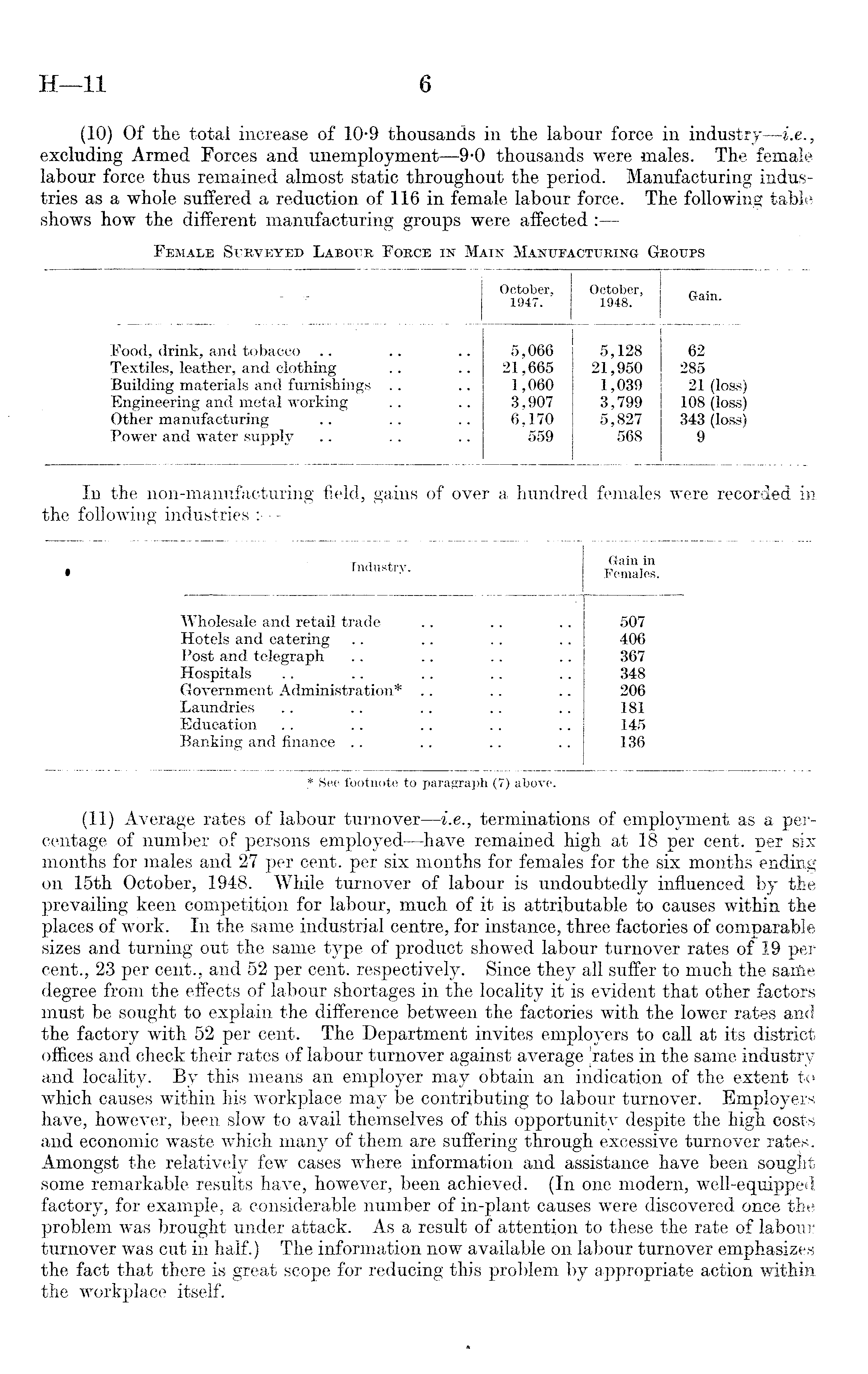 (11) Average rates of labour turnover—i.e., terminations of employment, as a percentage of number of persons employed—have remained high at 18 per cent, tier six months for males and 27 per cent, per six months for females for the six months ending on 15th October, 1948. While turnover of labour is undoubtedly influenced by the prevailing keen competition for labour, much of it is attributable to causes within the places of work. In the same industrial centre, for instance, three factories of comparable sizes and turning out the same type of product showed labour turnover rates of 19 per cent., 23 per cent., and 52 per cent, respectively. Since they all suffer to much the same degree from the effects of labour shortages in the locality it is evident that other factors must be sought to explain the difference between the factories with the lower rates and the factory with 52 per cent. The Department invites employers to call at its district offices and check their rates of labour turnover against average rates in the same industry and locality. By this means an employer may obtain an indication of the extent to which causes within his workplace may be contributing to labour turnover. Employers have, however, been slow to avail themselves of this opportunity despite the high costs and economic waste which many' of them are suffering through excessive turnover rates. Amongst the relatively few cases where information and assistance have been sought some remarkable results have, however, been achieved. (In one modern, well-equipped factory, for example, a considerable number of in-plant causes were discovered once the problem was brought under attack. As a result of attention to these the rate of labour turnover was cut in half.) The information now available on labour turnover emphasizes the fact that there is great scope for reducing this problem by appropriate action within the workplace itself.