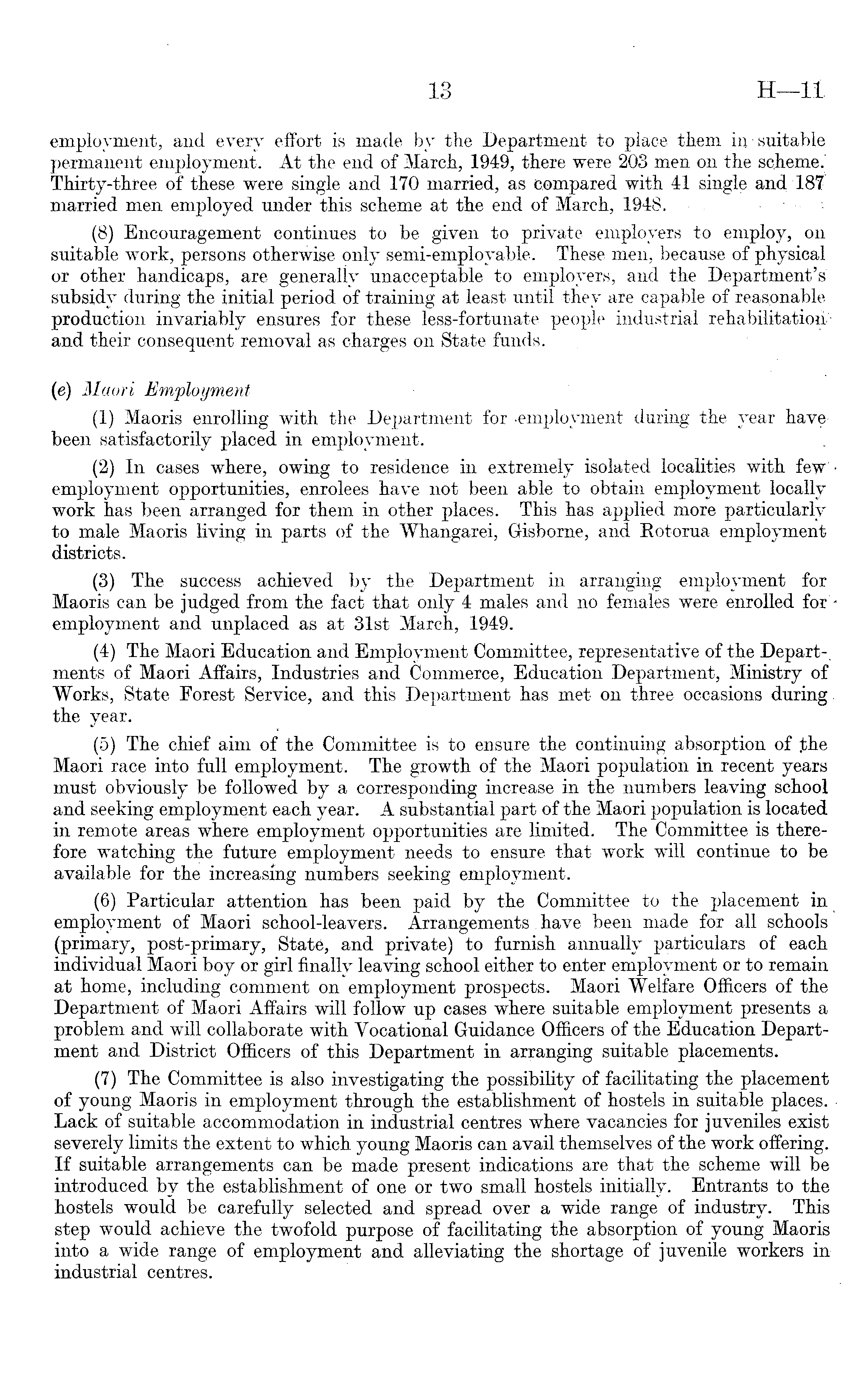 employment, and every effort is made by the Department to place them in suitable permanent employment. At the end of March, 1949, there were 203 men on the scheme.' Thirty-three of these were single and 170 married, as compared with 41 single and 187 married men employed under this scheme at the end of March, 1948. (8) Encouragement continues to be given to private employers to employ, on suitable work, persons otherwise only semi-employable. These men, because of physical or other handicaps, are generally unacceptable to employers, and the Department's subsidy during the initial period of training at least until they are capable of reasonable production invariably ensures for these less-fortunate people industrial rehabilitation and their consequent removal as charges on State funds. (e) Maori Employment (1) Maoris enrolling with the Department for -employment during the year have been satisfactorily placed in employment. (2) In cases where, owing to residence in extremely isolated localities with few employment opportunities, enrolees have not been able to obtain employment locally work has been arranged for them in other places. This has applied more particularly to male Maoris living in parts of the Whangarei, Gisborne, and Rotorua employment districts. (3) The success achieved by the Department in arranging employment for Maoris can be judged from the fact that only 4 males and no females were enrolled for employment and unplaced as at 31st March, 1949. (4) The Maori Education and Employment Committee, representative of the Depart-, ments of Maori Affairs, Industries and Commerce, Education Department, Ministry of Works, State Forest Service, and this Department has met on three occasions during the year. (5) The chief aim of the Committee is to ensure the continuing absorption of the Maori race into full employment. The growth of the Maori population in recent years must obviously be followed by a corresponding increase in the numbers leaving school and seeking employment each year. A substantial part of the Maori population is located in remote areas where employment opportunities are limited. The Committee is therefore watching the future employment needs to ensure that work will continue to be available for the increasing numbers seeking employment. (6) Particular attention has been paid by the Committee to the placement in employment of Maori school-leavers. Arrangements, have been made for all schools (primary, post-primary, State, and private) to furnish annually particulars of each individual Maori boy or girl finally leaving school either to enter employment or to remain at home, including comment ,on employment prospects. Maori Welfare Officers of the Department of Maori Affairs will follow up cases where suitable employment presents a problem and will collaborate with Vocational Guidance Officers of the Education Department and District Officers of this Department in arranging suitable placements. (7) The Committee is also investigating the possibility of facilitating the placement of young Maoris in employment through the establishment of hostels in suitable places. Lack of suitable accommodation in industrial centres where vacancies for juveniles exist severely limits the extent to which young Maoris can avail themselves of the work offering. If suitable arrangements can be made present indications are that the scheme will be introduced by the establishment of one or two small hostels initially. Entrants to the hostels would be carefully selected and spread over a wide range of industry. This step would achieve the twofold purpose of facilitating the absorption of young Maoris into a wide range of employment and alleviating the shortage of juvenile workers in industrial centres.