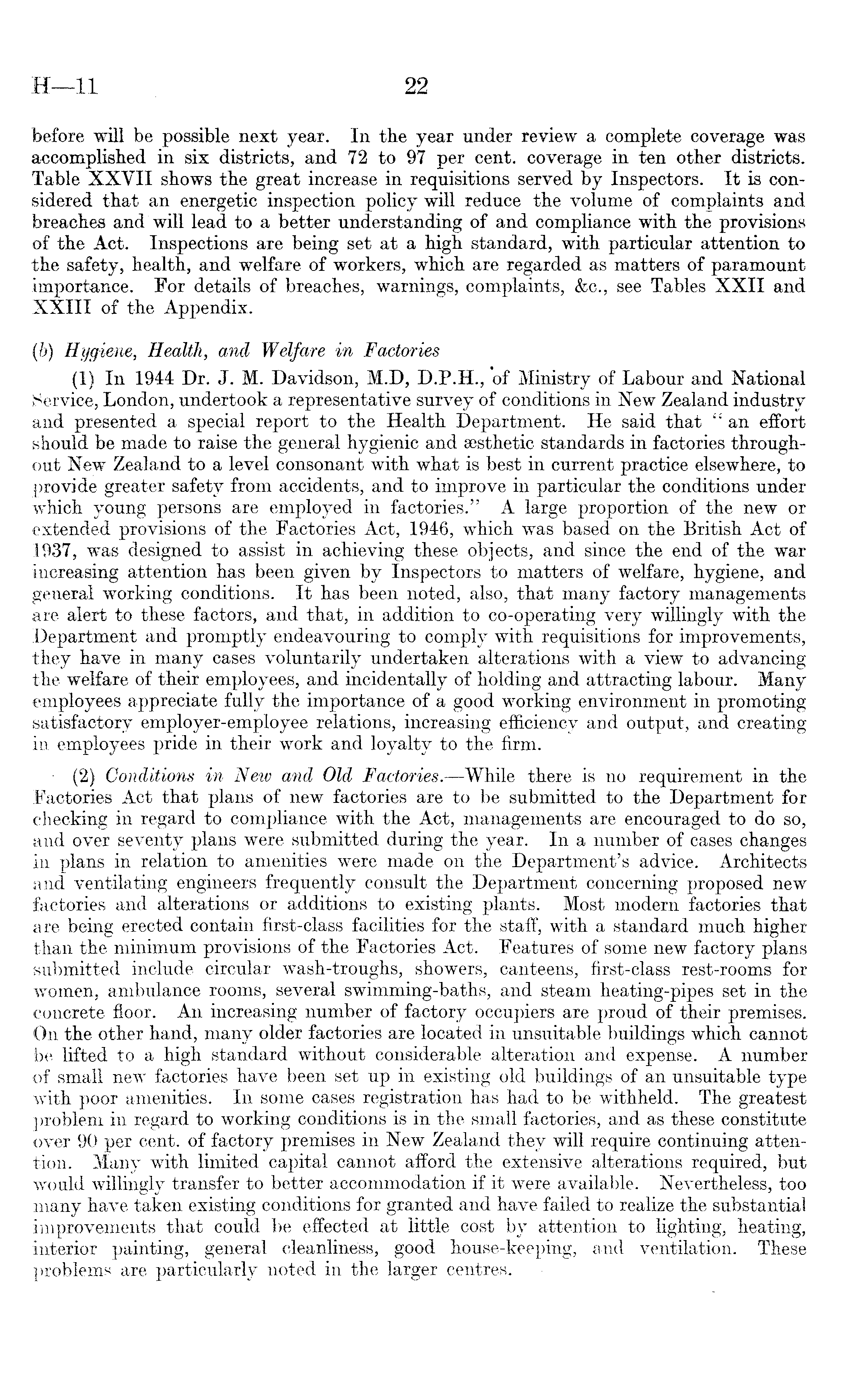 before will be possible next year. In the year under review a complete coverage was accomplished in six districts, and 72 to 97 per cent, coverage in ten other districts. Table XXYII shows the great increase in requisitions served by Inspectors. It is considered that an energetic inspection policy will reduce the volume of complaints and breaches and'will lead to a better understanding of and compliance with the provisions of the Act. Inspections are being set at a high standard, with particular attention to the safety, health, and welfare of workers, which are regarded as matters of paramount importance. For details of breaches, warnings, complaints, &c., see Tables XXII and XXIII of the Appendix. (6) Hygiene, Health, and Welfare in Factories (1) In 1944 Dr. J. M. Davidson, M.D, D.P.H., of Ministry of Labour and National Service, London, undertook a representative survey of conditions in New Zealand industry and presented a special report to the Health Department. He said that "an effort should be made to raise the general hygienic and aesthetic standards in factories throughout New Zealand to a level consonant with what is best in current practice elsewhere, to provide greater safety from accidents, and to improve in particular the conditions under which young persons are employed in factories." A large proportion of the new or extended provisions of the Factories Act, 1946, which was based on the British Act of 1937, was designed to assist in achieving these objects, and since the end of the war increasing attention has been given by Inspectors to matters of welfare, hygiene, and general working conditions. It has been noted, also, that many factory managements are alert to these factors, and that, in addition to co-operating very willingly with the Department and promptly endeavouring to comply with requisitions for improvements, they have in many cases voluntarily undertaken alterations with a view to advancing the welfare of their employees, and incidentally of holding and attracting labour. Many employees appreciate fully the importance of a good working environment in promoting satisfactory employer-employee relations, increasing efficiency and output, and creating in employees pride in their work and loyalty to the firm. • (2) Conditions in New and Old Factories. —While there is no requirement in the Factories Act that plans of new factories are to be submitted to the Department for checking in regard to compliance with the Act, managements are encouraged to do so, and over seventy plans were submitted during the year. In a number of cases changes in plans in relation to amenities were made on the Department's advice. Architects and ventilating engineers frequently consult the Department concerning proposed new factories and alterations or additions to existing plants. Most modern factories that are being erected contain first-class facilities for the staff, with a standard much higher than the minimum provisions of the Factories Act. Features of some new factory plans submitted include circular wash-troughs, showers, canteens, first-class rest-rooms for women, ambulance rooms, several swimming-baths, and steam heating-pipes set in the concrete floor. An increasing number of factory occupiers are proud of their premises. On the other hand, many older factories are located in unsuitable buildings which cannot be lifted to a high standard without considerable alteration and expense. A number of small new factories have been set up in existing old buildings of an unsuitable type with poor amenities. In some cases registration has had to be withheld. The greatest problem in regard to working conditions is in the small factories, and as these constitute over 90 per cent, of factory premises in New Zealand they will require continuing attention. Many with limited capital cannot afford the extensive alterations required, but would willingly transfer to better accommodation if it were available. Nevertheless, too many have taken existing conditions for granted and have failed to realize the substantial improvements that could be effected at little cost by attention to lighting, heating, interior painting, general cleanliness, good house-keeping, and ventilation. These problems are particularly noted in the larger centres.
