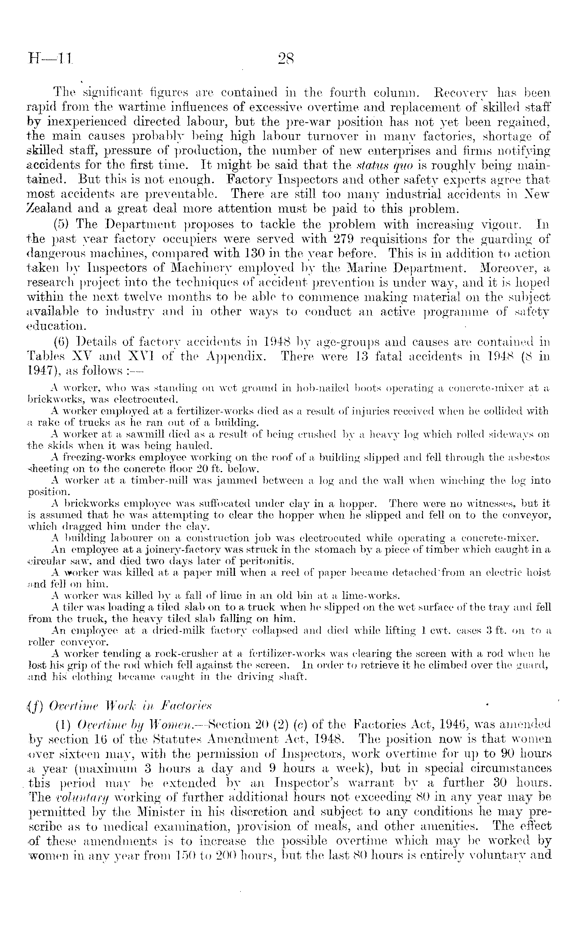 The significant figures are contained in the fourth column. Kecovery has been rapid from the wartime influences of excessive overtime and replacement of skilled staff by inexperienced directed labour, but the pre-war position has not yet been regained, the main causes probably being high labour turnover in many factories, shortage of skilled staff, pressure of production, the number of new enterprises and firms notifying accidents for the first time. It might be said that the status quo is roughly being maintained. But this is not enough. Factory Inspectors and other safety experts agree that most accidents are preventable. There are still too many industrial accidents in New Zealand and a great deal more attention must be paid to this problem. (5) The Department proposes to tackle the problem with increasing vigour. In the past year factory occupiers were served with 279 requisitions for the guarding of dangerous machines, compared with 130 in the year before. This is in addition to action taken by Inspectors of Machinery employed by the Marine Department. Moreover, a research project into the techniques of accident prevention is under way, and it is hoped within the next twelve months to be able to commence making material on the subject available to industry and in other ways to conduct an active programme of safety education. (6) Details of factory accidents in 1948 by age-groups and causes are contained in Tables XY and XVI of the Appendix. There were 13 fatal accidents in 1948 (8 in 1947), as follows : A worker, who was standing on wet ground in hob-nailed boots operating a concrete-mixer at a brickworks, was electrocuted. A worker employed at a fertilizer-works died as a result of injuries received when he collided with a rake of trucks as he ran out of a building. A worker at a sawmill died as a result of being crushed by a heavy log which rolled sideways on the skids when it was being hauled. A freezing-works employee working on the roof of a building slipped and fell through the asbestos sheeting on to the concrete floor 20 ft. below. A worker at a timber-mill was jammed between a log and the wall when winching the log into position. A brickworks employee was suffocated under clay in a hopper. There were no witnesses, but it is assumed that he was attempting to clear the hopper when he slipped and fell on to the conveyor, which dragged him under the clay. A building labourer on a construction job was electrocuted while operating a concrete-mixer. An employee at a joinery-factory was struck in the stomach by a piece of timber which caught in a circular saw, and died two days later of peritonitis. A worker was killed at a paper mill when a reel of paper became detached'from an electric hoist and fell on him. A worker was killed by a fall of lime in an old bin at a lime-works. A tiler was loading a tiled slab on to a truck when he slipped on the wet surface of the tray and fell from the truck, the heavy tiled slab falling on him. An employee at a dried-milk factory collapsed and died while lifting 1 cwt. cases 3 ft. on to a roller conveyor. A worker tending a rock-crusher at a fertilizer-works was clearing the screen with a rod when he lost his grip of the rod which fell against the screen. In order to retrieve it he climbed over the guard, and his clothing became caught in the driving shaft. (f) Overtime Work in Factories (1) Overtime by Women. —Section 20 (2) (c) of the Factories Act, 1946, was amended by section 16 of the Statutes Amendment Act, 1948. The position now is that women over sixteen may, with the permission of Inspectors, work overtime for up to 90 hours & year (maximum 3 hours a day and 9 hours a week), but in special circumstances this period may be extended by an Inspector's warrant by a further 30 hours. The voluntary working of further additional hours not exceeding 80 in any year may be •permitted by the Minister in his discretion and subject to any conditions he may prescribe as to medical examination, provision of meals, and other amenities. The effect •of these amendments is to increase the possible overtime which may be worked by women in any year from 150 to 200 hours, but the last 80 hours is entirely voluntary and