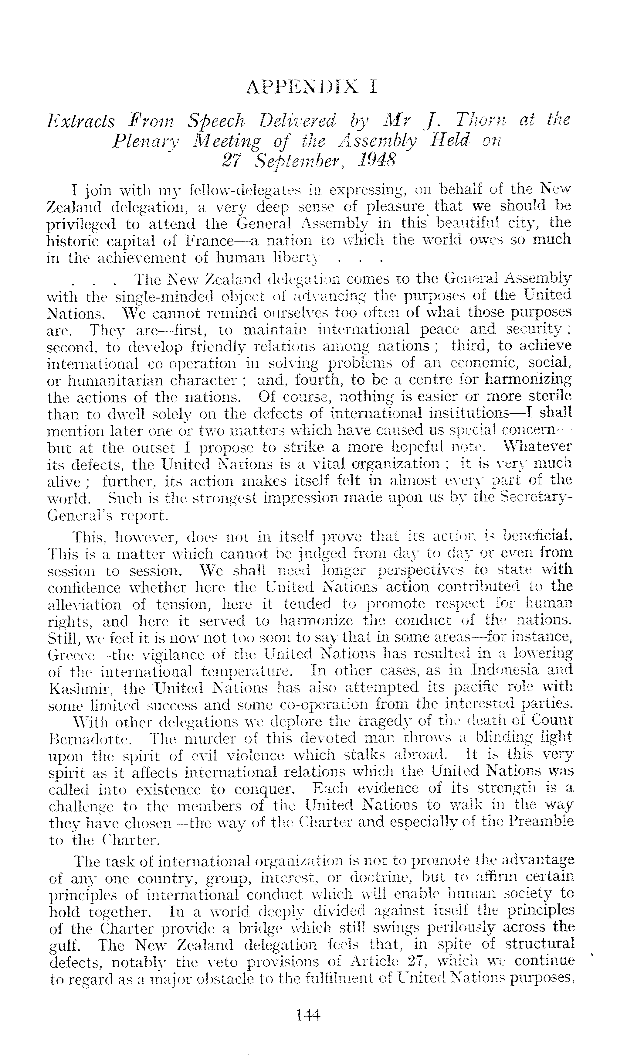 APPENDIX I Extracts From Speech Delivered by Mr J. Thorn at the Plenary Meeting of the Assembly Held on 27 September, 1948 I join with my fellow-delegates in expressing, on behalf of the New Zealand delegation, a very deep sense of pleasure that we should be privileged to attend the General Assembly in this beautiful city, the historic capital of France —a nation to which the world owes so much in the achievement of human liberty . . . . . . The New Zealand delegation comes to the General Assembly with the single-minded object of advancing the purposes of the United Nations. We cannot remind ourselves too often of what those purposes are. They are —first, to maintain international peace and security ; second, to develop friendly relations among nations ; third, to achieve international co-operation in solving problems of an economic, social, or humanitarian character ; and, fourth, to be a centre for harmonizing the actions of the nations. Of course, nothing is easier or more sterile than to dwell solely on the defects of international institutions —I shall mention later one or two matters which have caused us special concern — but at the outset I propose to strike a more hopeful note. Whatever its defects, the United Nations is a vital organization ; it is very much alive ; further, its action makes itself felt in almost every part of the world. Such is the strongest impression made upon us by the SecretaryGeneral's report. This, however, does not in itself prove that its action is beneficial. This is a matter which cannot be judged from day to day or even from session to session. We shall need longer perspectives to state with confidence whether here the United Nations action contributed to the alleviation of tension, here it tended to promote respect for human rights, and here it served to harmonize the conduct of the nations. Still, we feel it is now not too soon to say that in some areas —for instance, Greece —the vigilance of the United Nations has resulted in a lowering of the international temperature. In other cases, as in Indonesia and Kashmir, the United Nations has also attempted its pacific role with some limited success and some co-operation from the interested parties. With other delegations we deplore the tragedy of the death of Count Bernadotte. The murder of this devoted man throws a blinding light upon the spirit of evil violence which stalks abroad. It is this very spirit as it affects international relations which the United Nations Was called into existence to conquer. Each evidence of its strength is a challenge to the. members of the United Nations to walk in the way they have chosen —the way of the Charter and especially of the Preamble to the Charter. The task of international organization is not to promote the advantage of any one country, group, interest, or doctrine, but to affirm certain principles of international conduct which will enable human society to hold together. In a world deeply divided against itself the principles of the Charter provide a bridge which still swings perilously across the gulf. The New Zealand delegation feels that, in spite. of structural defects, notably the veto provisions of Article 27, which we continue to regard as a major obstacle to the fulfilment of United Nations purposes,