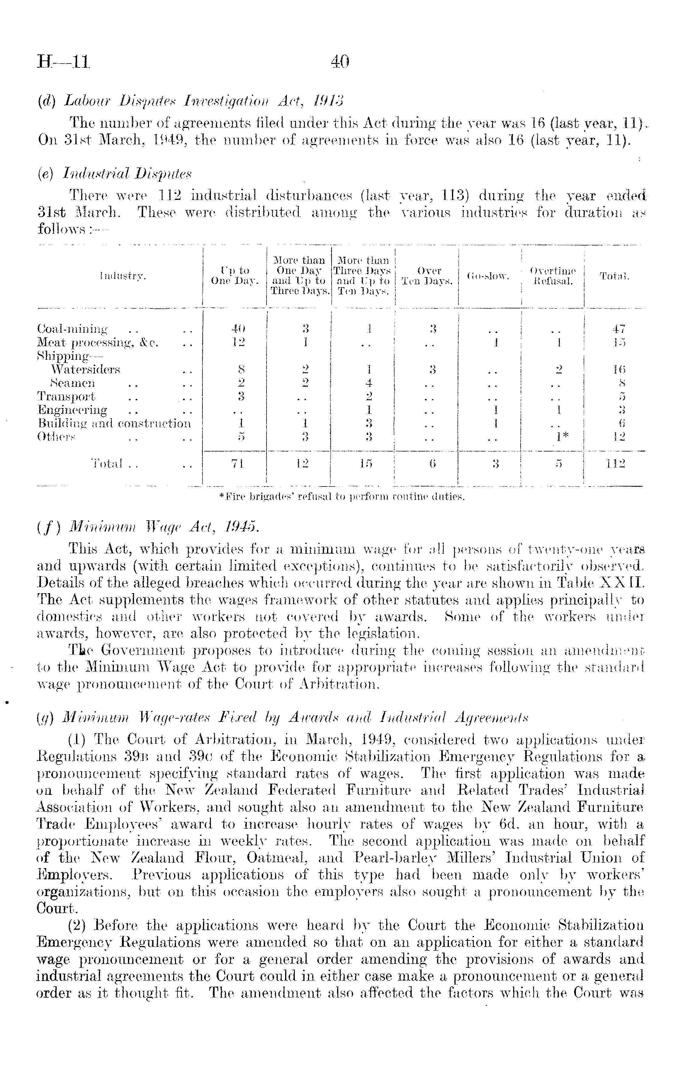 (/) Minimum Wage Act, 1945. This Act, which provides for a minimum wage for all persons of twenty-one years and upwards (with certain limited exceptions), continues to be satisfactorily observed. Details of the alleged breaches which occurred during the year are shown in Table XXII. The Act supplements the wages framework of other statutes and applies principally to domestics and other workers not covered by awards. Some of the workers under awards, however, are also protected by the legislation. The Government proposes to introduce during the coming session an amendment to the Minimum Wage Act to provide for appropriate increases following the standard wage pronouncement of the Court of Arbitration. (g) Minimum, Wage-rates Fixed by Awards and Industrial Agreements (1) The Court of Arbitration, in March, 1949, considered two applications under Regulations 39b and 39c of the Economic Stabilization Emergency Regulations for a pronouncement specifying standard rates of wages. The first application was made on behalf of the New Zealand Federated Furniture and Related Trades' Industrial Association of Workers, and sought also an amendment to the New Zealand Furniture Trade Employees' award to increase hourly rates of wages by 6d. an hour, with a proportionate increase in weekly rates. The second application was made on behalf of the New Zealand Flour, Oatmeal, and Pearl-barley Millers' Industrial Union of Employers. Previous applications of this type had been made only by workers' organizations, but on this occasion the employers also sought a pronouncement by the Court. (2) Before the applications were heard by the Court the Economic Stabilization Emergency Regulations were amended so that on an application for either a standard wage pronouncement or for a general order amending the provisions of awards and industrial agreements the Court could in either case make a pronouncement or a general order as it thought fit. The amendment also affected the factors which the Court was