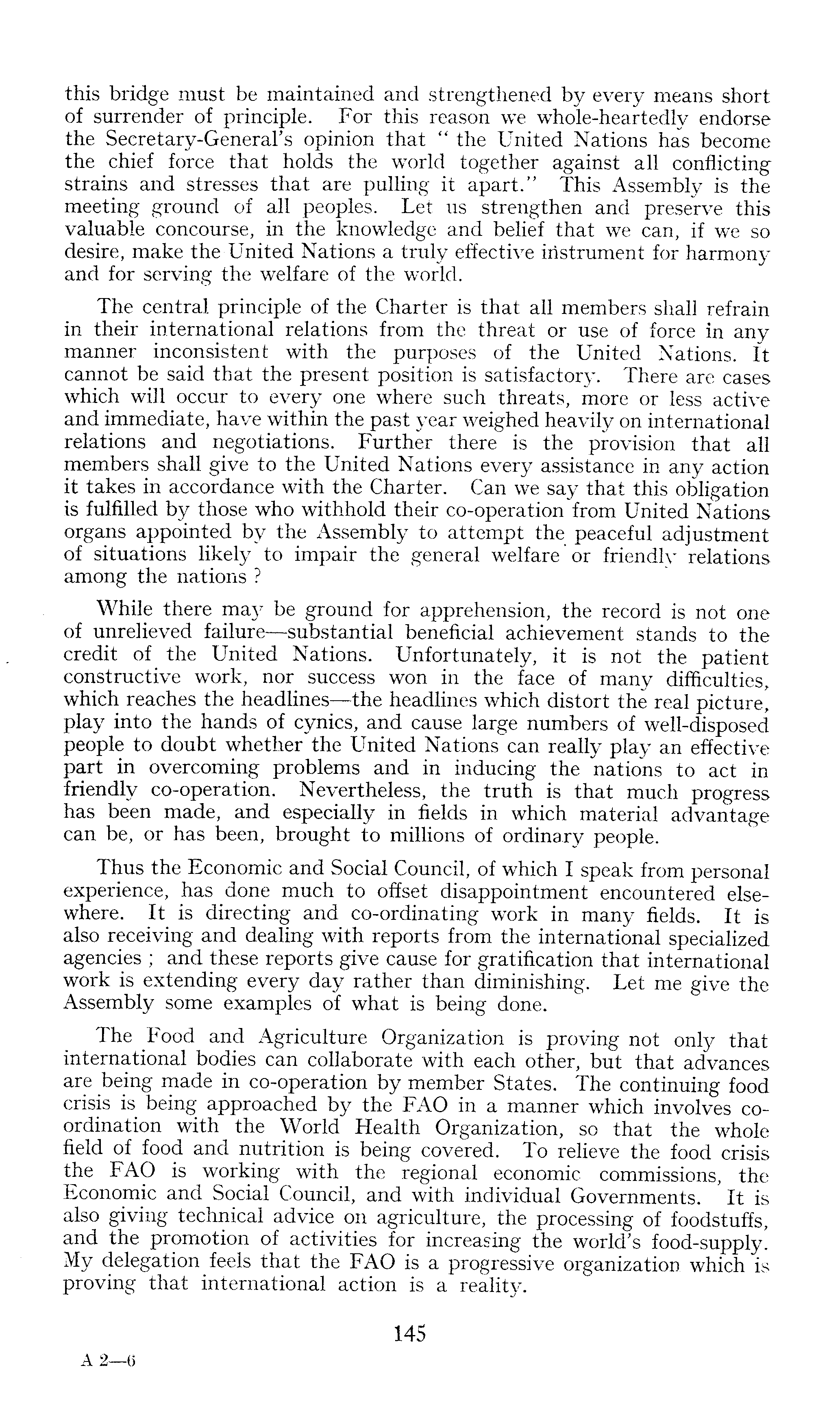 this bridge must be maintained and strengthened by every means short of surrender of principle. For this reason we whole-heartedly endorse the Secretary-General's opinion that " the United Nations has become the chief force that holds the world together against all conflicting strains and stresses that are pulling it apart." This Assembly is the meeting ground of all peoples. Let us strengthen and preserve this valuable concourse, in the knowledge and belief that we can, if we so desire, make the United Nations a truly effective instrument for harmony and for serving the welfare of the world. The central principle of the Charter is that all members shall refrain in their international relations from the threat or use of force in any manner inconsistent with the purposes of the United Nations. It cannot be said that the present position is satisfactory. There are cases which will occur to every one where such threats, more or less active and immediate, have within the past year weighed heavily on international relations and negotiations. Further there is the provision that all members shall give to the United Nations every assistance in any action it takes in accordance with the Charter. Can we say that this obligation is fulfilled by those who withhold their co-operation from United Nations organs appointed by the Assembly to attempt the peaceful adjustment of situations likely to impair the general welfare or friendlv relations among the nations ? While there may be ground for apprehension, the record is not one of unrelieved failure —substantial beneficial achievement stands to the credit of the United Nations. Unfortunately, it is not the patient constructive work, nor success won in the face of many difficulties, which reaches the headlines —the headlines which distort the real play into the hands of cynics, and cause large numbers of well-disposed people to doubt whether the United Nations can really play an effective part in overcoming problems and in inducing the nations to act in friendly co-operation. Nevertheless, the truth is that much progress has been made, and especially in fields in which material advantage can be, or has been, brought to millions of ordinary people. Thus the Economic and Social Council, of which I speak from personal experience, has done much to offset disappointment encountered elsewhere. It is directing and co-ordinating work in many fields. It is also receiving and dealing with reports from the international specialized agencies ; and these reports give cause for gratification that international work is extending every day rather than diminishing. Let me give the Assembly some examples of what is being done. The Food and Agriculture Organization is proving not only that international bodies can collaborate with each other, but that advances are being made in co-operation by member States. The continuing food crisis is being approached by the FAO in a manner which involves coordination with the World Health Organization, so that the whole field of food and nutrition is being covered. To relieve the food crisis the FAO is working with the regional economic commissions, the Economic and Social Council, and with individual Governments. It is also giving technical advice on agriculture, the processing of foodstuffs, and the promotion of activities for increasing the world's food-supply! My delegation feels that the FAO is a progressive organization which is proving that international action is a reality.