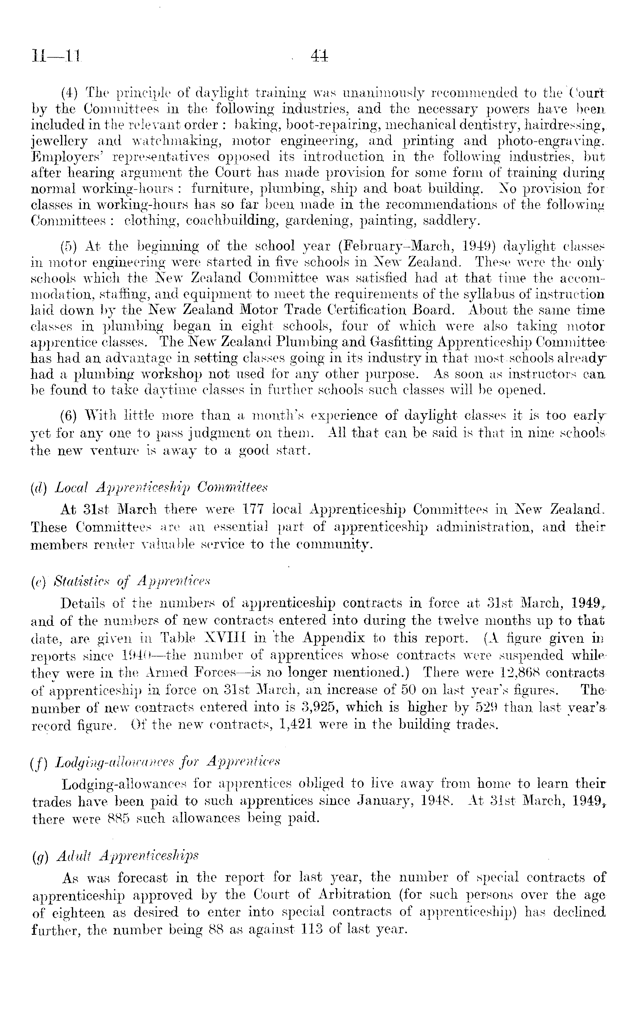 (4) Tlie principle of daylight training was unanimously recommended to the Courtby the Committees in the following industries, and the necessary powers have been included in the relevant order : baking, boot-repairing, mechanical dentistry, hairdressing,. jewellery and watchmaking, motor engineering, and printing and photo-engraving.. Employers' representatives opposed its introduction in the following industries, but after hearing argument the Court has made provision for some form of training during normal working-hours : furniture, plumbing, ship and boat building. No provision for classes in working-hours has so far been made in the recommendations of the following Committees : clothing, coachbuilding, gardening, painting, saddlery. (5) At the beginning of the school year (February-March, 1949) daylight classesin motor engineering were started in five schools in New Zealand. These were the only schools which the New Zealand Committee was satisfied had at that time the accommodation, staffing, and equipment to meet the requirements of the syllabus of instructionlaid down by the New Zealand Motor Trade Certification Board. About the same time classes in plumbing began in eight schools, four of which were also taking motor apprentice classes. The New Zealand Plumbing and Gasfitting Apprenticeship Committeehas had an advantage in setting classes going in its industry in that most , schools alreadyhad a plumbing workshop not used for any other purpose. As soon as instructors can be found to take daytime classes in further schools such classes will be opened. (6) With little more than a month's experience of daylight classes it is too early yet for any one to pass judgment on them. All that can be said is that in nine schoolsthe new venture is away to a good start.. (d) Local Apprenticeship Committees At 31st March there were 177 local Apprenticeship Committees in New Zealand. These Committees are an essential part of apprenticeship administration, and their members render valuable service *to the community. (e) Statistics of Apprentices Details of the numbers of apprenticeship contracts in force at 31st March, 1949,. and of the numbers of new contracts entered into during the twelve months up to that date, are given in Table XVIII in the Appendix to this report. (A figure given in reports since 1940 —the number of apprentices whose contracts were suspended while they were in the Armed Forces —is no longer mentioned.) There were 12,868 contractsof apprenticeship in force on 31st March, an increase of 50 on last year's figures. Thenumber of new contracts entered into is 3,925, which is higher by 529 than last year'srecord figure. Of the new contracts, 1,421 were in the building trades. (/) Lodging-allowances for Apprentices Lodging-allowances for apprentices obliged to live away from home to learn their trades have been paid to such apprentices since January, 1948. At 31st March, 1949, there were 885 such allowances being paid. (g) Adult Apprenticeships As was forecast in the report for last year, the number of special contracts of apprenticeship approved by the Court of Arbitration (for such persons over the age of eighteen as desired to enter into special contracts of apprenticeship) has declined further", the number being 88 as against 113 of last year.