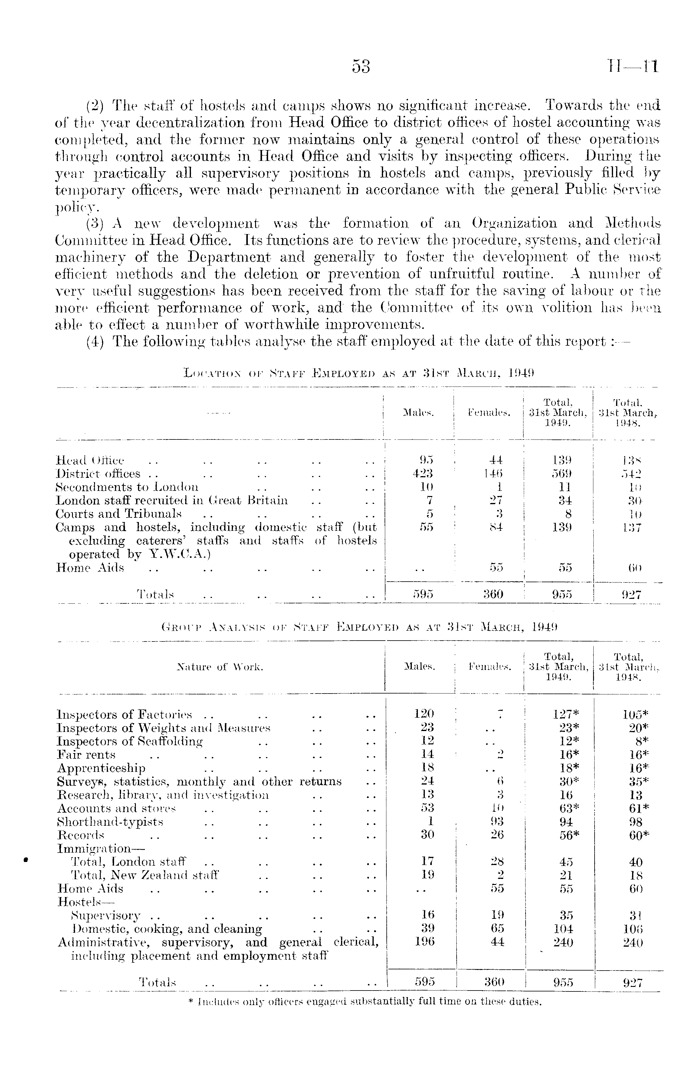 (2) Tlie staff of hostels and camps shows no significant increase. Towards the end of the year decentralization from Head Office to district offices of hostel accounting was completed, and the former now maintains only a general control of these operations through control accounts in Head Office and visits by inspecting officers. During the year practically all supervisory positions in hostels and camps, previously filled by temporary officers, were made permanent in accordance with the general Public Service policy. (3) A new development was the formation of an Organization and Methods Committee in Head Office. Its functions are to review the procedure, systems, and clerical machinery of the Department and generally to foster the development of the most efficient methods and the deletion or prevention of unfruitful routine. A number of very useful suggestions has been received from the staff for the saving of labour or the more efficient performance of work, and the Committee of its own volition has been able to effect a number of worthwhile improvements. (4) The following tables analyse the staff employed at the date of this report: —