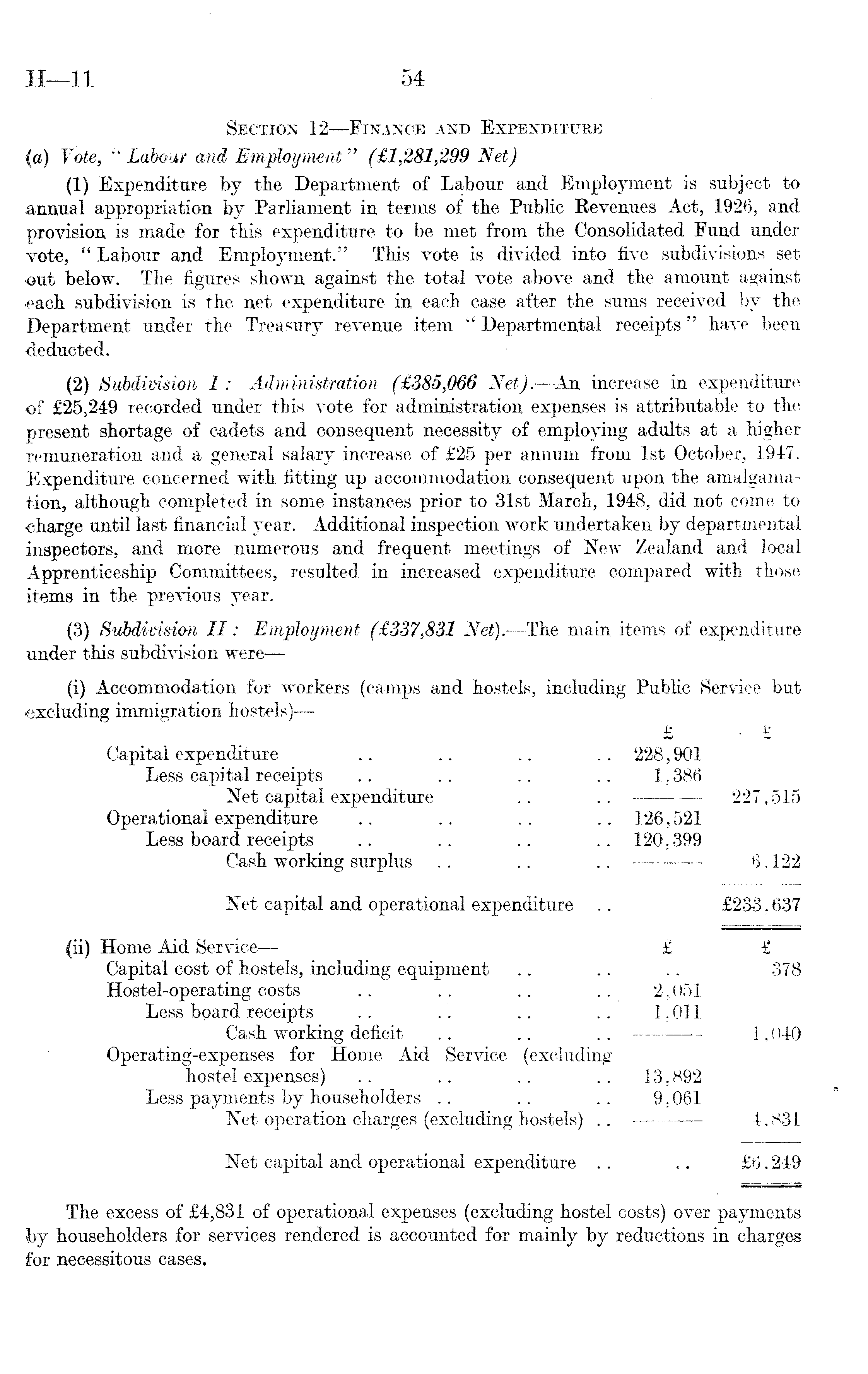 Section 12 —Finance and Expenditure (a) Vote, "Labour and Employment" (£1,281,299 Net) (1) Expenditure by the Department of Labour and Employment is subject to annual appropriation by Parliament in terms of the Public Revenues Act, 1926, and provision is made for this expenditure to be met from the Consolidated Fund under vote, " Labour and Employment." This vote is divided into five subdivisions set out below. The figures shown against the total vote above and the amount against each subdivision is the net expenditure in each case after the sums received by the Department under the Treasury revenue item " Departmental receipts" have been deducted. (2) Subdivision I: Administration (£3B-5,066 Net). —An increase in expenditure of £25,249 recorded under this vote for administration expenses is attributable to the present shortage of cadets and consequent necessity of employing adults at a higher remuneration and a general salary increase of £25 per annum from Ist October, 1947. Expenditure concerned with fitting up accommodation consequent upon the amalgamation, although completed in some instances prior to 31st March, 1948, did not come to charge until last financial year. Additional inspection work undertaken by departmental inspectors, and more numerous and frequent meetings of New Zealand and local Apprenticeship Committees, resulted in increased expenditure compared with those items in the previous year. (3) Subdivision II: Employment (£337,831 Net).- —The main items of expenditure under this subdivision were — (i) Accommodation for workers (camps and hostels, including Public Service but excluding immigration hostels) — £ • £ Capital expenditure .. .. .. .. 228,901 Less capital receipts .. .. .. .. 1,386 Net capital expenditure .. .. 227,515 Operational expenditure .. .. .. 126,521 Less board receipts .. .. .. .. 120,399 Cash working surplus .. .. .. 6,122 Net capital and operational expenditure .. £233,637 (ii) Home Aid Service — £ £ Capital cost of hostels, including equipment .. .. .. 378 Hostel-operating costs .. .. .. .. 2,051 • Less board receipts .. . '. .. .. 1,011 Cash working deficit .. .. .. 1,040 Operating-expenses for Home Aid Service (excluding hostel expenses) .. .. .. .. 13,892 Less payments by householders .. .. .. 9,061 Net operation charges (excluding hostels) .. 4,831 Net capital and operational expenditure .. .. £6,249 The excess of £4,831 of operational expenses (excluding hostel costs) over payments by householders for services rendered is accounted for mainly by reductions in charges for necessitous cases.