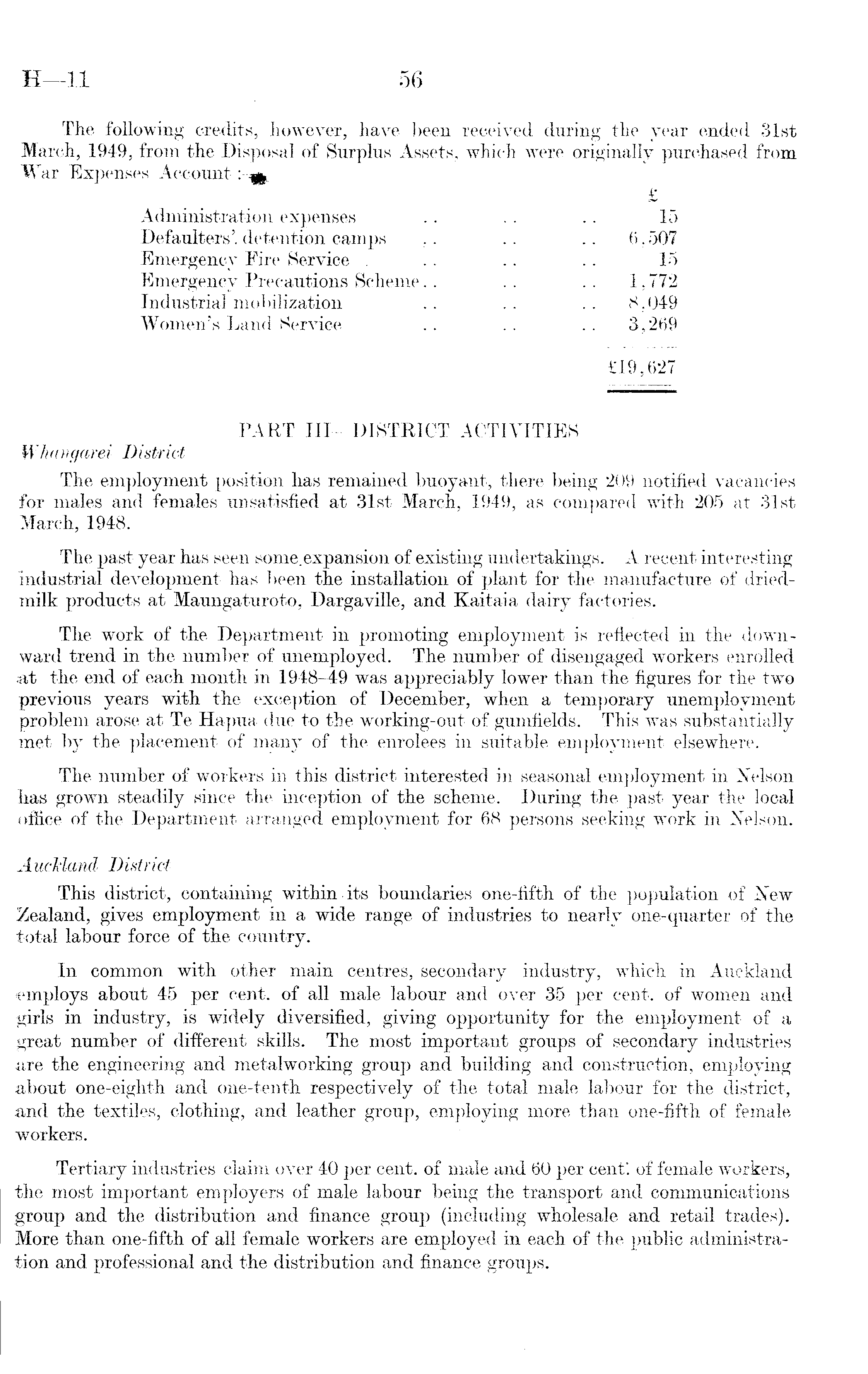 The following credits, however, have been received during the year ended 31st March, 1949, from the Disposal of Surplus Assets, which were originallv purchased from r ar Expenses Account: £ Administration expenses . . . . . . 15 Defaulters', detention camps .. .. .. 6,507 Emergency Fire Service . . . .. .. 15 Emergency Precautions Scheme.. .. .. 1,772 Industrial mobilization .. .. .. 8,049 Women's Land Service .. . . .. 3,269 £19,627 PART lII—DISTRICT ACTIVITIES Whangarei District The employment position has remained buoyant, there being 209 notified vacancies for males and females unsatisfied at 31st March, 1949, as compared with 205 at 31st March, 1948. The past year has seen some.expansion of existing undertakings. • A recent interesting industrial development has been the installation of plant for the manufacture of driedmilk products at Maungaturoto, Dargaville, and Kaitaia dairy factories. The work of the Department in promoting employment is reflected in the downward trend in the number of unemployed. The number of disengaged workers enrolled ■at the end of each month in 1948-49 was appreciably lower than the figures for the two previous years with the exception of December, when a temporary unemployment problem arose at Te Hapua due to the working-out of gumfields. This was substantially met by the placement of man}" of the enrolees in suitable employment elsewhere. The number of workers in this district interested in seasonal employment in Nelson has grown steadily since the inception of the scheme. During the past year the local office of the Department arranged employment for 68 persons seeking work in Nelson. Auckland District This district, containing within its boundaries one-fifth of the population of New Zealand, gives employment in a wide range of industries to nearly one-quarter of the total labour force of the country. In common with other main centres, secondary industry, which in Auckland employs about 45 per cent, of all male labour and over 35 per cent, of women and girls in industry, is widely diversified, giving opportunity for the employment of a great number of different skills. The most important groups of secondary industries are the engineering and metal working group and building and construction, employing about one-eighth and one-tenth respectively of the total male labour for the district, and the textiles, clothing, and leather group, employing more than one-fifth of female workers. Tertiary industries claim over 40 per cent, of male and 60 per cent', of female workers, the most important employers of male labour being the transport and communications group and the distribution and finance group (including wholesale and retail trades). More than one-fifth of all female workers are employed in each of the public administration and professional and the distribution and finance groups.
