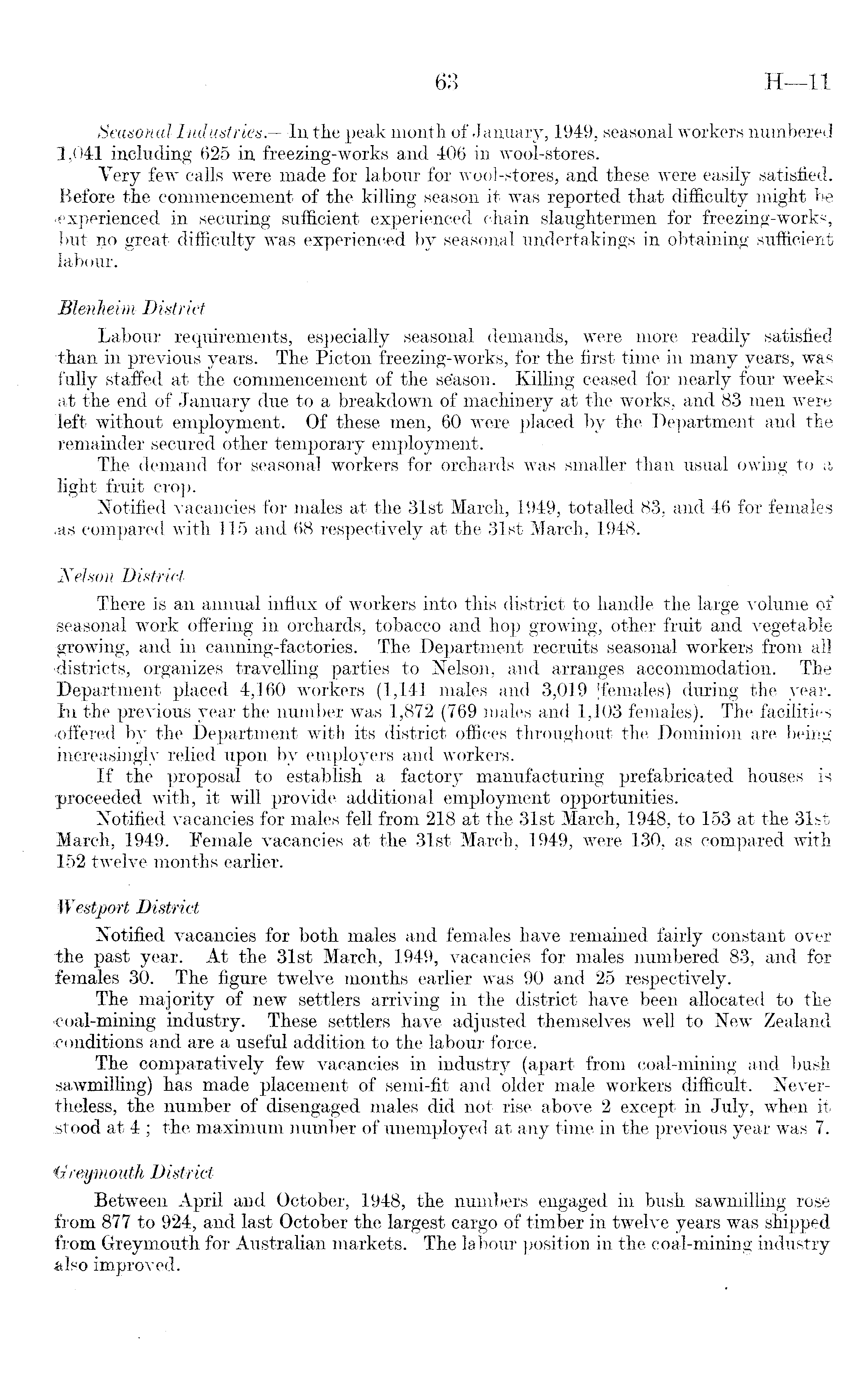 Seasonal Industries. —In the peak month, of January, 1949, seasonal workers numbered 1,041 including 625 in freezing-works and 406 in wool-stores. Very few calls were made for labour for wool-stores, and these were easily satisfied. Before the commencement of the killing season it was reported that difficulty might be •experienced in securing sufficient experienced chain slaughtermen for freezing-works, but no great difficulty was experienced by seasonal undertakings in obtaining sufficient labour. Blenheim District Labour requirements, especially seasonal demands, were more readily satisfied than in previous years. The Picton freezing-works, for the first time in many years, was fully staffed at the commencement of the se'ason. Killing ceased for nearly four weeks at the end of January due to a breakdown of machinery at the works, and 83 men were left without employment. Of these men, 60 were placed by the Department and the remainder secured other temporary employment. The demand for seasonal workers for orchards was smaller than usual owing to a light fruit crop. Notified vacancies for males at the 31st March, 1949, totalled 83, and 46 for females .as compared with 115 and 68 respectively at the 31st March, 1948. Nelson District There is an annual influx of workers into this district to handle the large volume of seasonal work offering in orchards, tobacco and hop growing, other fruit and vegetable growing, and in canning-factories. The Department recruits seasonal workers from all organizes travelling parties to Nelson, and arranges accommodation. The Department placed 4,160 workers (1,141 males and 3,019 [females) during the year. In the previous year the number was 1,872 (769 males and 1,103 females). The facilities •offered by the Department with its district offices throughout the Dominion are being increasingly relied upon by employers and workers. If the proposal to establish a factory manufacturing prefabricated houses is proceeded with, it will provide additional employment opportunities. Notified vacancies for males fell from 218 at the 31st March, 1948, to 153 at the 31st March, 1949. Female vacancies at the 31st March, 1949, were 130, as compared with 152 twelve months earlier. Westport District Notified vacancies for both males and females have remained fairly constant over the past year. At the 31st March, 1949, vacancies for males numbered 83, and for females 30. The figure twelve months earlier was 90 and 25 respectively. The majority of new settlers arriving in the district have been allocated to the •coal-mining industry. These settlers have adjusted themselves well to New Zealand •conditions and are a useful addition to the labour force. The comparatively few vacancies in industry (apart from coal-mining and bush sawmilling) has made placement of semi-fit and older male workers difficult. Nevertheless, the number of disengaged males did not rise above 2 except in July, when it stood at 4 ; the maximum number of unemployed at any time in the previous year was 7. 'Greymouth District Between April and October, 1948, the numbers engaged in bush sawmilling rose from 877 to 924, and last October the largest cargo of timber in twelve years was shipped from Greymouth for Australian markets. The labour position in the coal-mining industry also improved.