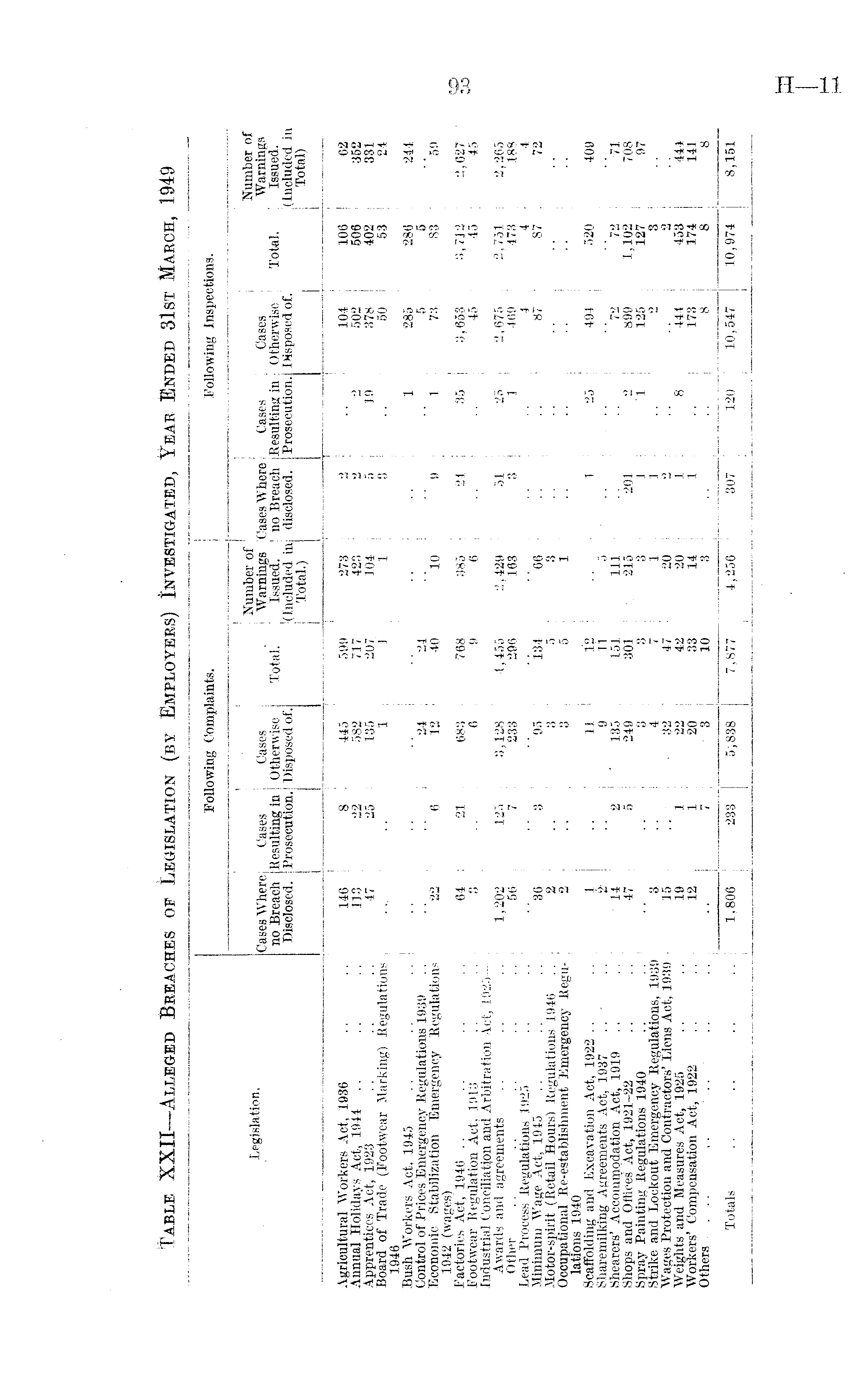 Table XXII— Alleged Breaches of Legislation (by Employers) Investigated, Year Ended 31st March, 1949