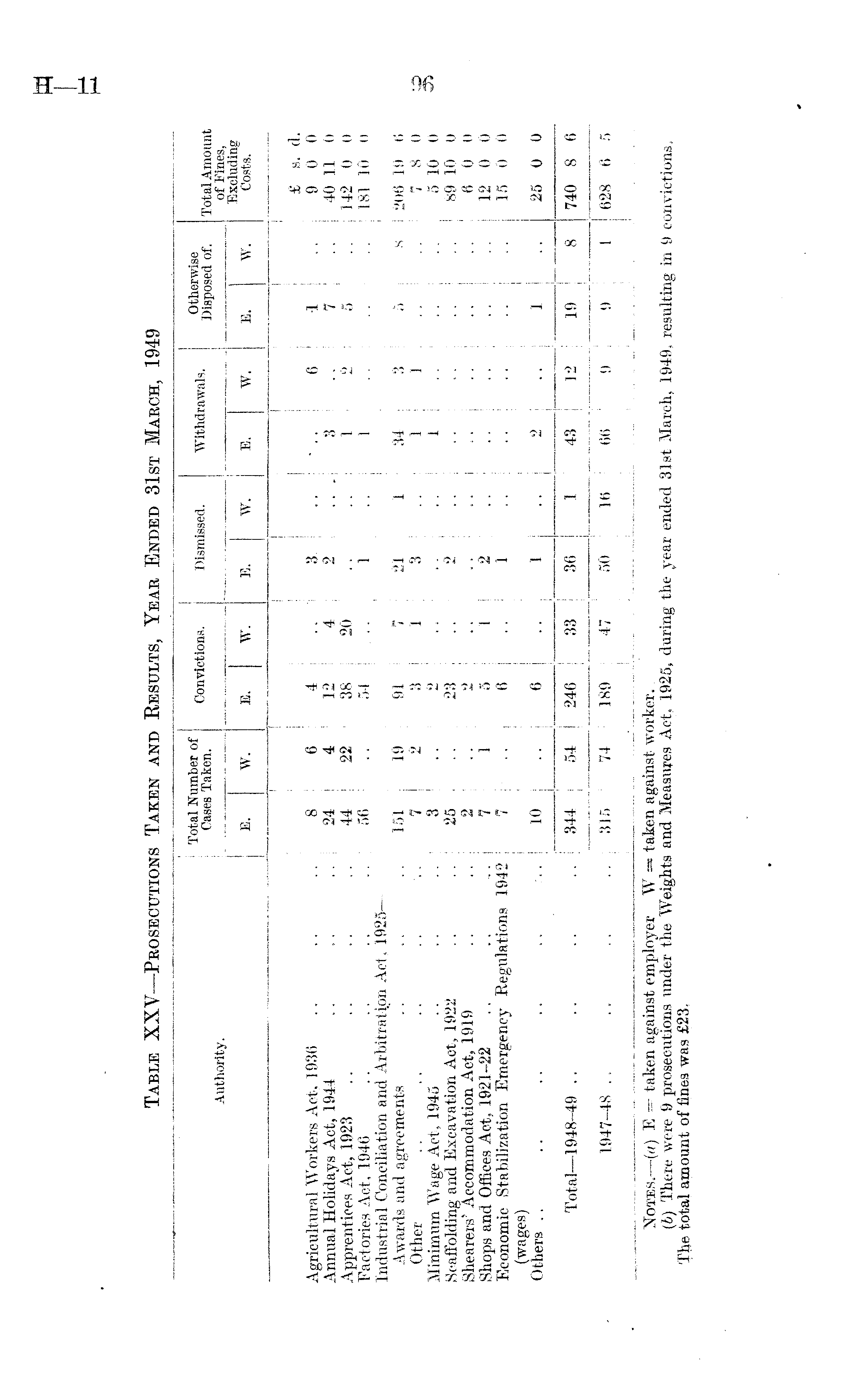 Notes.—(a) E = taken against employer W = taken against worker. (6) There were 9 prosecutions under the Weights and Measures Act, 1925, during the year ended 31st March, 1949, resulting in 9 convictions, The total amount of fines was £23,