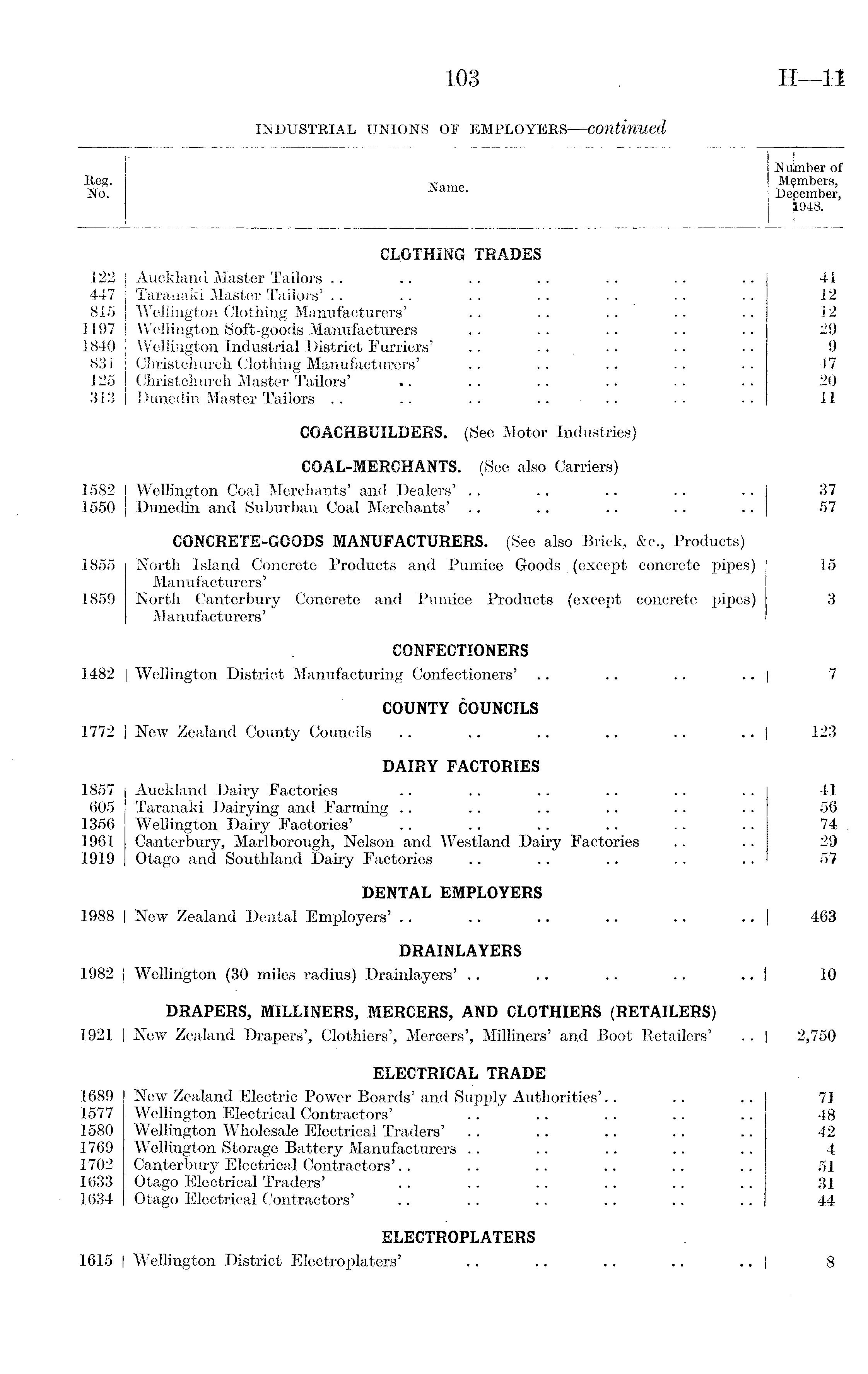 Reg. No. Name. Nuimber of Members, Deperaber, 1948. CLOTHING TRADES 122 Auckland Master Tailors 41 447 Taranaki Master Tailors' 12 815 Wellington Clothing Manufacturers' 12 1197 Wellington Soft-goods Manufacturers 29 1840 Wellington Industrial District Furriers' .. 9 831 Christchurch Clothing Manufacturers' 47 125 Christchurch Master Tailors' .. 20 313 Dunedin Master Tailors .. .. .. .. 11 COACHBUILDERS. (See Motor Industries) COAL-MERCHANTS. (See also Carriers) 1582 Wellington Coal Merchants' and Dealers' .. . • .. .. 1 37 1550 Dunedin and Suburban Coal Merchants' .. .. .. .. 57 CONCRETE-GOODS MANUFACTURERS. (See also Brick, &c., Products) 1855 North Island Concrete Products and Pumice Goods (except concrete pipes) 15 Manufacturers' 1859 North Canterbury Concrete and Pumice Products (except concrete pipes) 3 Manufacturers' CONFECTIONERS 1482 | Wellington District Manufacturing Confectioners' 1 7 COUNTY COUNCILS 1772 | New Zealand County Councils .. .. .. .. .. | 123 DAIRY FACTORIES 1857 Auckland Dairy Factories 41 605 Taranaki Dairying and Farming 56 1356 Wellington Dairy Factories' 74 1961 Canterbury, Marlborough, Nelson and Westland Dairy Factories 29 1919 Otago and Southland Dairy Factories 57 DENTAL EMPLOYERS 1988 | I New Zealand Dental Employers' | 463 DRAINLAYERS 1982 j Wellington (30 miles radius) Drainlayers' .. .. .. .. .. I 10 DRAPERS, MILLINERS, MERCERS, AND CLOTHIERS (RETAILERS) 1921 | New Zealand Drapers', Clothiers', Mercers', Milliners' and Boot Retailers' 1 2,750 ELECTRICAL TRADE 1689 New Zealand Electric Power Boards' and Supply Authorities' 71 1577 Wellington Electrical Contractors' 48 1580 Wellington Wholesale Electrical Traders' 42 1769 Wellington Storage Battery Manufacturers 4 1702 Canterbury Electrical Contractors'.. 51 1633 Otago Electrical Traders' .. .. 31 1634 Otago Electrical Contractors' 44 ELECTROPLATERS 1615 | Wellington District Electroplaters' .. .. .. .. .. | 8