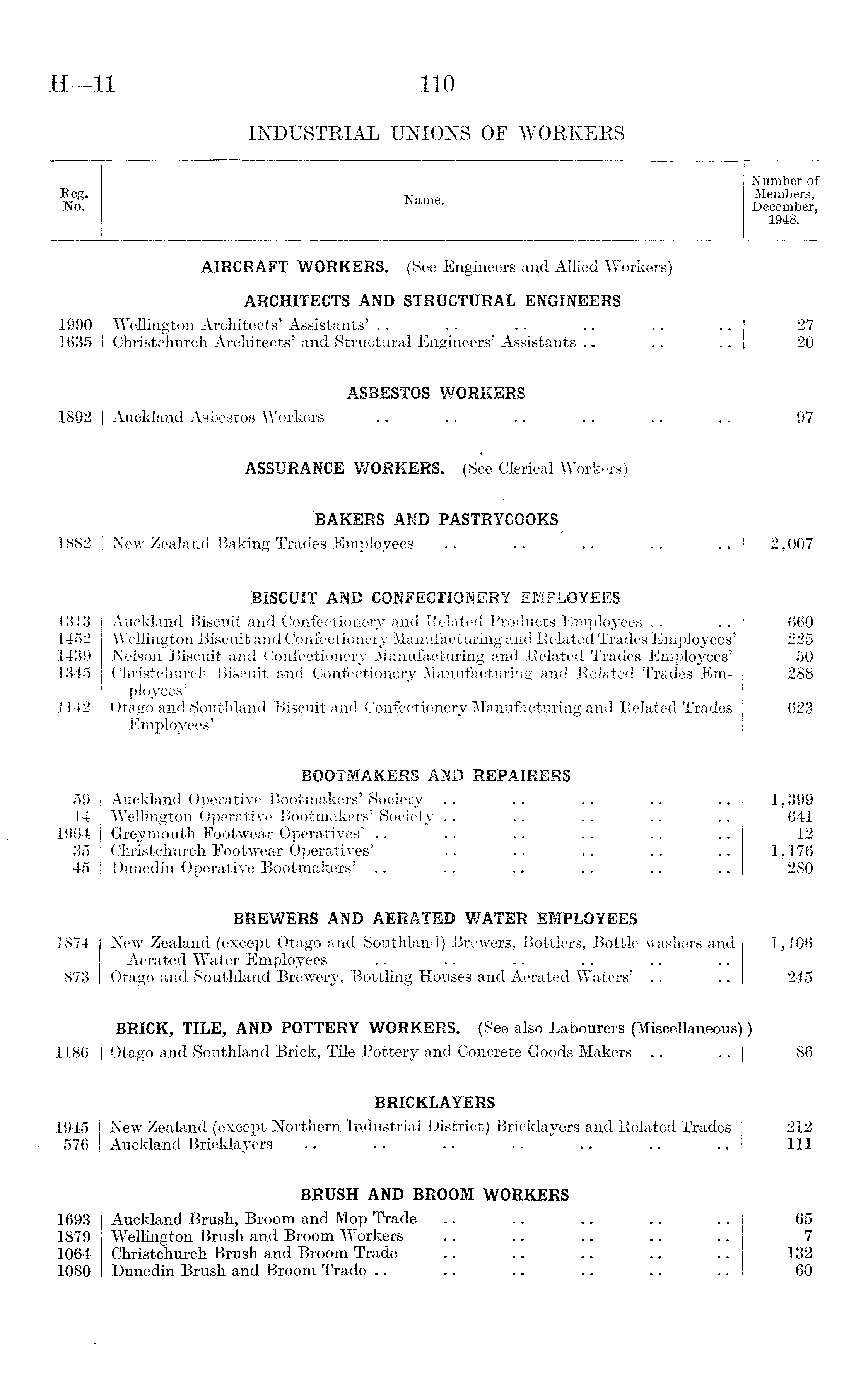 Reg. No. Name. Number of Members, December, 1948. AIRCRAFT WORKERS. (See Engineers and Allied Workers) ARCHITECTS AND STRUCTURAL ENGINEERS 1990 Wellington Architects' Assistants' 1 27 1635 Christchurch Architects' and Structural Engineers' Assistants I 20 ASBESTOS WORKERS 1892 Auckland Asbestos Workers I 97 ASSURANCE WORKERS. (See Clerical Workers) BAKERS AND PASTRYCOOKS 1882 New Zealand Baking Trades Employees 1 2,007 BISCUIT AND CONFECTIONERY EMPLOYEES 1313 Auckland Biscuit and Confectionery and Belated Products Employees 660 1452 Wellington Biscuit and Confectionery Manufacturing and Related Trades Employees' 225 1439 Nelson Biscuit and Confectionery Manufacturing and Related Trades Employees' 50 1345 Christchurch Biscuit and Confectionery Manufacturing and Related Trades Em288 ployees' 1142 Otago and Southland Biscuit and Confectionery Manufacturing and Related Trades 623 Employees' BOOTMAKERS AND REPAIRERS 59 Auckland Operative Bootmakers' Society 1,399 14 Wellington Operative Bootmakers' Society 641 1964 Greymouth Footwear Operatives' 12 35 Christchurch Footwear Operatives' 1,176 45 Dunedin Operative Bootmakers' .. .. 280 BREWERS AND AERATED WATER EMPLOYEES 1874 New Zealand (except Otago and Southland) Brewers, Bottlers, Bottle-washers and 1,106 Aerated Water Employees 873 Otago and Southland Brewery, Bottling Houses and Aerated Waters' 245 BRICK, TILE, AND POTTERY WORKERS. (See also Labourers (Miscellaneous) ) 1186 | Otago and Southland Brick, Tile Pottery and Concrete Goods Makers .. .. | | 86 BRICKLAYERS 1945 1 New Zealand (except Northern Industrial District) Bricklayers and Related Trades 1 212 576 1 Auckland Bricklayers .. .. .. .. .. .. .. 1 111 BRUSH AND BROOM WORKERS 1693 Auckland Brush, Broom and Mop Trade 65 1879 Wellington Brush and Broom Workers 7 1064 Christchurch Brush and Broom Trade 132 1080 Dunedin Brush and Broom Trade 60