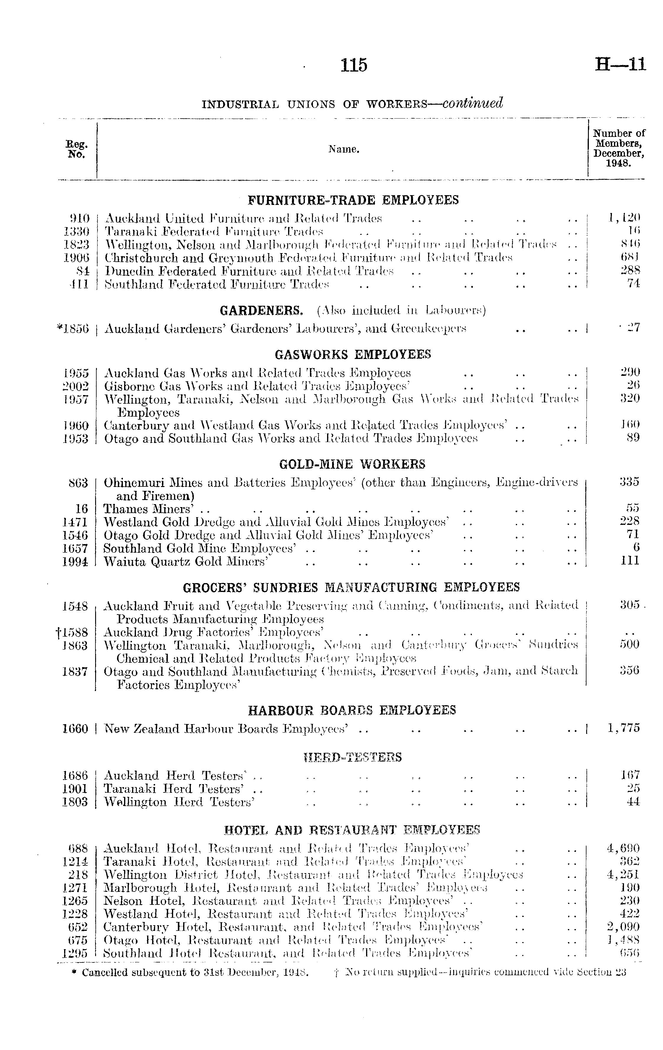 1 9g 1 Name. Number of Members, December, 1948. FURNITURE-TRADE EMPLOYEES 910 Auckland United Furniture and Related Trades 1,120 1330 Taranaki Federated Furniture Trades 16 1823 Wellington, Nelson and Marlborough Federated Furniture arid Related Trades .. 846 1906 Christchurch and Greyniouth Federated Furniture and Related Trades 681 84 Dunedin Federated Furniture and Related Trades 288 411 Southland Federated Furniture Trades 74 GARDENERS. (Also included in Labourers) *1856 Auckland Gardeners' Gardeners' Labourers', and Greenkeepers | ■ 27 GASWORKS EMPLOYEES 1955 Auckland Gas Works and Related Trades Employees 290 2002 Gisborne Gas Works and Related Trades Employees' 26 1957 Wellington, Taranaki, Nelson and Marlborough Gas Works and Related Trades 320 Employees 1960 Canterbury and Westland Gas Works and Related Trades Employees' 160 1953 Otago and Southland Gas Works and Related Trades Employees .. 89 GOLD-MINE WORKERS 863 Ohinemuri Mines and Batteries Employees' (other than Engineers, Engine-drivers 335 and Firemen) 16 Thames Miners' 55 1471 Westland Gold Dredge and Alluvial Gold Mines Employees' 228 1546 Otago Gold Dredge and Alluvial Gold Mines' Employees' 71 1657 Southland Gold Mine Employees' .. .. .. .. 6 1994 Waiuta Quartz Gold Miners' 111 GROCERS' SUNDRIES MANUFACTURING EMPLOYEES 1548 Auckland Fruit and Vegetable Preserving and Canning, Condiments, and Related 305 . Products Manufacturing Employees fl588 Auckland Drug Factories' Employees' 1863 Wellington Taranaki, Marlborough, Nelson and Canterbury Grocers' Sundries 500 Chemical and Related Products Factory Employees 1837 Otago and Southland Manufacturing Chemists, Preserved Foods, Jam, and Starch 356 Factories Employees' HARBOUR BOARDS EMPLOYEES 1660 | I New Zealand Harbour Boards Employees' .. .. .. .. | 1,775 HERD-TESTERS 1686 Auckland Herd Testers' 167 1901 Taranaki Herd Testers' 25 1803 Wellington Herd Testers' .. .. .. .. .. 44 HOTEL AND RESTAURANT EMPLOYEES 688 Auckland Hotel, Restaurant and Related Trades Employees' 4,690 1214 Taranaki Hotel, Restaurant and Related Trades Employees' 362 218 Wellington District Hotel, Restaurant and Related Trades Employees 4,251 1271 Marlborough Hotel, Restaurant and Related Trades' Employees 190 1265 Nelson Hotel, Restaurant and Related Trades Employees' 230 1228 Westland Hotel, Restaurant and Related Trades Employees' 422 652 Canterbury Hotel, Restaurant, and Related Trades Employees' 2,090 675 Otago Hotel, Restaurant and Related Trades Employees' . . 1,488 1295 Southland Hotel Restaurant, and Related Trades Employees' 656 * Cancelled subsequent to 31st December, 1948. f No return supplied—inquiries commenced vide Section 23