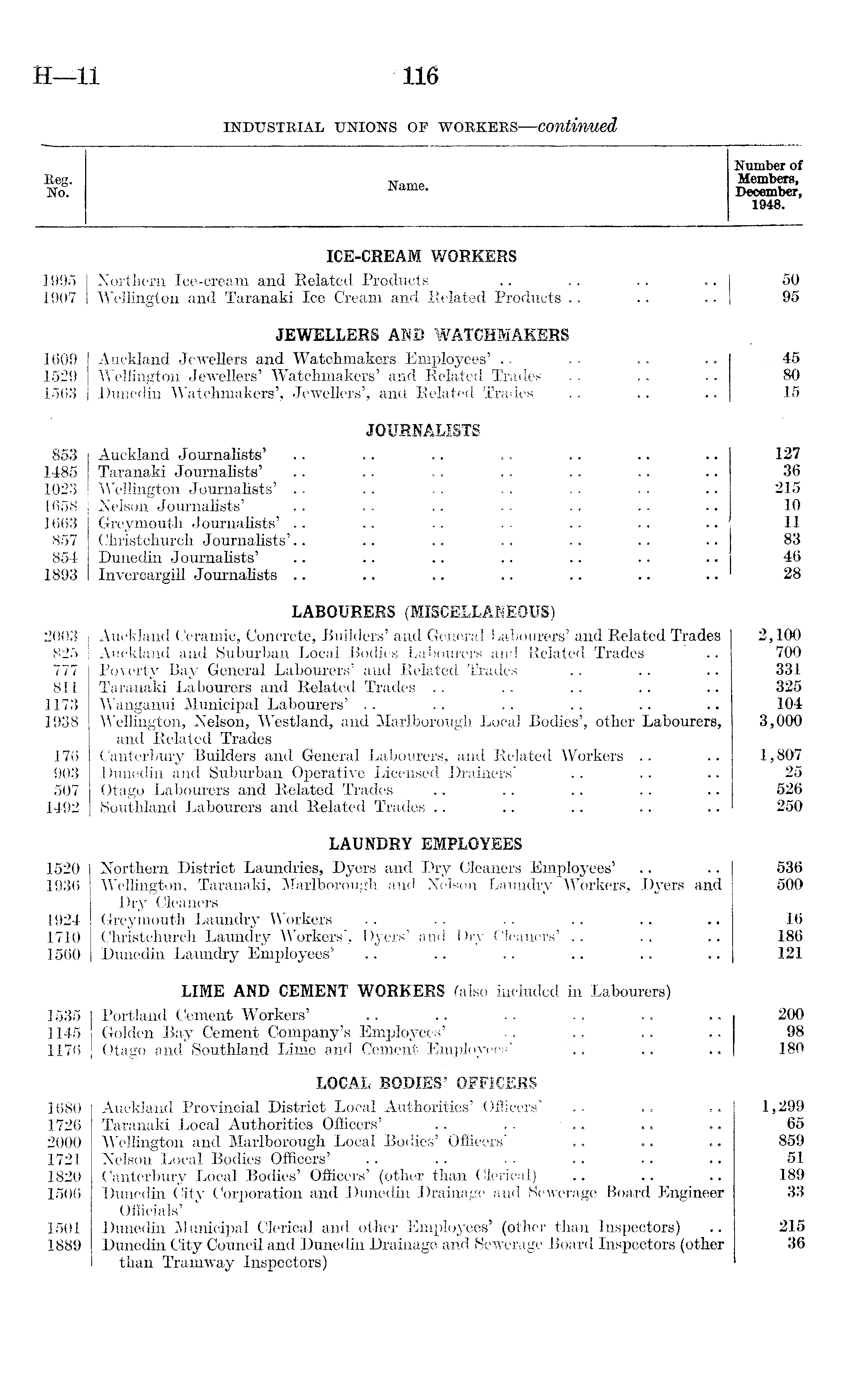 Beg. No. Name. Number of Members, December, 1948. ICE-CREAM WORKERS 1995 Northern Ice-cream and Related Products .. * .. .. .. 1 50 1907 Wellington and Taranaki Ice Cream and Related Products .. .. • • 1 95 JEWELLERS AND WATCHMAKERS 1609 Auckland Jewellers and Watchmakers Employees' 45 1529 Wellington Jewellers' Watchmakers' and Related Trades 80 1563 Dunedin Watchmakers', Jewellers', and Related Trades 15 JOURNALISTS 853 Auckland Journalists' 127 1485 Taranaki Journalists' .. .. .. .. 36 1023 Wellington Journalists' .. .. .. .. 215 1658 Nelson Journalists' 10 1663 Greymouth Journalists' 11 857 Christchurch Journalists' 83 854 Dunedin Journalists' 46 1893 Invercargill Journalists 28 LABOURERS (MISCELLANEOUS) 2003 Auckland Ceramic, Concrete, Builders' and General Labourers' and Related Trades 2,100 825 Auckland and Suburban Local Bodies Labourers and Related Trades 700 777 Poverty Bay General Labourers' and Related Trades 331 811 Taranaki Labourers and Related Trades 325 1173 Wanganui Municipal Labourers' 104 1938 Wellington, Nelson, Westland, and Marlborough Local Bodies', other Labourers, 3,000 and Related Trades 176 Canterbury Builders and General Labourers, and Related Workers 1,807 903 Dunedin and Suburban Operative Licensed Drainers' 25 507 Otago Labourers and Related Trades 526 1492 Southland Labourers and Related Trades 250 LAUNDRY EMPLOYEES 1520 Northern District Laundries, Dyers and Dry Cleaners Employees' 536 1936 Wellington, Taranaki, Marlborough and Nelson Laundry Workers, Dyers and 500 Dry Cleaners 1924 Greymouth Laundry Workers 16 1710 Christchurch Laundry Workers', Dyers' and Dry Cleaners' 186 1560 Dunedin Laundry Employees' 121 LIME AND CEMENT WORKERS (also included in Labourers) 1535 1 Portland Cement Workers' 200 1145 Golden Bay Cement Company's Employees' 98 1176 ] Otago and Southland Lime and Cement Employees' 180 LOCAL BODIES' OFFICERS 1680 Auckland Provincial District Local Authorities' Officers' 1,299 1726 Taranaki Local Authorities Officers' .. .. • .. 65 2000 Wellington and Marlborough Local Bodies' Officers' 859 1721 Nelson Local Bodies Officers' 51 1820 Canterbury Local Bodies' Officers' (other than Clerical) 189 1506 Dunedin City Corporation and. Dunedin Drainage and Sewerage Board Engineer 33 Officials' 1501 Dunedin Municipal Clerical and other Employees' (other than Inspectors) 215 1889 Dunedin City Council and Dunedin Drainage and Sewerage Board Inspectors (other 36 than Tramway Inspectors)