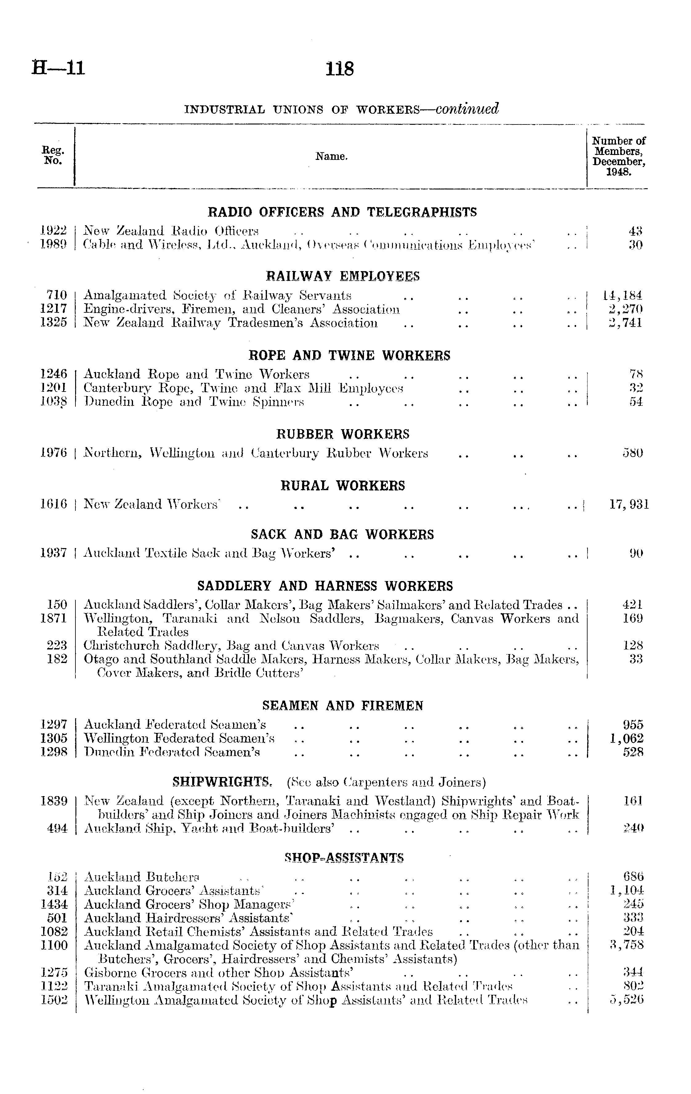 Beg. No. Name. Number of Members, December, 1948. RADIO OFFICERS AND TELEGRAPHISTS 1922 1989 New Zealand Radio Officers . . .. .. .. .. .. 1 Cable and Wireless, Ltd., Auckland, Overseas Communications Employees' .. 1 RAILWAY EMPLOYEES 43 30 710 1217 1325 Amalgamated Society of Railway Servants .. .. .. .. 1 Engine-drivers, Firemen, and Cleaners' Association .. .. New Zealand Railway Tradesmen's Association .. .. .. .. | ROPE AND TWINE WORKERS 14,184 2,270 2,741 1246 1201 1038 Auckland Rope and Twine Workers Canterbury Rope, Twine and Flax Mill Employees Dunedin Rope and Twine Spinners RUBBER WORKERS 78 32 54 1976 Northern, Wellington and Canterbury Rubber Workers RURAL WORKERS 580 1616 New Zealand Workers' .. .. .. .. .. ... .. j SACK AND BAG WORKERS 17,931 1937 Auckland Textile Sack and Bag Workers' .. .. .. .. .. I SADDLERY AND HARNESS WORKERS 90 150 1871 223 182 Auckland Saddlers', Collar Makers', Bag Makers' Sailmakers' and Related Trades .. Wellington, Taranaki and Nelson Saddlers, Bagmakers, Canvas Workers and Related Trades Christchurch Saddlery, Bag and Canvas Workers Otago and Southland Saddle Makers, Harness Makers, Collar Makers, Bag Makers, Cover Makers, and Bridle Cutters' SEAMEN AND FIREMEN 421 169 128 33 1297 1305 1298 Auckland Federated Seamen's Wellington Federated Seamen's Dunedin Federated Seamen's 955 1,062 528 SHIPWRIGHTS. (See also Carpenters and Joiners) 1839 494 New Zealand (except Northern, Taranaki and Westland) Shipwrights' and Boatbuilders' and Ship Joiners and Joiners Machinists engaged on Ship Repair Work Auckland Ship, Yacht and Boat-builders' .. SHOP-ASSISTANTS 161 240 152 314 1434 501 1082 1100 1275 1122 1502 Auckland Butchers Auckland Grocers' Assistants' Auckland Grocers' Shop Managers' Auckland Hairdressers' Assistants' Auckland Retail Chemists' Assistants and Related Trades Auckland Amalgamated Society of Shop Assistants and Related Trades (other than Butchers', Grocers', Hairdressers' and Chemists' Assistants) Gisborne Grocers and other Shop Assistants' Taranaki Amalgamated Society of Shop Assistants and Related Trades Wellington Amalgamated Society of Shop Assistants' and Related Trades 686 1,104 245 333 204 3,758 344 802 5,526