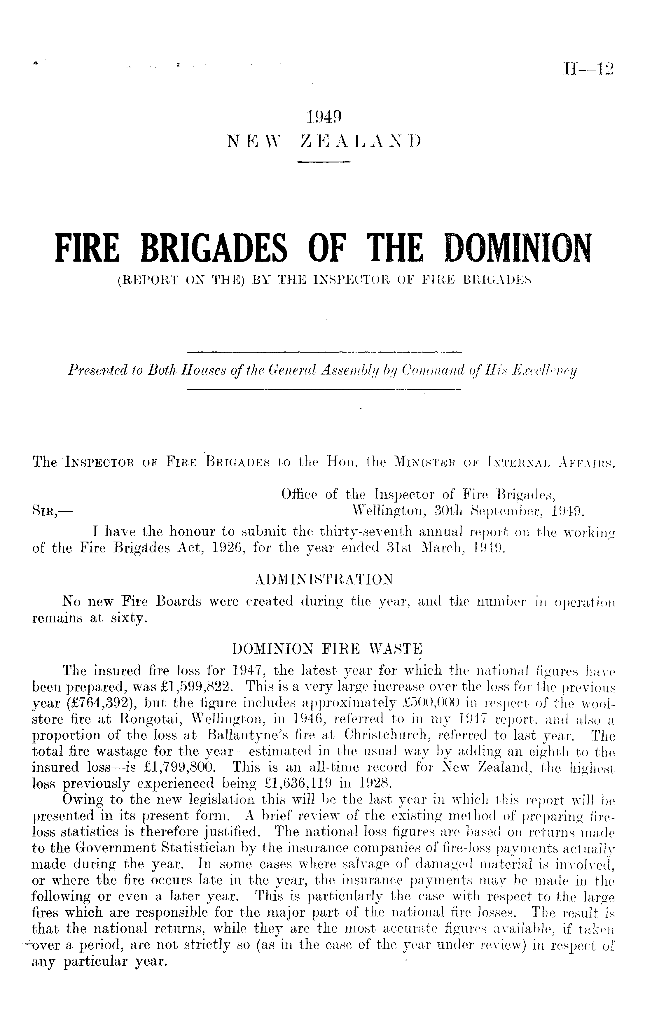 The 'lnspector of Fire Brigades to the Hon. the Minister of Internal Affairs. Office of the Inspector of Fire Brigades, Sir, — Wellington, 30th September, 1949. I have the honour to submit the thirty-seventh annual report on the working of the Fire Brigades Act, 1926, for the year ended 31st March, 1949. ADMINISTRATION No new Fire Boards were created during the year, and the number in operation remains at sixty. DOMINION FIRE WASTE The insured fire loss, for 1947, the latest year for which the national figures have been prepared, was £1,599,822. This is a very large increase over the loss for the previous year (£764,392), but the figure includes approximately £500,000 in respect of the woolstore fire at Rongotai, Wellington, in 1946, referred to in my 1947 report, and also a proportion of the loss at Ballantyne's fire at Christchurch, referred to last year. The total fire wastage for the year —estimated in the usual way by adding an eighth to the insured loss —is £1,799,800. This is an all-time record for New Zealand, the highest loss previously experienced being £1,636,119 in 1928. Owing to the new legislation this will be the last year in which this report will be presented in its present form. A brief review of the existing method of preparing fireloss statistics is therefore justified. The national loss figures are based on returns made to the Government Statistician by the insurance companies of fire-loss payments actually made during the year. In some cases where salvage of damaged material is involved, or where the fire occurs late in the year, the insurance payments may be made in the following or even a later year. This is particularly the case with respect to the large fires which are responsible for the major part of the national fire losses. The result is that the national returns, while they are the most accurate figures available, if taken a period, are not strictly so (as in the case of the year under review) in respect of any particular year.