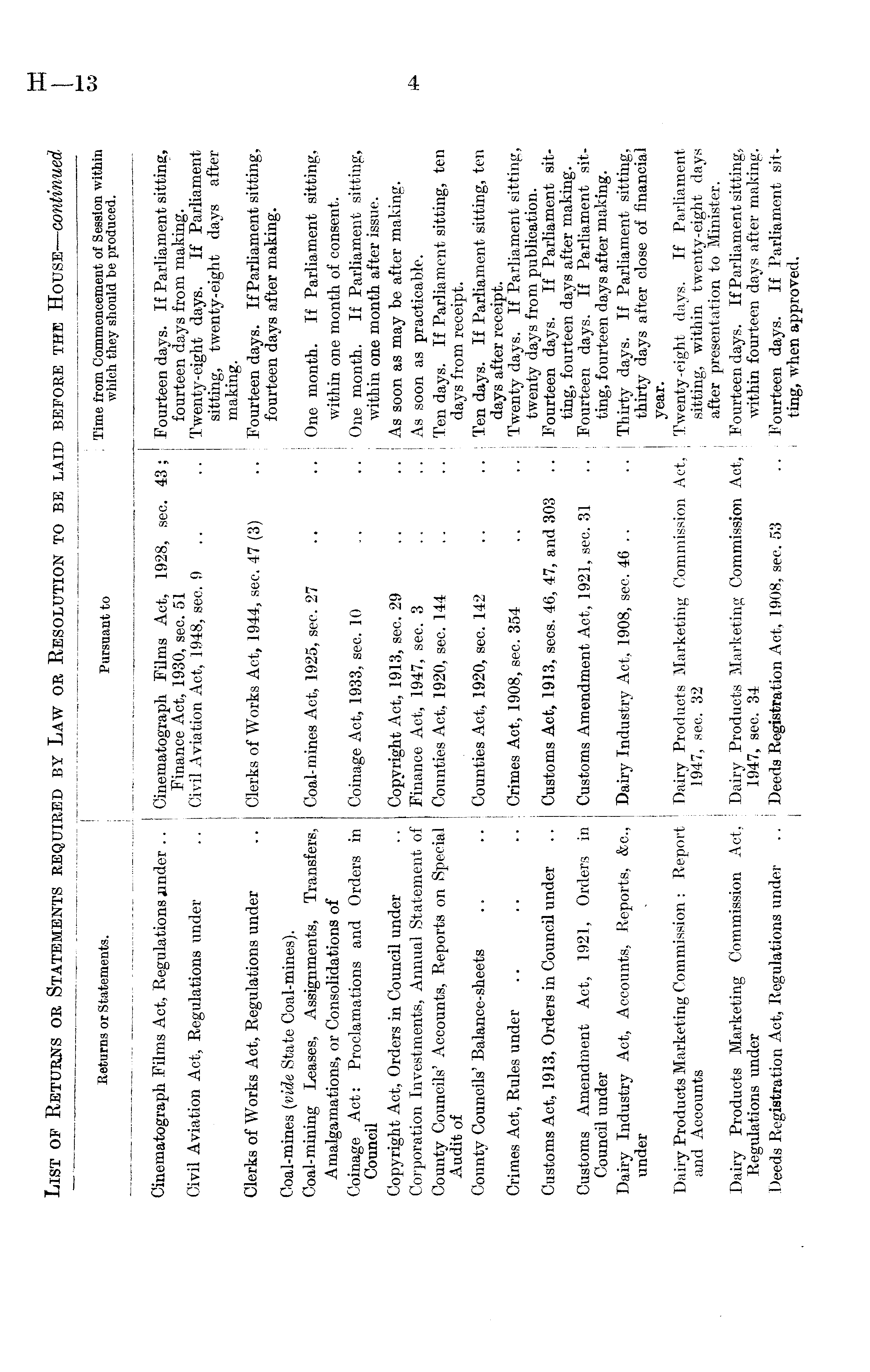 Returns or Statements. P ra a™tto ! "»• KHd be """° Cinematograph Films Act, Regulations jmder .. 1 Cinematograph Films Act, 1928, sec. 43 ; Fourteen days. If Parliament sitting, Finance Act, 1930, sec. 51 fourteen days from making. Civil Aviation Act, Regulations under .. Civil Aviation Act, 1948, sec. 9 .. Twenty-eight days. If Parliament sitting, twenty-eight days after making. Clerks of Works Act, Regulations under .. Clerks of Works Act, 1944, sec. 47 (3) .. Fourteen days. If Parliament sitting, fourteen days after making. Coal-mines (vide State Coal-mines). Coal-mining Leases, Assignments, Transfers, Coal-mines Act, 1925, sec. 27 .. .. j One month. If Parliament sitting, Amalgamations, or Consolidations of within one month of consent. Coinage Act: Proclamations and Orders in Coinage Act, 1933, sec. 10 .. .. j One month. If Parliament sitting, Council within one month after issue. Copyright Act, Orders in Council under .. Copyright Act, 1913, sec. 29 .. .. As soon as may be after making. Corporation Investments, Annual Statement of Finance Act, 1947, sec. 3 .. As soon as practicable. County Councils' Accounts, Reports on Special Counties Act, 1920, sec. 144 .. .. Ten days. If Parliament sitting, ten Audit of days from receipt. County Councils' Balance-sheets .. .. Counties Act, 1920, see. 142 .. .. Ten days. If Parliament sitting, ten days after receipt. Crimes Act, Rules under .. .. .. Crimes Act, 1908, sec. 354 .. .. Twenty days. If Parliament sitting, twenty days from publication. Customs Act, 1913, Orders in Council under .. Customs Act, 1913, sees. 46, 47, and 308 .. Fourteen days. If Parliament sitting, fourteen days after making. Customs Amendment Act, 1921, Orders in Customs Amendment Act, 1921, sec. 31 .. Fourteen days. If Parliament sitCouncil under ting, fourteen days after making. Dairy Industry Act, Accounts, Reports, &c., Dairy Industry Act, 1908, sec. 46 .. .. j Thirty days. If Parliament sitting, under . thirty days after close of financial | year. Dairy Products Marketing Commission: Report Dairy Products Marketing Commission Act, ! Twenty-eight days. If Parliament and Accounts 1947, sec. 32 sitting, within twenty-eight days 1 after presentation to Minister. Dairy Products Marketing Commission Act, Dairy Products Marketing Commission Act, j Fourteen days. If Parliament sitting, Regulations under 1947, sec. 34 within fourteen days after making. Deeds Registration Act, Regulations under .. Deeds Registration Act, 1908, sec. 53 .. j Fourteen days. If Parliament sit- | i ting, when approved.