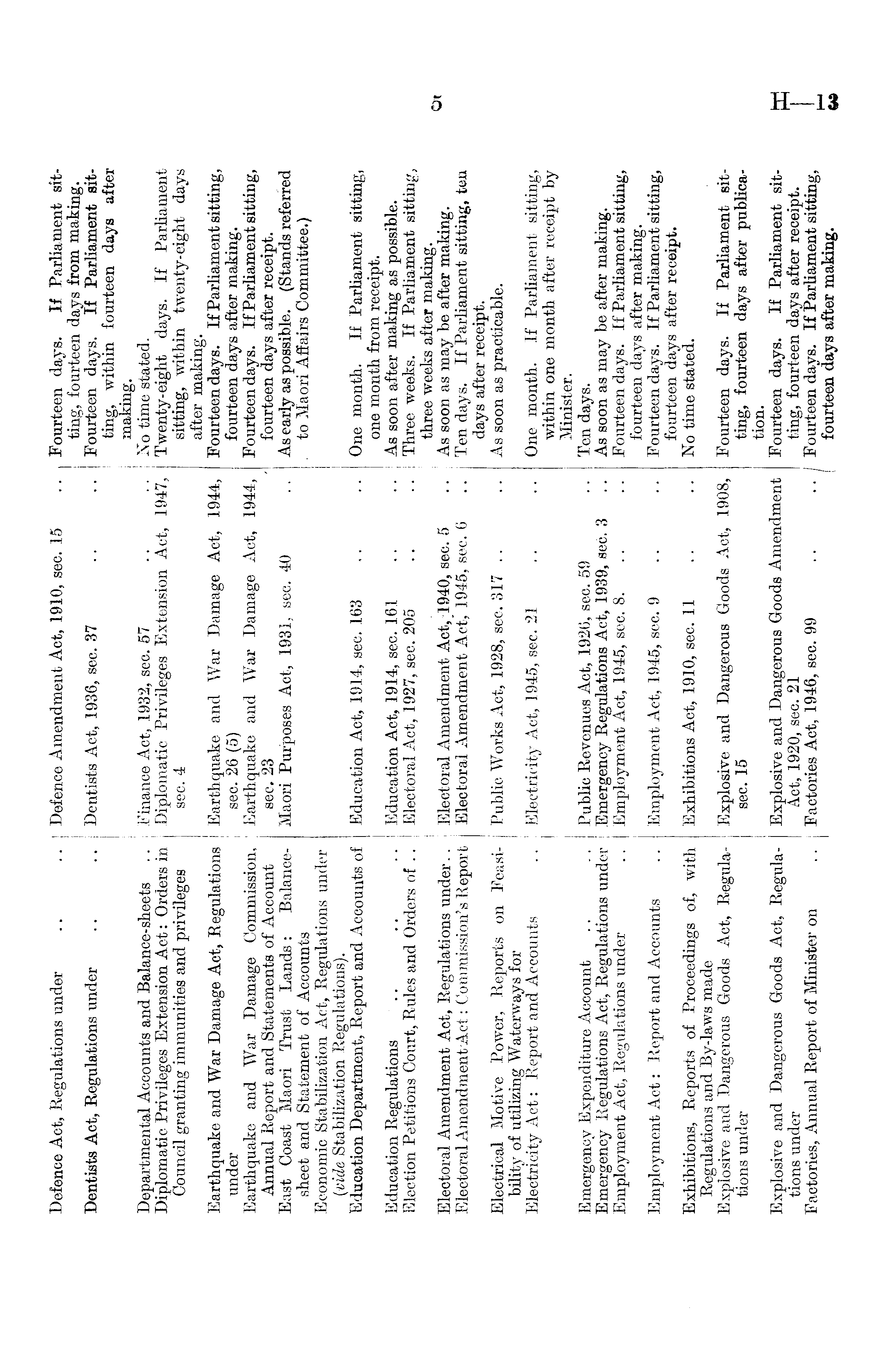 Defence Act, Regulations under .. .. Defence Amendment Act, 19i0, sec. 15 .. Fourteen days. If Parliament sitting, fourteen days from making. Dentists Act, Regulations under .. .. Dentists Act, 1936, sec. 37 .. .. Fourteen days. If Parliament sitting, within fourteen days after making. Departmental Accounts and Balance-sheets .. Finance Act, 1932, sec. 57 .. .. No time stated. Diplomatic Privileges Extension Act: Orders in Diplomatic Privileges Extension Act, 1947, Twenty-eight days. If Parliament Council granting immunities and privileges sec. 4 sitting, within twenty-eight days after making. Earthquake and War Damage Act, Regulations Earthquake and War Damage Act, 1944, Fourteen days. If Parliament sitting, under sec. 26 (5) fourteen days after making. Earthquake and War Damage Commission, Earthquake and War Damage Act, 1944, Fourteen days. If Parliament sitting, Annual Report and Statements of Account sec. 23 ' fourteen days after receipt. East Coast Maori Trust Lands: Balance- Maori Purposes Act, 1931. sec. 40 .. As early as possible. (Stands referred sheet and Statement of Accounts to Maori Affairs Committee.) Economic Stabilization Act, Regulations under (vide Stabilization Regulations). Education Department, Report and Accounts of Education Act, 1914, sec. 163 .. .. One month. If Parliament sitting, one month from receipt. Education Regulations .. .. .. Education Act, 1914, sec. 161 . . .. j As soon after making as possible. Election Petitions Court, Rules and Orders of .. Electoral Act, 1927, sec. 205 .. .. Three weeks. If Parliament sitting, three weeks after making. Electoral Amendment Act, Regulations under.. Electoral Amendment Act,-1940, sec. 5 As soon as may be after making. Electoral Amendment Act: Commission's Report Elecboral Amendment Act, 1945, sec. 6 .. Ten days. If Parliament sitting, ten days after receipt. Electrical Motive Power, Reports on Feasi- Public Works Act, 1928, sec. 317 .. As soon as practicable, bility of utilizing Waterways for Electricity Act: Report and Accounts .. Electricity Act, 1945, sec. 21 .. .. One month. If Parliament sitting, within one month after receipt by Minister. Emergency Expenditure Account .. . . Public Revenues Act, 1926, sec. 59 . . Ten days. Emergency Regulations Act, Regulations under Emergency Regulations Act, 1939, sec. 3 .. As soon as may be after making. Employment Act, Regulations under .. Employment Act, 1945, sec. 8. .. .. Fourteen days. If Parliament sitting, fourteen days after making. Employment Act: Report and Accounts .. Employment Act, 1945, sec. 9 .. .. Fourteen days. If Parliament sitting, fourteen days after receipt. Exhibitions, Reports of Proceedings of, with Exhibitions Act, 1910, sec. 11 .. .. No time statedRegulations and By-laws made Explosive and Dangerous Goods Act, Regula- Explosive and Dangerous Goods Act, 1908, Fourteen days. If Parliament sittions under sec. 15 ting, fourteen days after publication. Explosive and Dangerous Goods Act, Regula- Explosive and Dangerous Goods Amendment Fourteen days. If Parliament sittions under A.ct, 1920, sec. 21 ting, fourteen days after receipt. Factories, Annual Report of Minister on .. Factories Act, 1946, sec. 99 .. .. Fourteen days. If Parliament sitting, ( fourteen days after making.