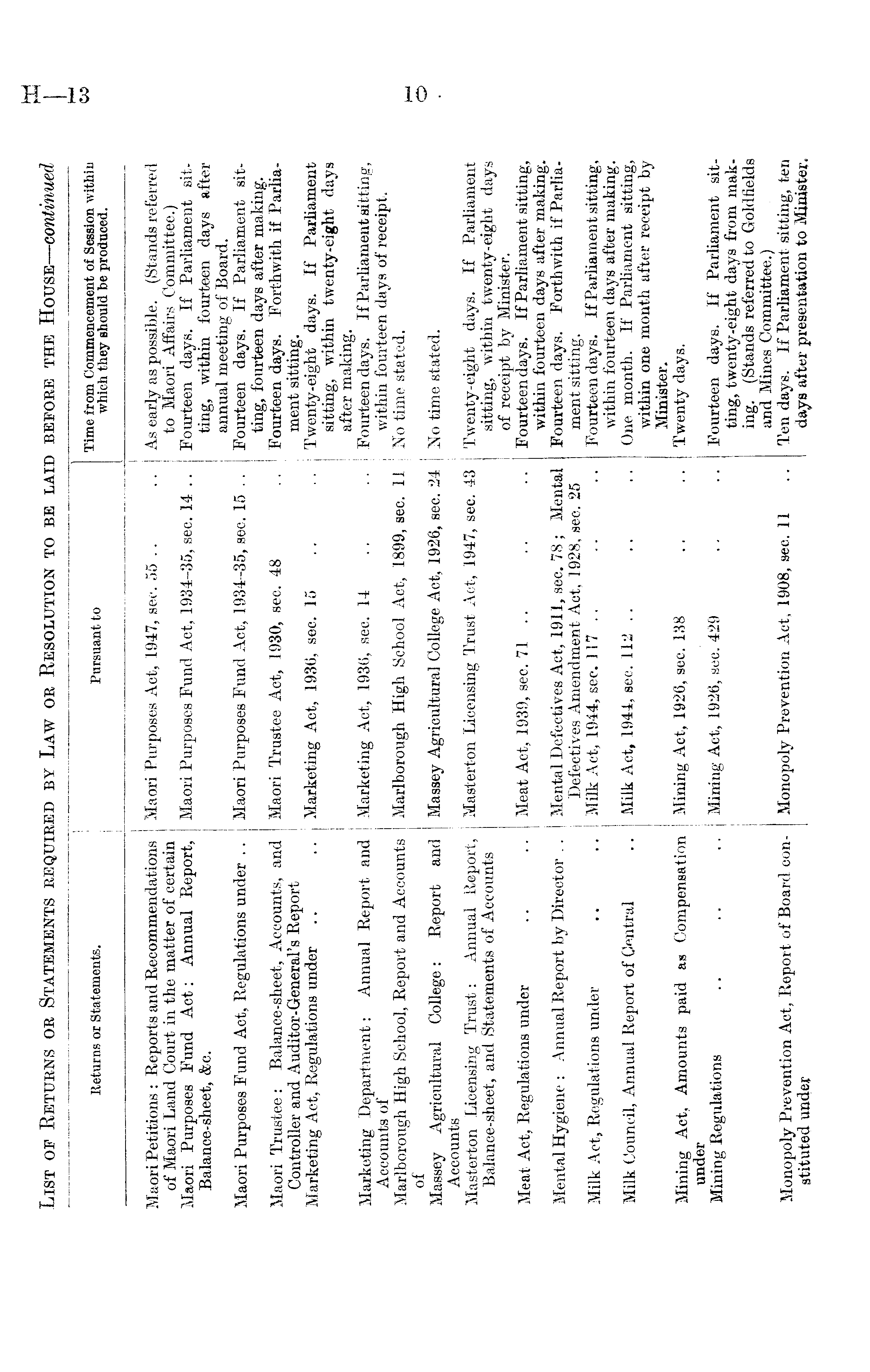 1 Returns or Statements. 1 Pursuant to Time from Commencement of Session within which they should be produced. Maori Petitions : Reports and Recommendations Maori Purposes Act, 1947, sec. 55 .. As early as possible. (Stands referred of Maori Land Court in the matter of certain to Maori Affairs Committee.) Maori Purposes Fund Act: Annual Report, Maori Purposes Fund Act, 1934-35, sec. 14 .. Fourteen days. If Parliament sit-Balance-sheet, &c. ting, within fourteen days after annual meeting of Board. Maori Purposes Fund Act, Regulations under .. Maori Purposes Fund Act, 1934-35, sec. 15 .. Fourteen days. If Parliament sitting, fourteen days after making. Maori Trustee : Balance-sheet, Accounts, and Maori Trustee Act, 1930, sec. 48 Fourteen days. Forthwith if ParliaController and Auditor-General's Report ment sitting. Marketing Act, Regulations under Marketing Act, 1936, sec. lo Twenty-eight days. If Parliament sitting, within twenty-eight days after making. Marketing Department: Annual Report and Marketing Act, 1936, sec. 14 . . .. Fourteen days. If Parliament sitting, Accounts of within fourteen days of receipt. Marlborough High School, Report and Accounts Marlborough High School Act, 1899, sec. 11 No time stated. Ol Massey Agricultural College: Report and Massey Agricultural College Act, 1926, sec. 24 No time stated. Accounts Masterton Licensing Trust: Annual Report, Masterton Licensing Trust Act, 1947, sec. 43 Twenty-eight days. If Parliament Balance-sheet, and Statements of Accounts sitting, within twenty-eight days of receipt by Minister. Meat Act, Regulations under Meat Act, 1939, sec. 71 .. Fourteen days. If Parliament sitting, within fourteen days after making. Mental Hygiene : Annual Report by Director .. Mental Defectives Act, 1911, sec. 78 ; Mental Fourteen days. Forthwith if ParliaDefectives Amendment Aot, 1928, sec. 25 ment sitting. Milk Act, Regulations under Milk Act, 1944, sec. 117 .. Fourteen days. If Parliament sitting, within fourteen days after making. Milk Council, Annual Report of Central Milk Act, 1944, sec. 112 .. One month. If Parliament sitting, within one month after receipt by Minister. Mining Act, Amounts paid as Compensation Mining Act, 1926, sec. 138 Twenty days. under Mining Regulations Mining Act, 1926, sec. 429 Fourteen days. If Parliament sitting, twenty-eight days from making. (Stands referred to Goldfields and Mines Committee.) Monopoly Prevention Act, Report of Board conMonopoly Prevention Aot, 1908, see. 11 Ten days. If Parliament sitting, ten stituted under days after presentation to Minister.