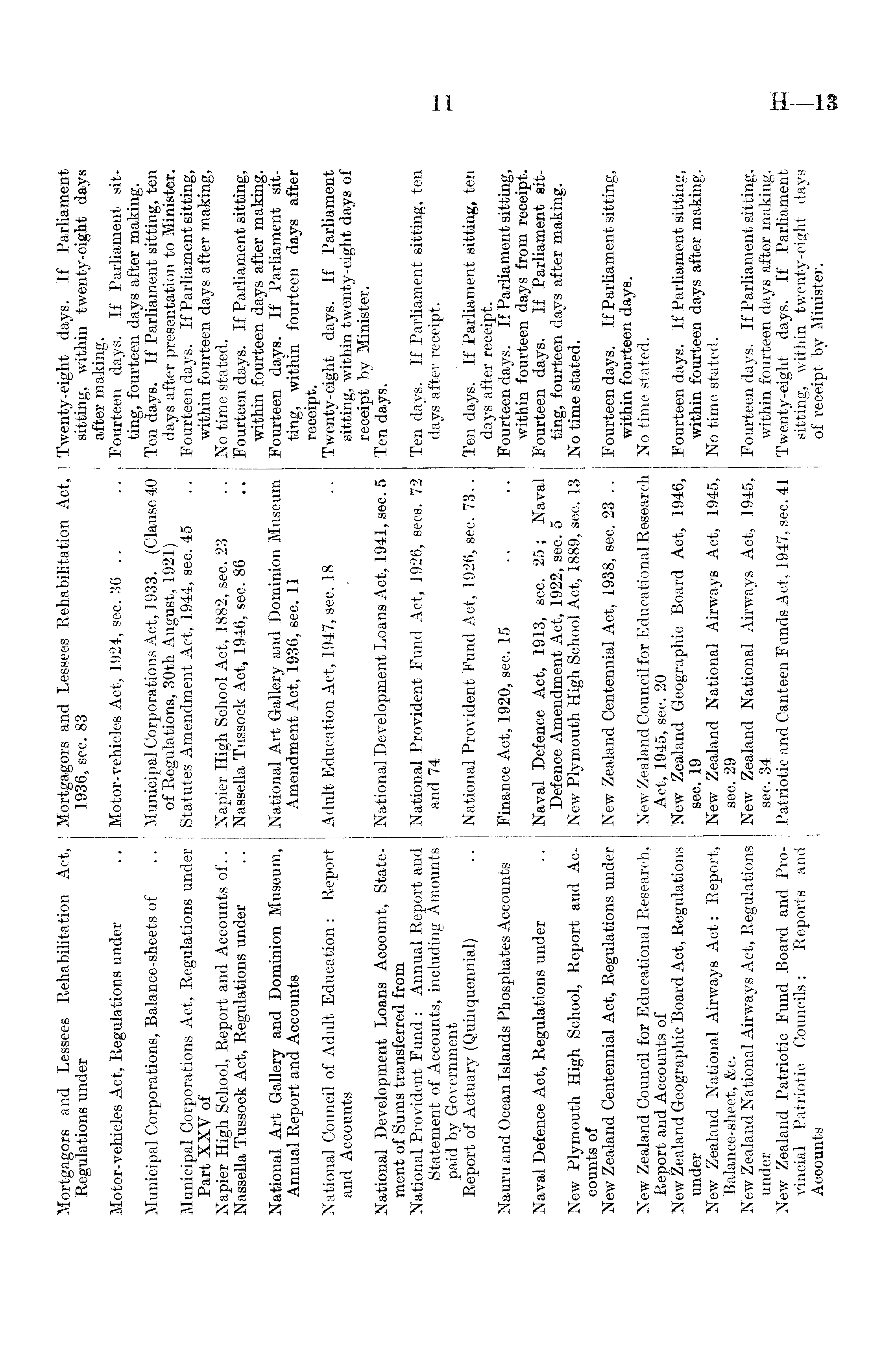 Mortgagors and Lessees Rehabilitation Act, Mortgagors and Lessees Rehabilitation Act, Twenty-eight days. If Parliament Regulations under 1936, sec. 83 sitting, within twenty-eight days after making. Motor-vehicles Act, Regulations under Motor-vehicles Act, 1924, sec. 36 .. Fourteen days. If Parliament aitting, fourteen days after making. Municipal Corporations, Balance-sheets of Municipal Corporations Act, 1933. (Clause 40 Ten days. If Parliament sitting, ten of Regulations, 30th August, 1921) days after presentation to Minister. Municipal Corporations Act, Regulations under Statutes Amendment Act, 1944, sec. 45 Fourteen days. If Parliament sitting, Part XXV of within fourteen days after making, Napier High School, Report and Accounts of.. Napier High School Act, 1882, sec. 23 No time stated. Nassella Tussock Act, Regulations under Nassella Tussock Act, 1946, sec. 86 Fourteen days. If Parliament sitting, within fourteen days after making. National Art Gallery and Dominion Museum, National Art Gallery and Dominion Museum Fourteen days. If Parliament sitAnnual Report and Accounts Amendment Act, 1936, sec. 11 ting, within fourteen days after receipt. National Council of Adult Education : Report Adult Education Act, 1947, sec. 18 Twenty-eight days. If Parliament and Accounts sitting, within twenty-eight days of receipt by Minister. National Development Loans Account, StateNational Development Loans Act, 1941, sec. 5 Ten days. ment of Sums transferred from National Provident Fund : Annual Report and National Provident Fund Act, 1926, sees. 72 Ten days. If Parliament sitting, ten Statement of Accounts, including Amounts and 74 days after receipt. paid by Government Report of Actuary (Quinquennial) National Provident Fund Act, 1926, sec. 73.. Ten days. If Parliament sitting, ten days after receipt. Nauru and Ocean Islands Phosphates Accounts Finance Act, 1920, sec. 15 Fourteen days. If Parliament sitting, within fourteen days from receipt. Naval Defence Act, Regulations under Naval Defence Act, 1913, sec. 25; Naval Fourteen days. If Parliament sitDefence Amendment Act, 1922, sec. 5 ting, fourteen days after making. New Plymouth High School, Report and AcNew Plymouth High School Act, 1889, sec. 13 No time stated. counts of New Zealand Centennial Act, Regulations under New Zealand Centennial Act, 1938, sec. 23 .. Fourteen days. If Parliament sitting, within fourteen days. New Zealand Council for Educational Research, New Zealand Council for Educational Research No time stated. Report and Accounts of Act, 1945, sec. 20 New Zealand Geographic Board Act, Regulations New Zealand Geographic Board Aot, 1946, Fourteen days. If Parliament sitting, under sec. 19 within fourteen days after making. New Zealand National Airways Act: Report, New Zealand National Airways Act, 1945, No time stated. Balance-sheet, &c. seo. 29 New Zealand National Airways Act, Regulations New Zealand National Airways Act, 1945, Fourteen days. If Parliament sitting, under sec. 34 within fourteen days after making. New Zealand Patriotic Fund Board and ProPatriotic and Canteen Funds Act, 1947, see. 41 Twenty-eight days. If Parliament sitting, within twenty-eight days vincial Patriotic Councils: Reports and Accounts of receipt by Minister.