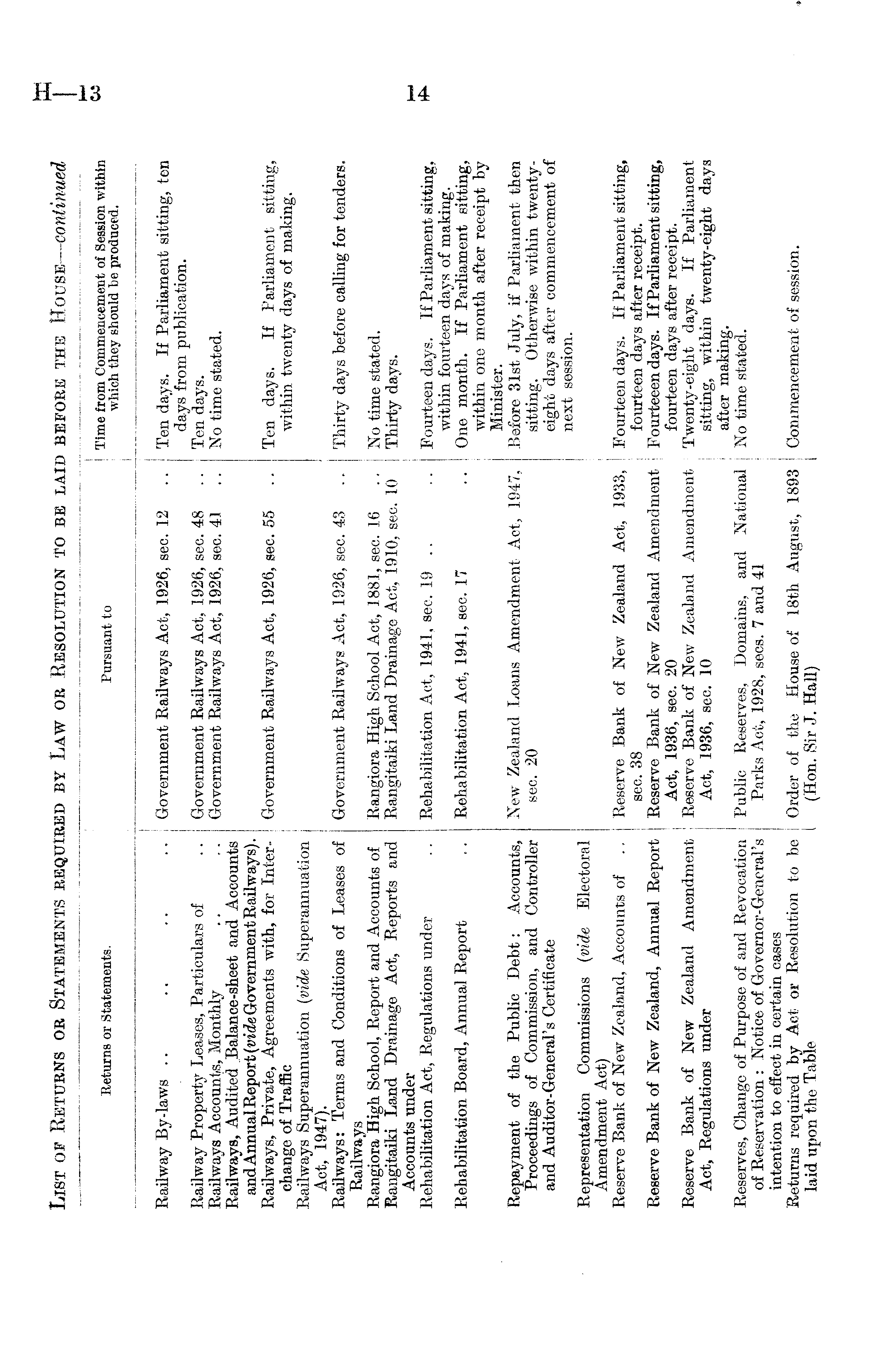 Returns or Statements. Pursuant to Time from Commencement of Session within which they should be produced. Railway By-laws Government Railways Act, 1926, sec. 12 Ten days. If Parliament sitting, ten days from publication. Railway Property Leases, Particulars of Government Railways Act, 1926, sec. 48 Ten days. Railways Accounts, Monthly Government Railways Act, 1926, sec. 41 No time stated. Railways, Audited Balance-sheet and Accounts and Annual Report (vide Government Railways). Railways, Private, Agreements with, for InterGovernment Railways Act, 1926, sec. 55 Ten days. If Parliament sitting, change of Traffic within twenty days of making. Railways Superannuation (vide Superannuation Act, 1947). Railways: Terms and Conditions of Leases of Government Railways Act, 1926, sec. 43 Thirty days before calling for tenders. Railways Rangiora High School, Report and Accounts of Rangiora High School Act, 1881, sec. 16 No time stated. Rangitaiki Land Drainage Act, Reports and Rangitaiki Land Drainage Act, 1910, sec. 10 Thirty days. Accounts under Rehabilitation Act, Regulations under Rehabilitation Act, 1941, sec. 19 .. Fourteen days. If Parliament sitting, within fourteen days of making. Rehabilitation Board, Annual Report Rehabilitation Act, 1941, sec. 17 One month. If Parliament sitting, within one month after receipt by Minister. Repayment of the Public Debt: Accounts, New Zealand Loans Amendment Act, 1947, Before 31st July, if Parliament then Proceedings of Commission, and Controller sec. 20 sitting. Otherwise within twentyand Auditor-General's Certificate eight days after commencement of next session. Representation Commissions (vide Electoral Amendment Act) Reserve Bank of New Zealand, Accounts of Reserve Bank of New Zealand Act, 1933, Fourteen days. If Parliament sitting, sec. 38 fourteen days after receipt. Reserve Bank of New Zealand, Annual Report Reserve Bank of New Zealand Amendment Fourteeen days. If Parliament sitting, Act, 1936, sec. 20 fourteen days after receipt. Reserve Bank of New Zealand Amendment Reserve Bank of New Zealand Amendment Twenty-eight days. If Parliament Act, Regulations under Act, 1936, sec. 10 sitting, within twenty-eight days after making. Reserves, Change of Purpose of and Revocation Public Reserves, Domains, and National No time stated. of Reservation : Notice of Governor-General's Parks Act, 1928, sees. 7 and 41 intention to effect in certain cases Returns required by Act or Resolution to be Order of the House of 18th August, 1893 Commencement of session. laid upon the Table (Hon. Sir J. Hall)