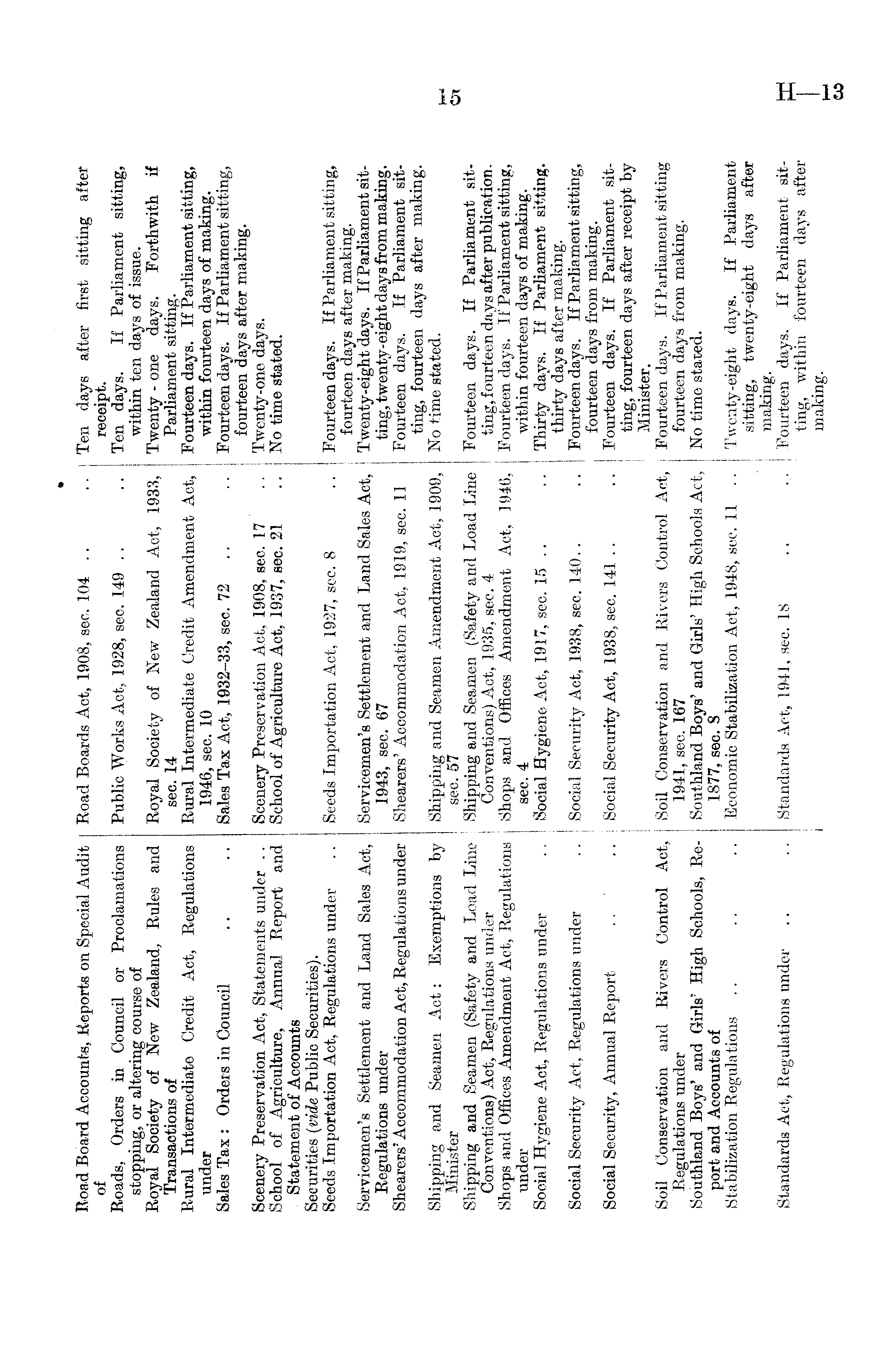 • Road Board Accounts, Reports on Special Audit Road Boards Act, 1908, sec. 104 .. .. Ten days after first sitting after of receipt. Roads, Orders in Council or Proclamations Public Works Act, 1928, sec. 149 .. .. Ten days. If Parliament sitting, stopping, or altering course of within ten days of issue. Royal Society of New Zealand, Rules and Royal Society of New Zealand Act, 1933, Twenty - one days. Forthwith if Transactions of sec. 14 Parliament sitting. Rural Intermediate Credit Act, Regulations Rural Intermediate Credit Amendment Act, Fourteen days. If Parliament sitting, under 1946, sec. 10 within fourteen days of making. Sales Tax : Orders in Council .. .. Sales Tax Act, 1932-33, sec. 72 .. Fourteen days. If Parliament sitting, fourteen days after making. Scenery Preservation Act, Statements under .. Scenery Preservation Act, 1908, sec. 17 . . Twenty-one days. School of Agriculture, Annual Report and School of Agriculture Act, 1937, sec. 21 No time stated. Statement of Accounts Securities (vide Public Securities). Seeds Importation Act, Regulations under .. Seeds Importation Act, 1927, sec. 8 .. Fourteen days. If Parliament sitting, fourteen days after making. Servicemen's Settlement and Land Sales Act, Servicemen's Settlement and Land Sales Act, Twenty-eight days. If Parliament sitRegulations under 1943, sec. 67 ting, twenty-eight days from making. Shearers'Accommodation Act, Regulations under Shearers'Accommodation Act, 1919, sec. 11 Fourteen days. If Parliament sitting, fourteen days after making. Shipping and Seamen Act: Exemptions by Shipping and Seamen Amendment Act, 1909, No time stated. Minister sec. 57 Shipping and Seamen (Safety and Load Line | Shipping and Seamen (Safety and Load Line Fourteen days. If Parliament sitConventions) Act, Regulations under Conventions) Act, 1935, sec. 4 ting, fourteen days after publication. Shops and Offices Amendment Act, Regulations Shops and Offices Amendment Act, 1946, Fourteen days. If Parliament sitting, under sec. 4 within fourteen days of making. Social Hygiene Act, Regulations under . . Social Hygiene Act, 1917, sec. 15 .. .. Thirty days. If Parliament sitting. thirty days after making. Social Security Act, Regulations under .. Social Security Act, 1938, sec. 140.. .. Fourteen days. If Parliament sitting, fourteen days from making. Social Security, Annual Report . . .. Social Security Act, 1938, sec. 141 .. .. Fourteen days. If Parliament sitting, fourteen days after receipt by Minister. Soil Conservation and Rivers Control Act, Soil Conservation and Rivers Control Act, Fourteen days. If Parliament sitting Regulations under 1941, sec. 167 fourteen days from making. Southland Boys' and Girls' High Schools, Re- Southland Boys' and Girls' High Schools Act, No time stated, port and Accounts of 1877, sec. 8 Stabilization Regulations . . .. .. Economic Stabilization Act, 1948, sec. 11 .. Twenty-eight days. If Parliament sitting, twenty-eight days after making. Standards Act, Regulations under .. .. Standards Act, 1941, sec. 18 .. ... Fourteen days. If Parliament sitting, within fourteen days after making.