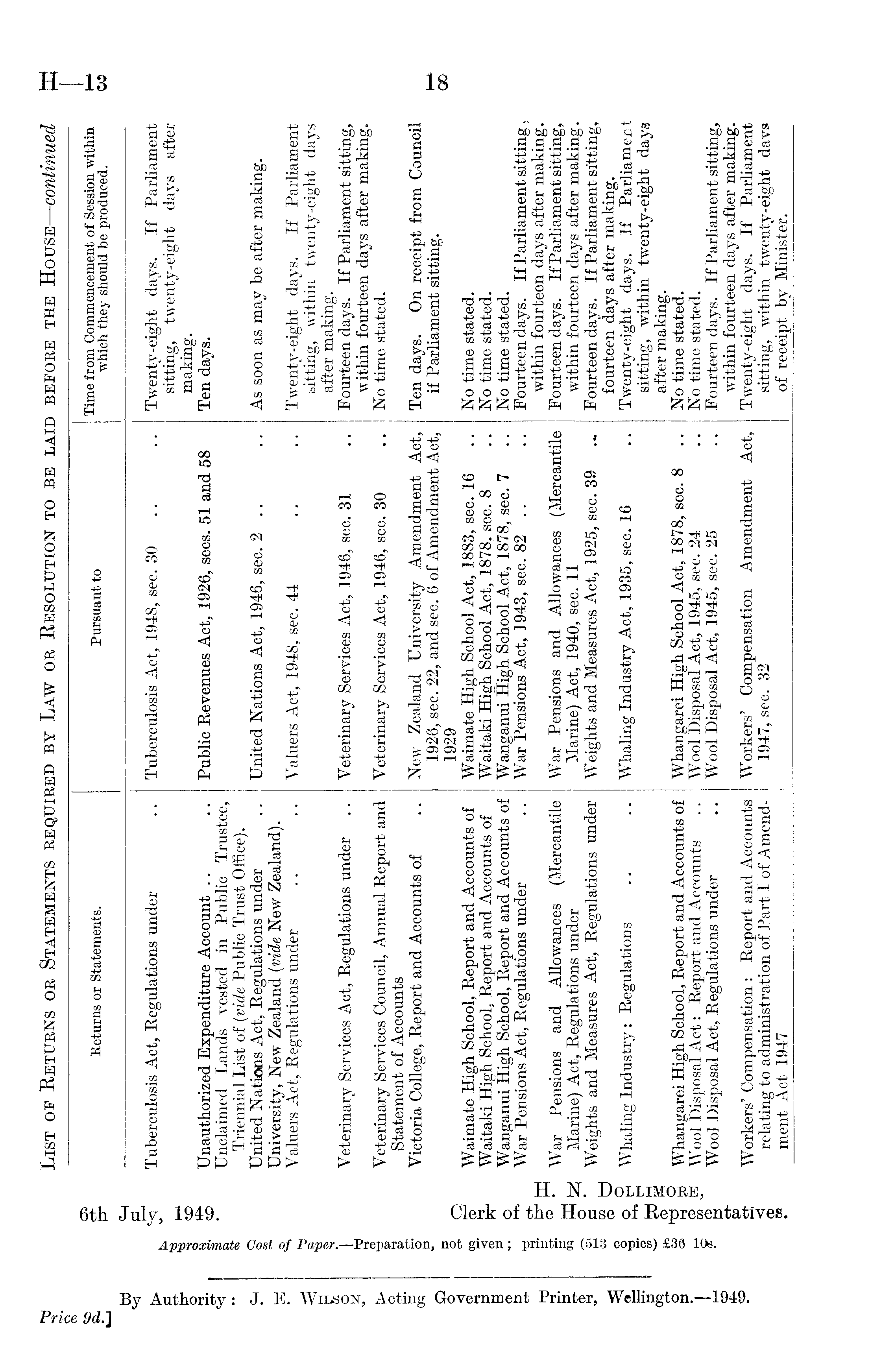 H. N. Dollimore, 6th July, 1949. Clerk of the House of Representatives.