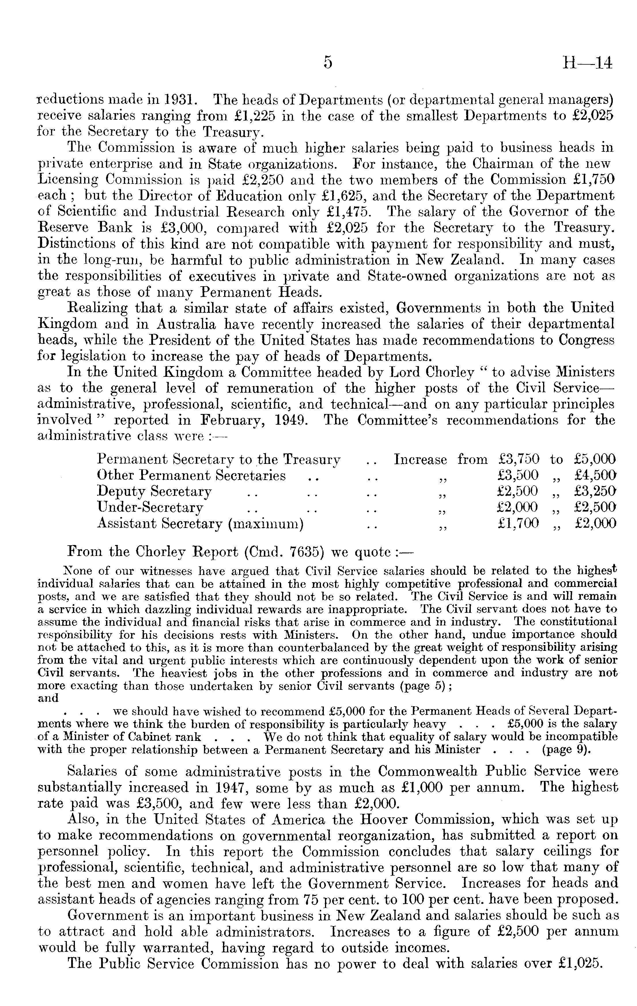 reductions made in 1931. The heads of Departments (or departmental general managers) receive salaries ranging from £1,225 in the case of the smallest Departments to £2,025 for the Secretary to the Treasury. The Commission is aware of much higher salaries being paid to business heads in private enterprise and in State organizations. For instance, the Chairman of the new Licensing Commission is paid £2,250 and the two members of the Commission £1,750 each ; but the Director of Education only £1,625, and the Secretary of the Department of Scientific and Industrial Eesearch only £1,475. The salary of the Governor of the Reserve Bank is £3,000, compared with £2,025 for the Secretary to the Treasury. Distinctions of this kind are not compatible with payment for responsibility and must, in the long-run, be harmful to public administration in New Zealand. In many cases the responsibilities of executives in private and State-owned organizations are not as great as those of many Permanent Heads. Realizing that a similar state of affairs existed, Governments in both the United Kingdom and in Australia have recently increased the salaries of their departmental heads, while the President of the United States has made recommendations to Congress for legislation to increase the pay of heads of Departments. In the United Kingdom a Committee headed by Lord Chorley " to advise Ministers as to the general level of remuneration of the higher posts of the Civil Service — administrative, professional, scientific, and technical—and on any particular principles involved" reported in February, 1949. The Committee's recommendations for the administrative class were : Permanent Secretary to the Treasury .. Increase from £3,750 to £5,000 Other Permanent Secretaries .. .. „ £3,500 „ £4,500 Deputy Secretary .. .. .. „ £2,500 „ £3,250 Under-Secretary .. .. .. „ £2,000 „ £2,500 Assistant Secretary (maximum) .. ~ £1,700 „ £2,000 From the Chorley Report (Cmd. 7635) we quote : None of our witnesses have argued that Civil Service salaries should be related to the highes* individual salaries that can be attained in the most highly competitive professional and commercial posts, and we are satisfied that they should not be so related. The Civil Service is and will remain a service in which dazzling individual rewards are inappropriate. The Civil servant does not have to assume the individual and financial risks that arise in commerce and in industry. The constitutional responsibility for his decisions rests with Ministers. On the other hand, undue importance should not be attached to this, as it is more than counterbalanced by the great weight of responsibility arising from the vital and urgent public interests which are continuously dependent upon the work of senior Civil servants. The heaviest jobs in the other professions and in commerce and industry are not more exacting than those undertaken by senior Civil servants (page 5); and . . . we should have wished to recommend £5,000 for the Permanent Heads of Several Departments where we think the burden of responsibility is particularly heavy . . . £5,000 is the salary of a Minister of Cabinet rank . . . We do not think that equality of salary would be incompatible with the proper relationship between a Permanent Secretary and his Minister . . . (page 9). Salaries of some administrative posts in the Commonwealth Public Service were substantially increased in 1947, some by as much as £l,OOO per annum. The highest rate paid was £3,500, and few were less than £2,000. Also, in the United States of America the Hoover Commission, which was set up to make recommendations on governmental reorganization, has submitted a report on personnel policy. In this report the Commission concludes that salary ceilings for professional, scientific, technical, and administrative personnel are so low that many of the best men and women have left the Government Service. Increases for heads and assistant heads of agencies ranging from 75 per cent, to 100 per cent, have been proposed. Government is an important business in New Zealand and salaries should be such as to attract and hold able administrators. Increases to a figure of £2,500 per annum would be fully warranted, having regard to outside incomes. The Public Service Commission has no power to deal with salaries over £1,025.