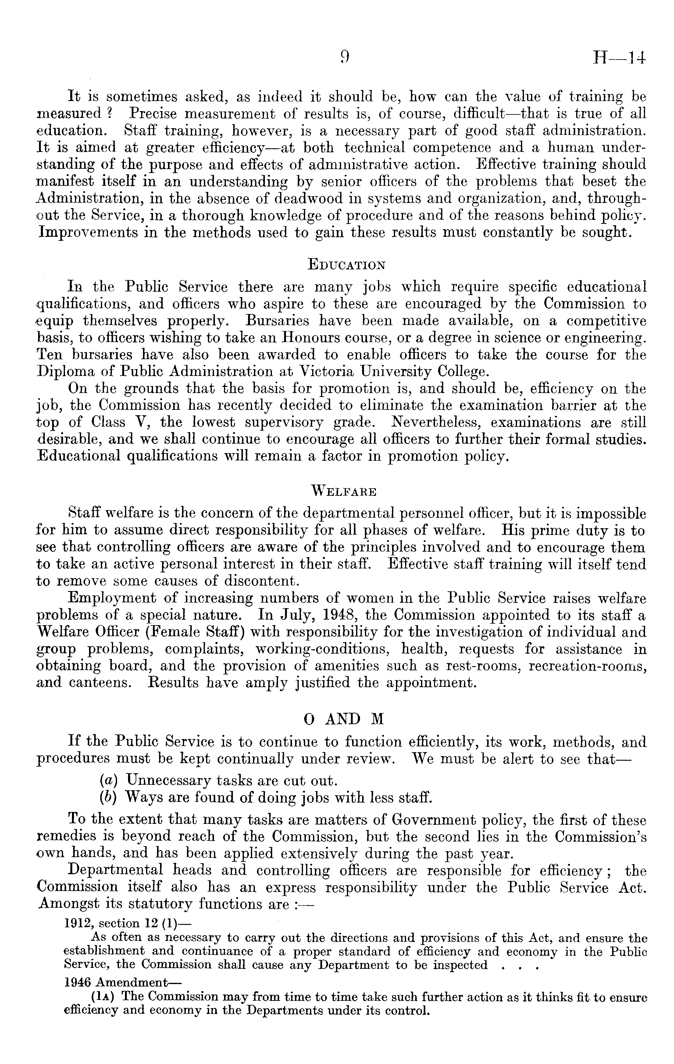 It is sometimes asked, as indeed it should be, how can the value of training be measured ? Precise measurement of results is, of course, difficult—that is true of all education. Staff training, however, is a necessary part of good staff administration. It is aimed at greater efficiency—at both technical competence and a human understanding of the purpose and effects of administrative action. Effective training should manifest itself in an understanding by senior officers of the problems that beset the Administration, in the absence of deadwood in systems and organization, and, throughout the Service, in a thorough knowledge of procedure and of the reasons behind policy. Improvements in the methods used to gain these results must constantly be sought. Education In the Public Service there are many jobs which require specific educational qualifications, and officers who aspire to these are encouraged by the Commission to equip themselves properly. Bursaries have been made available, on a competitive basis, to officers wishing to take an Honours course, or a degree in science or engineering. Ten bursaries have also been awarded to enable officers to take the course for the Diploma of Public Administration at Victoria University College. On the grounds that the basis for promotion is, and should be, efficiency on the job, the Commission has recently decided to eliminate the examination barrier at the top of Class V, the lowest supervisory grade. Nevertheless, examinations are still desirable, and we shall continue to encourage all officers to further their formal studies. Educational qualifications will remain a factor in promotion policy. Welfare Staff welfare is the concern of the departmental personnel officer, but it is impossible for him to assume direct responsibility for all phases of welfare. His prime duty is to see that controlling officers are aware of the principles involved and to encourage them to take an active personal interest in their staff. Effective staff training will itself tend to remove some causes of discontent. Employment of increasing numbers of women in the Public Service raises welfare problems of a special nature. In July, 1948, the Commission appointed to its staff a Welfare Officer (Female Staff) with responsibility for the investigation of individual and group problems, complaints, working-conditions, health, requests for assistance in obtaining board, and the provision of amenities such as rest-rooms, recreation-rooms, and canteens. Results have amply justified the appointment. 0 AND M If the Public Service is to continue to function efficiently, its work, methods, and procedures must be kept continually under review. We must be alert to see that — (a) Unnecessary tasks are cut out. (b) Ways are found of doing jobs with less staff. To the extent that many tasks are matters of Government policy, the first of these remedies is beyond reach of the Commission, but the second lies in the Commission's own hands, and has been applied extensively during the past year. Departmental heads and controlling officers are responsible for efficiency; the Commission itself also has an express responsibility under the Public Service Act. Amongst its statutory functions are : 1912, section 12 (1) As often as necessary to carry out the directions and provisions of this Act, and ensure the establishment and continuance of a proper standard of efficiency and economy in the Public Service, the Commission shall cause any Department to be inspected . . . 1946 Amendment — (1a) The Commission may from time to time take such further action as it thinks fit to ensure efficiency and economy in the Departments under its control.