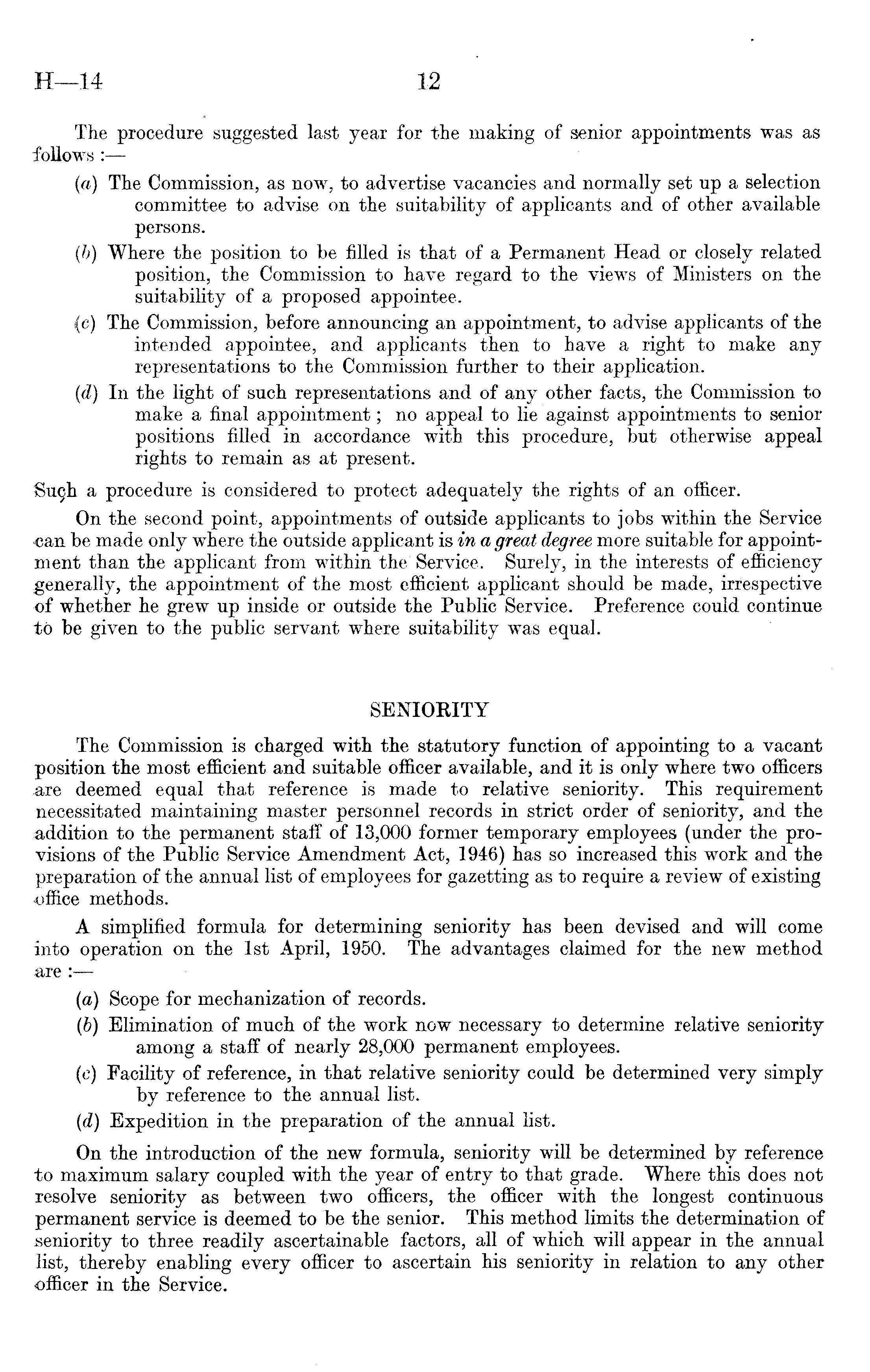 The procedure suggested last year for the making of senior appointments was as follows : (a) The Commission, as now, to advertise vacancies and normally set up a selection committee to advise on the suitability of applicants and of other available persons. (b) Where the position to be filled is that of a Permanent Head or closely related position, the Commission to have regard to the views of Ministers on the suitability of a proposed appointee. (c) The Commission, before announcing an appointment, to advise applicants of the intended appointee, and applicants then to have a right to make any representations to the Commission further to their application. (d) In the light of such representations and of any other facts, the Commission to make a final appointment; no appeal to lie against appointments to senior positions filled in accordance with this procedure, but otherwise appeal rights to remain as at present. SU9II a procedure is considered to protect adequately the rights of an officer. On the second point, appointments of outside applicants to jobs within the Service can be made only where the outside applicant is in a great degree more suitable for appointment than the applicant from within the Service. Surely, in the interests of efficiency generally, the appointment of the most efficient applicant should be made, irrespective of whether he grew up inside or outside the Public Service. Preference could continue to be given to the public servant where suitability was equal. SENIORITY The Commission is charged with the statutory function of appointing to a vacant position the most efficient and suitable officer available, and it is only where two officers are deemed equal that reference is made to relative seniority. This requirement necessitated maintaining master personnel records in strict order of seniority, and the addition to the permanent staff of 13,000 former temporary employees (under the provisions of the Public Service Amendment Act, 1946) has so increased this work and the preparation of the annual list of employees for gazetting as to require a review of existing office methods. A simplified formula for determining seniority has been devised and will come into operation on the Ist April, 1950. The advantages claimed for the new method are : (a) Scope for mechanization of records. (b) Elimination of much of the work now necessary to determine relative seniority among a staff of nearly 28,000 permanent employees. (0) Facility of reference, in that relative seniority could be determined very simply by reference to the annual list. (d) Expedition in the preparation of the annual list. On the introduction of the new formula, seniority will be determined by reference to maximum salary coupled with the year of entry to that grade. Where this does not Tesolve seniority as between two officers, the officer with the longest continuous permanent service is deemed to be the senior. This method limits the determination of seniority to three readily ascertainable factors, all of which will appear in the annual list, thereby enabling every officer to ascertain his seniority in relation to any other officer in the Service.