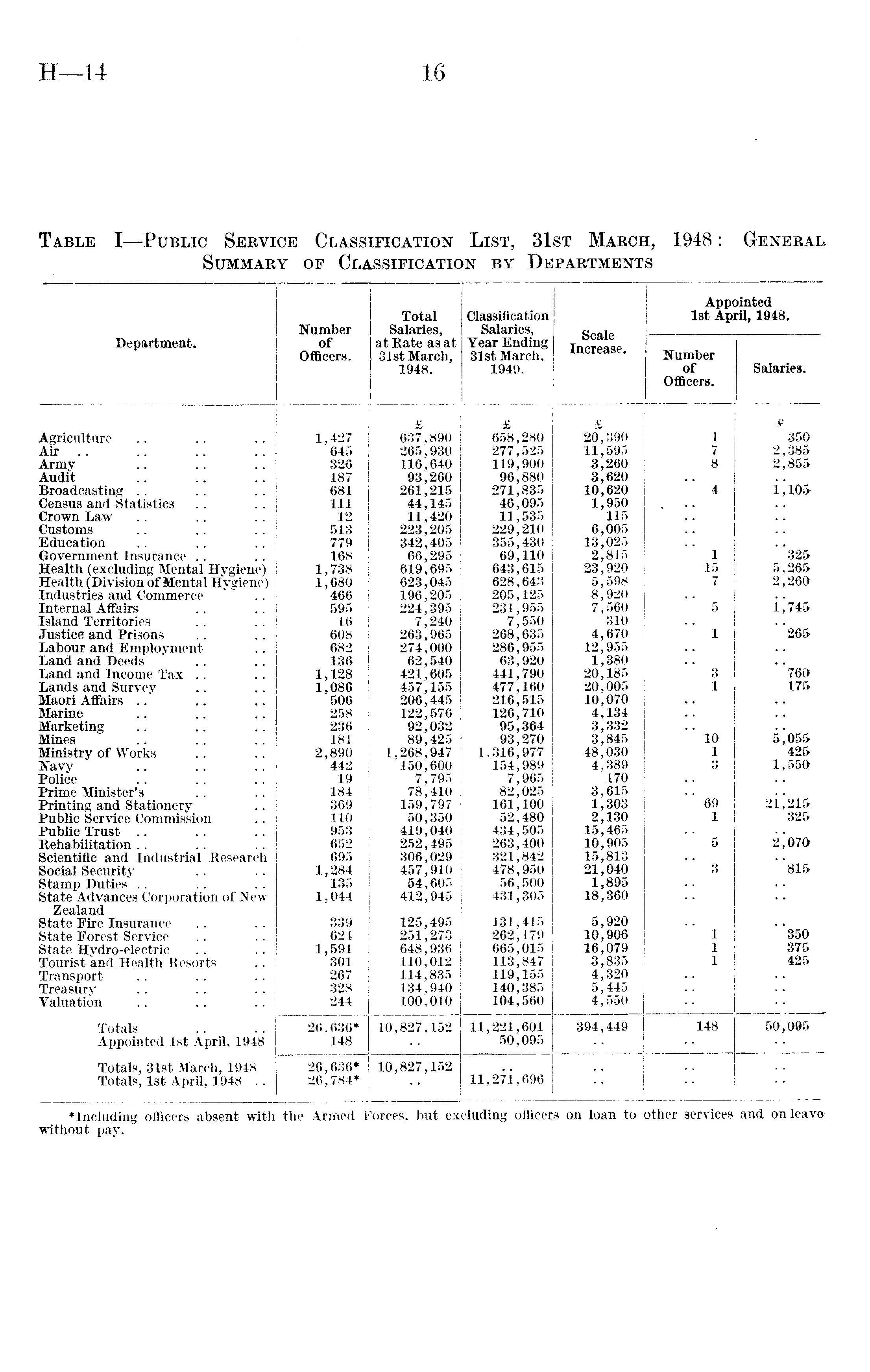 Table I—Public Service Classification List, 31st March, 1948: General Summary of Classification by Departments