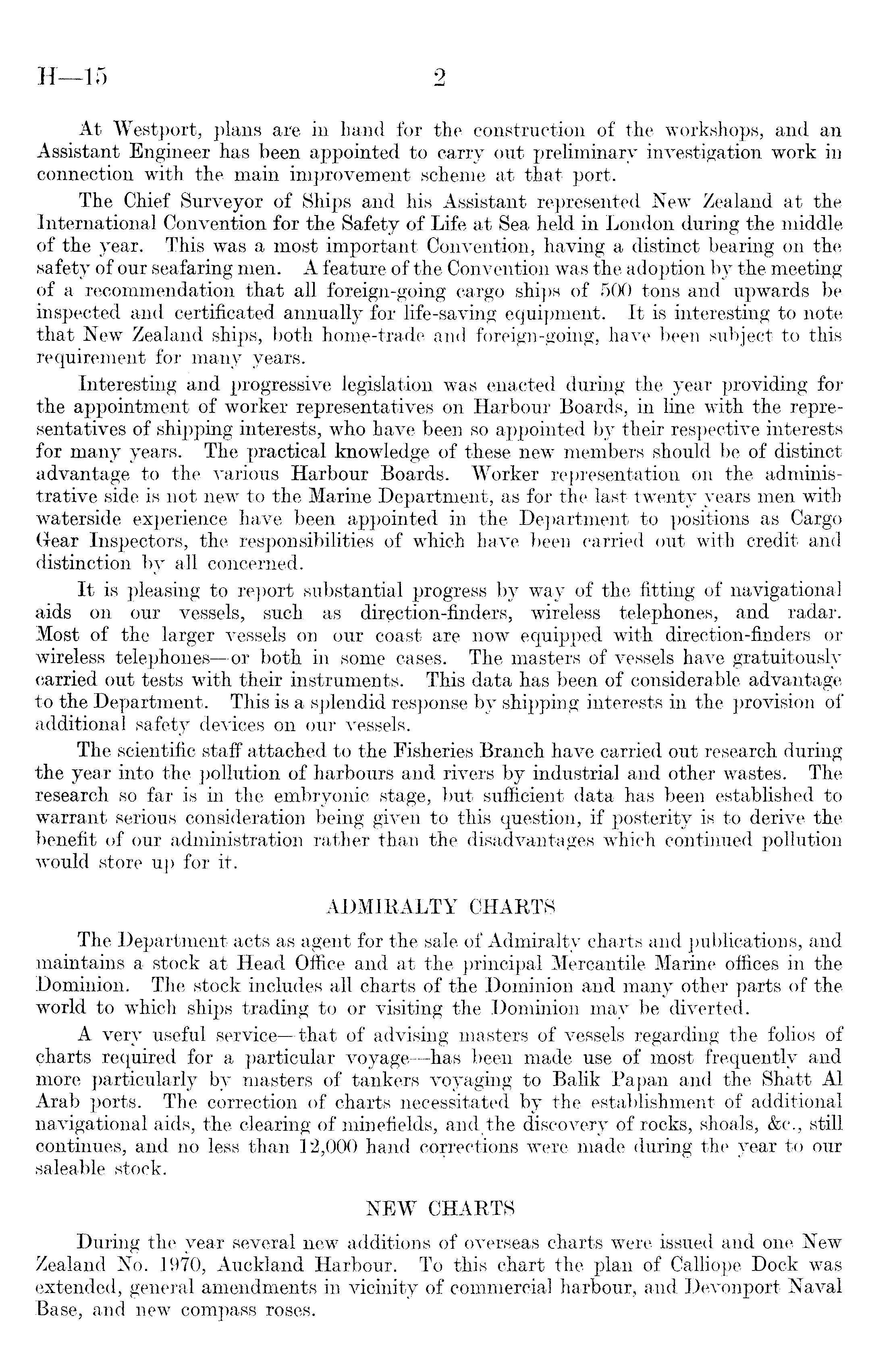 At Westport, plans are in hand for the construction of the workshops, and an Assistant Engineer has been appointed to carry out preliminary investigation work in connection with the main improvement scheme at that port. The Chief Surveyor of Ships and his Assistant represented New Zealand at the International Convention for the Safety of Life at Sea held in London during the middle of the year. This was a most important Convention, having a distinct bearing on the safety of our seafaring men. A feature of the Convention was the adoption by the meeting of a recommendation that all foreign-going cargo ships of 500 tons and upwards be inspected and certificated annually for life-saving equipment. It is interesting to note that New Zealand ships, both home-trade and foreign-going, have been subject to this requirement for many years. Interesting and progressive legislation was enacted during the year providing for the appointment of worker representatives on Harbour Boards, in line with the representatives of shipping interests, who have been so appointed by their respective interests for many years. The practical knowledge of these new members should be of distinct advantage to the various Harbour Boards. Worker representation on the administrative side is not new to the Marine Department, as for the last twenty years men with waterside experience have been appointed in the Department to positions as Cargo Gear Inspectors, the responsibilities of which have been carried out with credit and distinction by all concerned. It is pleasing to report substantial progress by way of the fitting of navigational aids on our vessels, such as direction-finders, wireless telephones, and radar. Most of the larger vessels on our coast are now equipped with direction-finders or wireless telephones—or both in some cases. The masters of vessels have gratuitously carried out tests with their instruments. This data has been of considerable advantage to the Department. This is a splendid response by shipping interests in the provision of additional safety devices on our vessels. The scientific staff attached to the Fisheries Branch have carried out research during the year into the pollution of harbours and rivers by industrial and other wastes. The research so far is in the embryonic stage, but sufficient data has been established to warrant serious consideration being given to this question, if posterity is to derive the benefit of our administration rather than the disadvantages which continued pollution would store up for it. ADMIRALTY CHARTS The Department acts as agent for the sale of Admiralty charts and publications, and maintains a stock at Head Office and at the principal Mercantile Marine offices in the Dominion. The stock includes all charts of the Dominion and many other parts of the world to which ships trading to or visiting the Dominion may be diverted. A very useful service—that of advising masters of vessels regarding the folios of charts required for a particular voyage —has been made use of most frequently and more particularly by masters of tankers voyaging to Balik Papan and the Shatt A 1 Arab ports. The correction of charts necessitated by the establishment of additional navigational aids, the clearing of minefields, discovery of rocks, shoals, &c., still continues, and no less than 12,000 hand corrections were made during the year to our saleable stock. NEW CHARTS During the year several new additions of overseas charts were issued and one New Zealand No. 1970, Auckland Harbour. To this chart the plan of Calliope Dock was extended, general amendments in vicinity of commercial harbour, and Devonport Naval Base, and new compass roses.