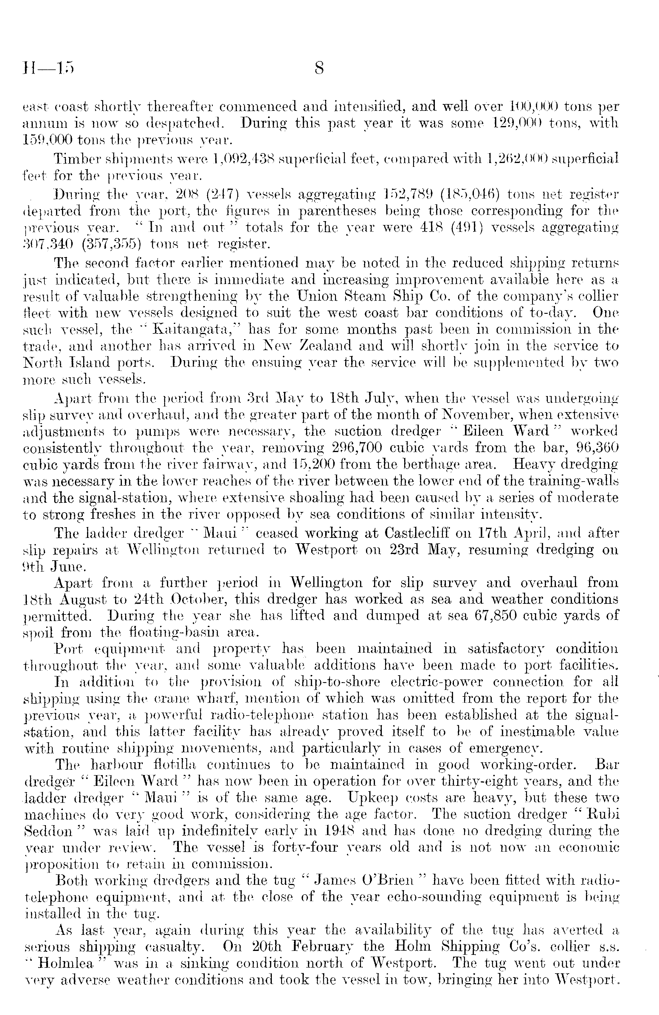 east coast shortly thereafter commenced and intensified, and well over 100,000 tons per annum is now so despatched. During this past year it was some 129,000 tons, with 159,000 tons the previous year. Timber shipments were 1,092,438 superficial feet, compared with 1,262,000 superficial feet for the previous year. Dxiring the year, 208 (247) vessels aggregating 152,789 (185,046) tons net register departed from the port, the figures in parentheses being those corresponding for the previous year. "In and out " totals for the year were 418 (491) vessels aggregating 307,340 (357,355) tons net register. The second factor earlier mentioned may be noted in the reduced shipping returns just indicated, but there is immediate and increasing improvement available here as a result of valuable strengthening by the Union Steam Ship Co. of the company's collier fleet with new vessels designed to suit the west coast bar conditions of to-day. One such vessel, the " Kaitangata," has for some months past been in commission in the trade, and another has arrived in New Zealand and will shortly join in the service to North Island ports. During the ensuing year the service will be supplemented by two more such vessels. Apart from the period from 3rd May to 18th July, when the vessel was undergoing slip survey and overhaul, and the greater part of the month of November, when extensive adjustments to pumps were necessary, the suction dredger " Eileen Ward " worked consistently throughout the year, removing 296,700 cubic yards from the bar, 96,360 cubic yards from the river fairway, and 15,200 from the berthage area. Heavy dredging was necessary in the lower reaches of the river between the lower end of the training-walls and the signal-station, where extensive shoaling had been caused by a series of moderate to strong freshes in the river opposed by sea conditions of similar intensity. The ladder dredger " Maui " ceased working at Castlecliff on 17th April, and after slip repairs at Wellington returned to Westport on 23rd May, resuming dredging on 9th June. Apart from a further period in Wellington for slip survey and overhaul from 18th August to 24th .October, this dredger has worked as sea and weather conditions permitted. During the year she has lifted and dumped at sea 67,850 cubic yards of spoil from the floating-basin area. Port equipment and property has_ been maintained in satisfactory condition throughout the year, and some valuable additions have been made to port facilities. In addition to the provision of ship-to-shore electric-power connection for all shipping using the crane wharf, mention of which was omitted from the report for the previous year, a powerful radio-telephone station has been established at the signalstation, and this latter facility has already proved itself to be of inestimable value with routine shipping movements, and particularly in cases of emergency. The harbour flotilla continues to be maintained in good working-order. Bar dredger " Eileen Ward " has now been in operation for over thirty-eight years, and the •ladder dredger " Maui " is of the same age. Upkeep costs are heavy, but these two machines do very good work, considering the age factor. The suction dredger " Rubi Seddon " was laid up indefinitely early in 1948 and has done no dredging during the year under review. The vessel is forty-four years old and is not now an economic proposition to retain in commission. Both working dredgers and the tug " James O'Brien " have been fitted with radiotelephone equipment, and at the close of the year echo-sounding equipment is being installed in the tug. As last year, again during this year the availability of the tug has averted a serious shipping casualty. On 20th February the Holm Shipping Co's. collier s.s. " Holmlea " was in a sinking condition north of Westport. The tug went out under very adverse weather conditions and took the Vessel in tow, bringing her into Westport.