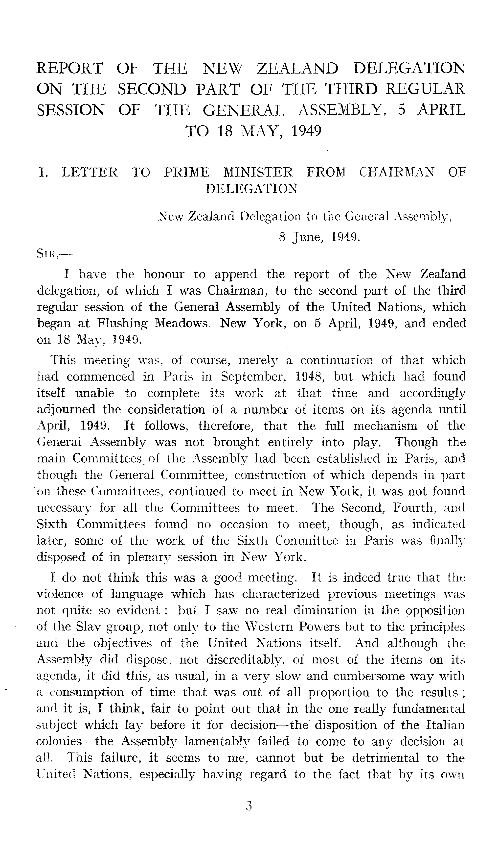 REPORT OF THE NEW ZEALAND DELEGATION ON THE SECOND PART OF THE THIRD REGULAR SESSION OF THE GENERAL ASSEMBLY, 5 APRIL TO 18 MAY, 1949 I. LETTER TO PRIME MINISTER FROM CHAIRMAN OF DELEGATION New Zealand Delegation to the General Assembly, 8 June, 1949. Sir, — I have the honour to append the report of the New Zealand delegation, of which I was Chairman, to the second part of the third regular session of the General Assembly of the United Nations, which began at Flushing Meadows, New York, on 5 April, 1949, and ended on 18 May, 1949. This meeting was, of course, merely a continuation of that which had commenced in Paris in September, 1948, but which had found itself unable to complete its work at that time and accordingly adjourned the consideration of a number of items on its agenda until April, 1949. It follows, therefore, that the full mechanism of the General Assembly was not brought entirely into play. Though the main Committees, of the Assembly had been established in Paris, and though the General Committee, construction of which depends in part on these Committees, continued to meet in New York, it was not found necessary for all the Committees to meet. The Second, Fourth, and Sixth Committees found no occasion to meet, though, as indicated later, some of the work of the Sixth Committee in Paris was finally disposed of in plenary session in New York. I do not think this was a good meeting. It is indeed true that the violence of language which has characterized previous meetings was not quite so evident; but I saw no real diminution in the opposition of the Slav group, not only to the Western Powers but to the principles and the objectives of the United Nations itself. And although the Assembly did dispose, not discreditably, of most of the items on its agenda, it did this, as usual, in a very slow and cumbersome way with a consumption of time that Was out of all proportion to the results; and it is, I think, fair to point out that in the one really fundamental subject which lay before it for decision —the disposition of the Italian colonies—the Assembly lamentably failed to come to any decision at all. This failure, it seems to me, cannot but be detrimental to the United Nations, especially having regard to the fact that by its own