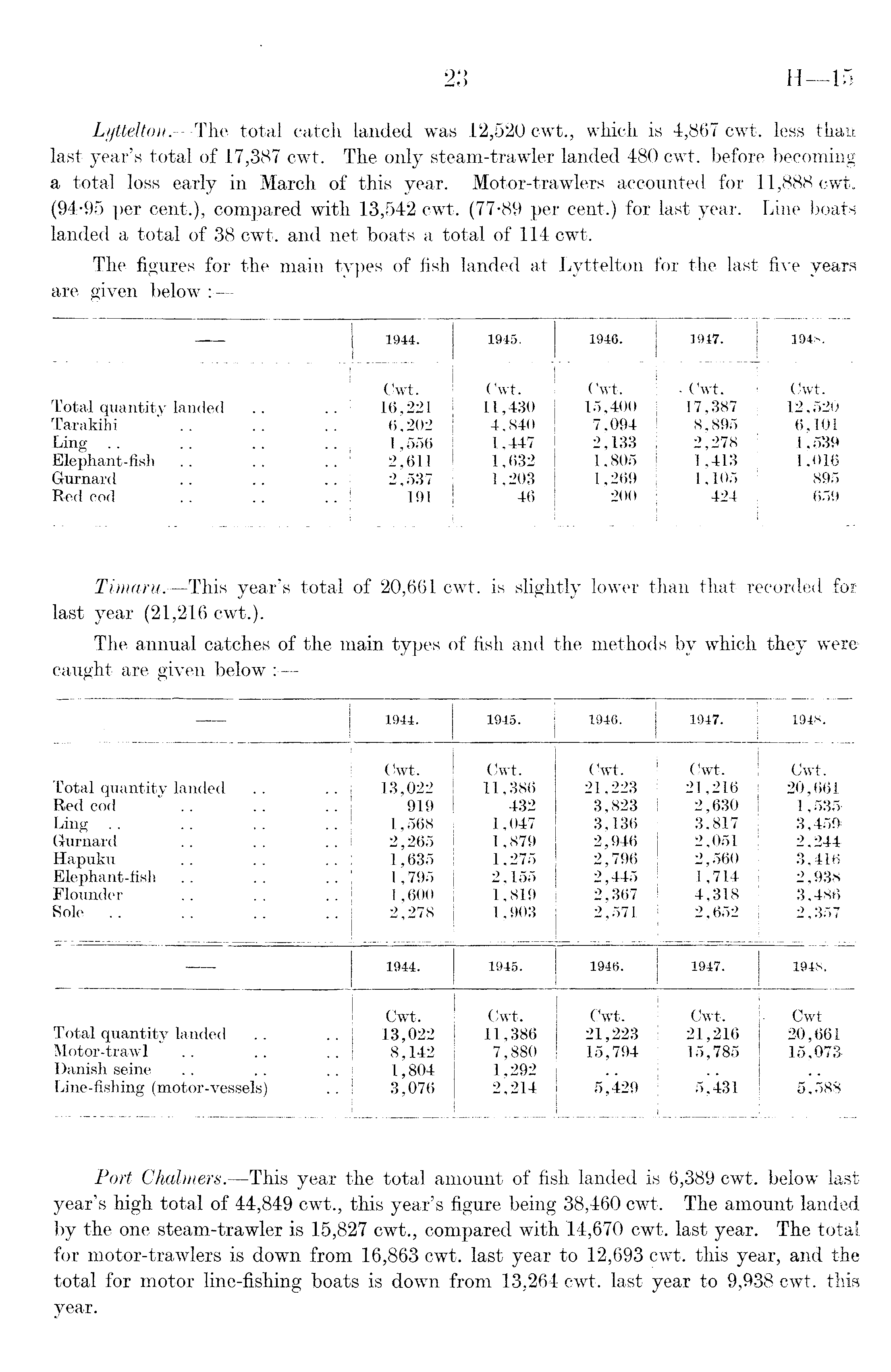 Timaru.—This year's total of 20,661 cwt. is slightly lower than that recorded for last year (21,216 cwt.). The annual catches of the main types of fish and the methods by which they were caught are given below :