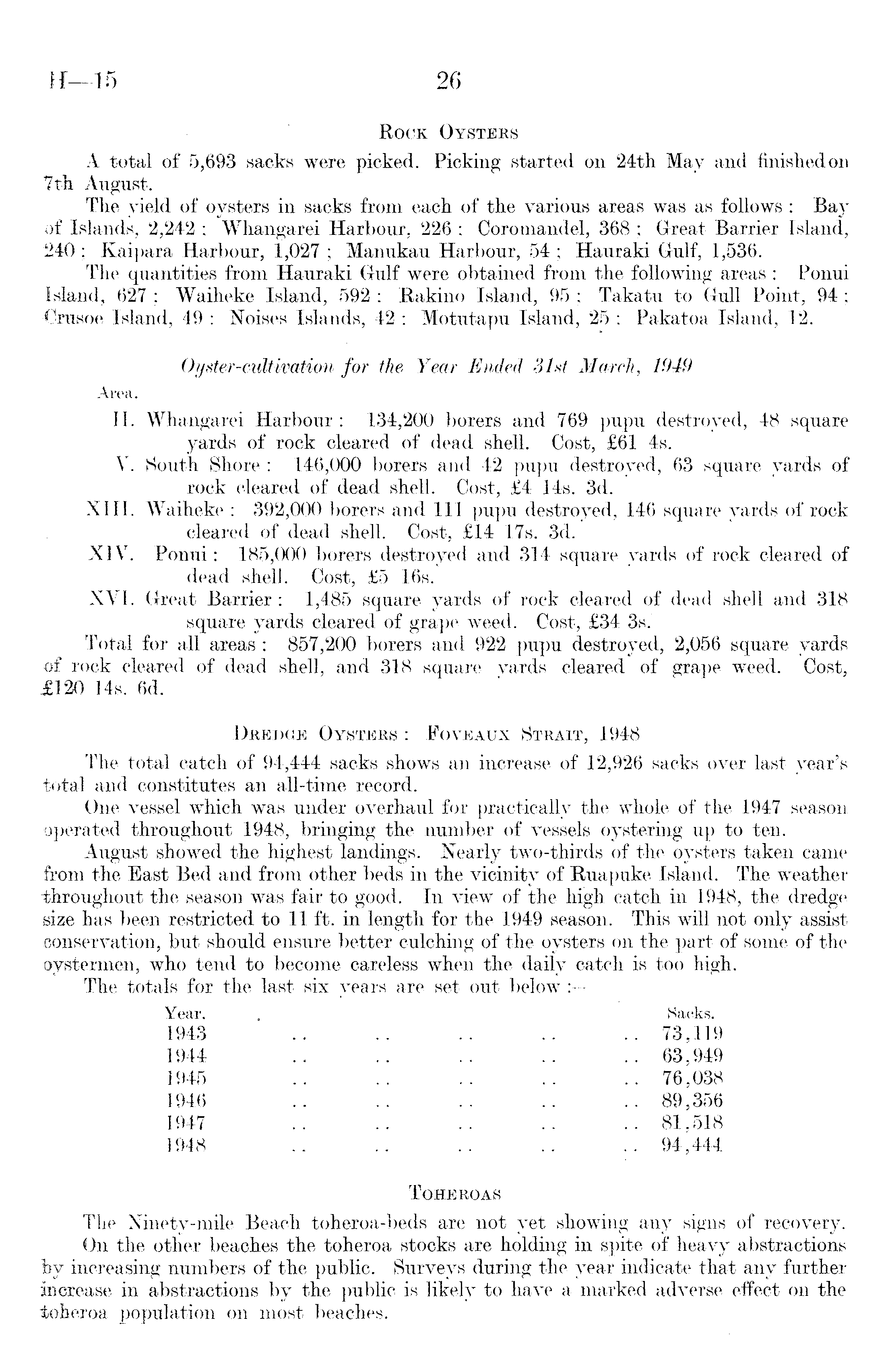 • Rock Oysters A total of 5,693 sacks were picked. Picking started on 24th May and finished on 7th August. The yield of oysters in sacks from each of the various areas was as follows : Bay of Islands, 2,242 ; Whangarei Harbour, 226 ; Coromandel, 368 ; Great Barrier Island, 240 ; Kaipara Harbour, 1,027 ; Manukau Harbour, 54 ; Hauraki Gulf, 1,536. The quantities from Hauraki Gulf were obtained from the following areas : Ponui Island, 627 ; Waiheke Island, 592 ; Rakino Island, 95 ; Takatu to Gull Point, 94 ; •Crusoe Island, 49 : Noises Islands, 42 ; Motutapu Island, 25 ; Pakatoa Island, 12. Oyster-cultivation for the Year Ended 31st March, 1949 Area. 11. Whangarei Harbour: 134,200 borers and 769 pupu destroyed, 48 square yards of rock cleared of dead shell. Cost, £6l 4s. V. South Shore : 146,000 borers and 42 pupu destroyed, 63 square yards of rock cleared of dead shell. Cost, £4 14s. 3d. XIII. Waiheke : 392,000 borers and 111 pupu destroyed, 146 square yards of rock cleared of dead shell. Cost, £l4 17s. 3d. XIV. Ponui: 185,000 borers destroyed and 314 square yards of rock cleared of dead shell. Cost, £5 16s. XVI. Great Barrier : 1,485 square yards of rock cleared of dead shell and 318 square yards cleared of grape weed. Cost, £34 3s. Total for all areas : 857,200 borers and 922 pupu destroyed, 2,056 square yards of rock cleared of dead shell, and 318 square yards cleared of grape weed. Cost, £l2O 14s. 6d. Dredge Oysters : Foveaux Strait, 1948 The total catch of 94,444 sacks shows an increase of 12,926 sacks over last year's total and constitutes "an all-time record. One vessel which was under overhaul for practically the whole of the 1947 season operated throughout 1948, bringing the number of vessels oystering up to ten. August showed the highest landings. Nearly two-thirds of the oysters taken came from the East Bed and from other beds in the vicinity of Ruapuke Island. The weather throughout the season was fair to good. In view of the high catch in 1948, the dredge size has been restricted to 11 ft. in length for the 1949 season. This will not only assist conservation, but should ensure better culching of the oysters on the part of some of the oystermen, who tend to become careless when the daily catch is too high. The totals for the last six years are set out below : Year. . Sacks. 1943 .. .. .. .. .. 73,119 1944 .. .. .. .. .. 63,949 1945 .. .. .. .. .. 76,038 1946 .. .. .. .. .. 89,356 1947 .. .. .. .. .. 81,518 1948 .. .. .. .. .. 94,444 Toheroas The Ninety-mile Beach toheroa-beds are not yet showing any signs of recovery. On the other beaches the toheroa stocks are holding in spite of heavy abstractions by increasing numbers of the public. Surveys during the year indicate that any further increase in abstractions by the public is likely to have a marked adverse effect on the toheroa population on most beaches.