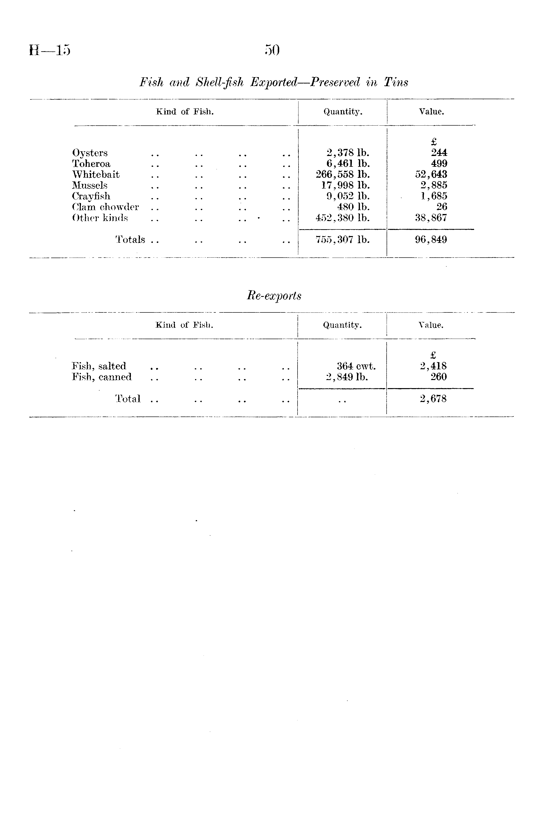 Kind of Fish. Quantity. Value. Oysters 2,3781b. £ 244 Toheroa 6,461 lb. 499 Whitebait 266,558 lb. 52,643 Mussels 17,998 lb. 2,885 Crayfish 9,052 lb. 1,685 Clam chowder 480 lb. 26 Other kinds .. .. .. • 452,380 lb. 38,867 Totals 755,307 lb. 96,849