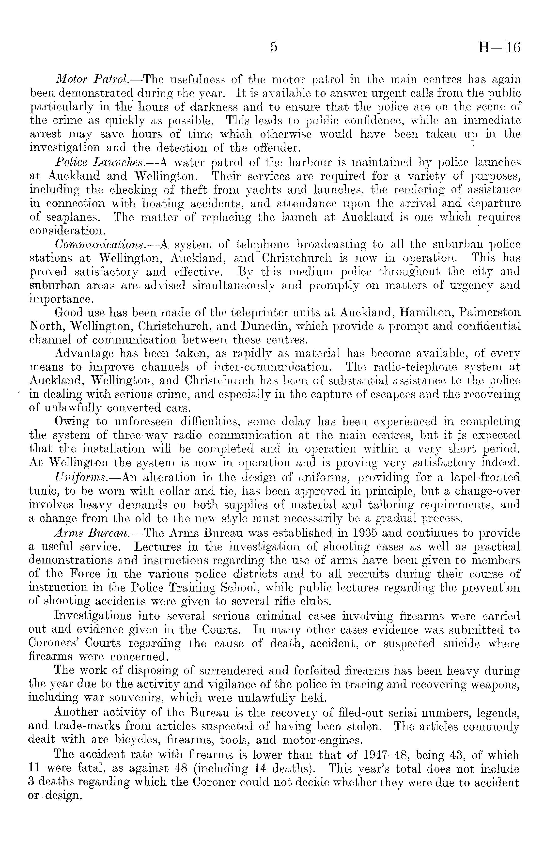 Motor Patrol.—-The usefulness of the motor patrol in the main centres has again been demonstrated during the year. It is available to answer urgent calls from the public particularly in the hours of darkness and to ensure that the police are on the scene of the crime as quickly as possible. This leads to public confidence, while an immediate arrest may save hours of time which otherwise would have been taken up in the investigation and the detection of the offender. Police Launches.—A water patrol of the harbour is maintained by police launches at Auckland and Wellington. Their services are required for a variety of purposes, including the checking of theft from yachts and launches, the rendering of assistance in connection with boating accidents, and attendance upon the arrival and departure of seaplanes. The matter of replacing the launch at Auckland is one which requires consideration. Communications.—A system of telephone broadcasting to all the suburban police stations at "Wellington, Auckland, and Christchurch is now in operation. This has proved satisfactory and effective. By this medium police throughout the city and suburban areas are advised simultaneously and promptly on matters of urgency and importance. Good use has been made of the teleprinter units at Auckland, Hamilton, Palmerston North, Wellington, Christchurch, and Dunedin, which provide a prompt and confidential channel of communication between these centres. Advantage has been taken, as rapidly as material has become available, of every means to improve channels of inter-communication. The radio-telephone system at Auckland, Wellington, and Christchurch has been of substantial assistance to the police in dealing with serious crime, and especially in the capture of escapees and the recovering of unlawfully converted cars. Owing to unforeseen difficulties, some delay has been experienced in completing the system of three-way radio communication at the main centres, but it is expected that the installation will be completed and in operation within a very short period. At Wellington the system is now in operation and is proving very satisfactory indeed. Uniforms. —An alteration in the design of uniforms, providing for a lapel-fronted tunic, to be worn with collar and tie, has been approved in principle, but a change-over involves heavy demands on both supplies of material and tailoring requirements, and a change from the old to the new style must necessarily be a gradual process. Arms Bureau.—The Arms Bureau was established in 1935 and continues to provide a useful service. Lectures in the investigation of shooting cases as well as practical demonstrations and instructions regarding the use of arms have been given to members of the Force in the various police districts and to all recruits during their course of instruction in the Police Training School, while public lectures regarding the prevention of shooting accidents were given to several rifle clubs. Investigations into several serious criminal cases involving firearms were carried out and evidence given in the Courts. In many other cases evidence was submitted to Coroners' Courts regarding the cause of death, accident, or suspected suicide where firearms were concerned. The work of disposing of surrendered and forfeited firearms has been heavy during the year due to the activity and vigilance of the police in tracing and recovering weapons, including war souvenirs, which were unlawfully held. Another activity of the Bureau is the recovery of filed-out serial numbers, legends, and trade-marks from articles suspected of having been stolen. The articles commonly dealt with are bicycles, firearms, tools, and motor-engines. The accident rate with firearms is lower than that of 1947-48, being 43, of which 11 were fatal, as against 48 (including 14 deaths). This year's total does not include 3 deaths regarding which the Coroner could not decide whether they were due to accident or design.