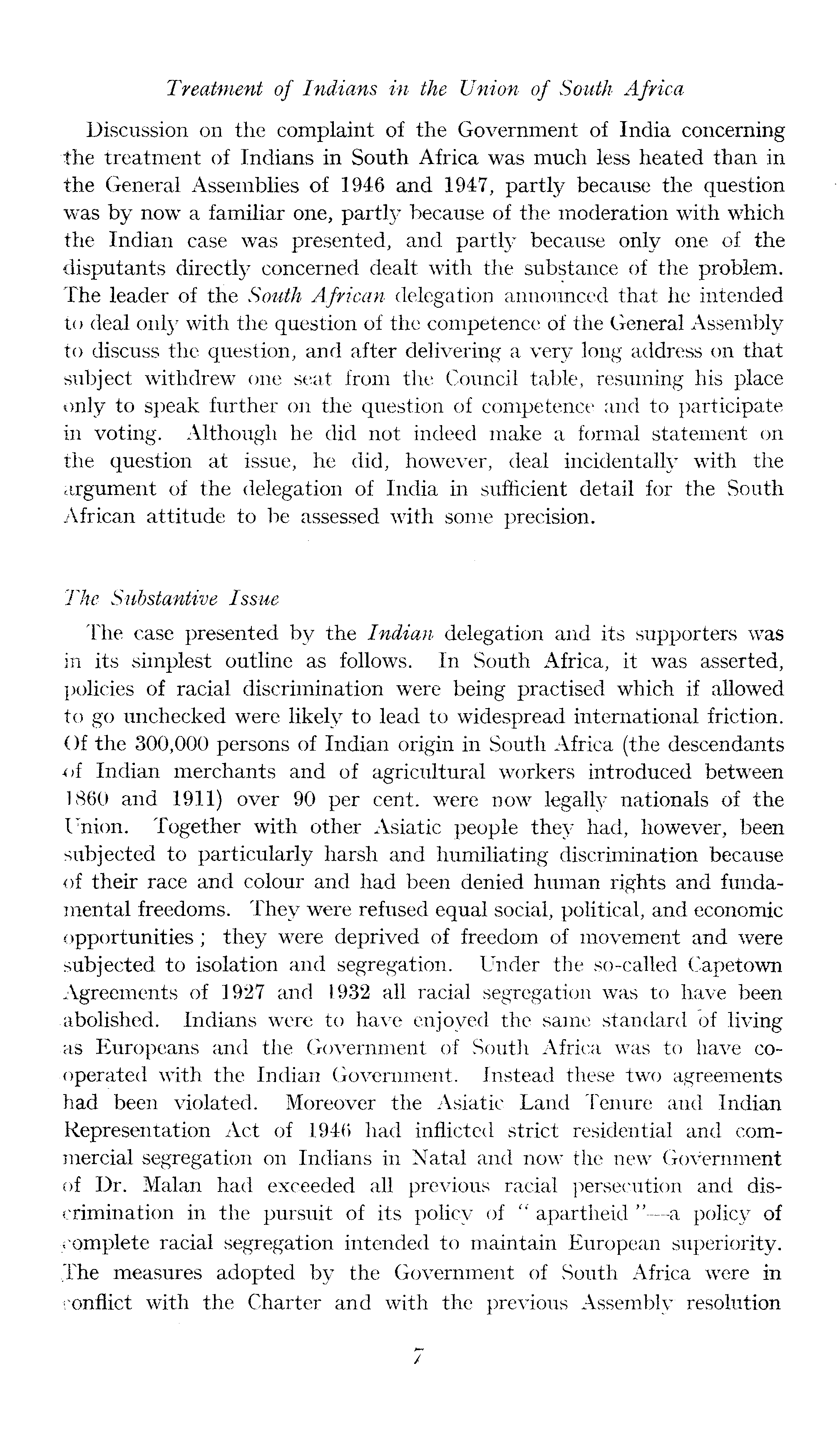Treatment of Indians in the Union of South Africa Discussion on the complaint of the Government of India concerning the treatment of Indians in South Africa was much less heated than in the General Assemblies of 1946 and 1947, partly because the question was by now a familiar one, partly because of the moderation with which the Indian case was presented, and partly because only one of the disputants directly concerned dealt with the substance of the problem. The leader of the South African delegation announced that he intended to deal only with the question of the competence of the General Assembly to discuss the question, and after delivering a very long address on that subject withdrew one seat from the Council table, resuming his place only to speak further on the question of competence and to participate in voting. Although he did not indeed make a formal statement on the question at issue, he did, however, deal incidentally with the argument of the delegation of India in sufficient detail for the South African attitude to be assessed with some precision. The Substantive Issue The case presented by the Indian delegation and its supporters was in its simplest outline as follows. In South Africa, it was asserted, policies of racial discrimination were being practised which if allowed to go unchecked were likely to lead to widespread international friction. Of the 300,000 persons of Indian origin in South Africa (the descendants of Indian merchants and of agricultural workers introduced between 1860 and 1911) over 90 per cent, were now legally nationals of the Union. Together with other Asiatic people they had, however, been subjected to particularly harsh and humiliating discrimination because of their race and colour and had been denied human rights and fundamental freedoms. They were refused equal social, political, and economic opportunities; they were deprived of freedom of movement and were subjected to isolation and segregation. Under the so-called Capetown Agreements of 1927 and 1932 all racial segregation was to have been abolished. Indians were to have enjoyed the same standard of living as Europeans and the Government of South Africa was to have cooperated with the Indian Government. Instead these two agreements had been violated. Moreover the Asiatic Land Tenure and Indian Representation Act of 1946 had inflicted strict residential and commercial segregation on Indians in Natal and now the new Government of Dr. Malan had exceeded all previous racial persecution and discrimination in the pursuit of its policy of " apartheid " —a policy of complete racial segregation intended to maintain European superiority. The measures adopted by the Government of South Africa were in conflict with the Charter and with the previous Assembly resolution