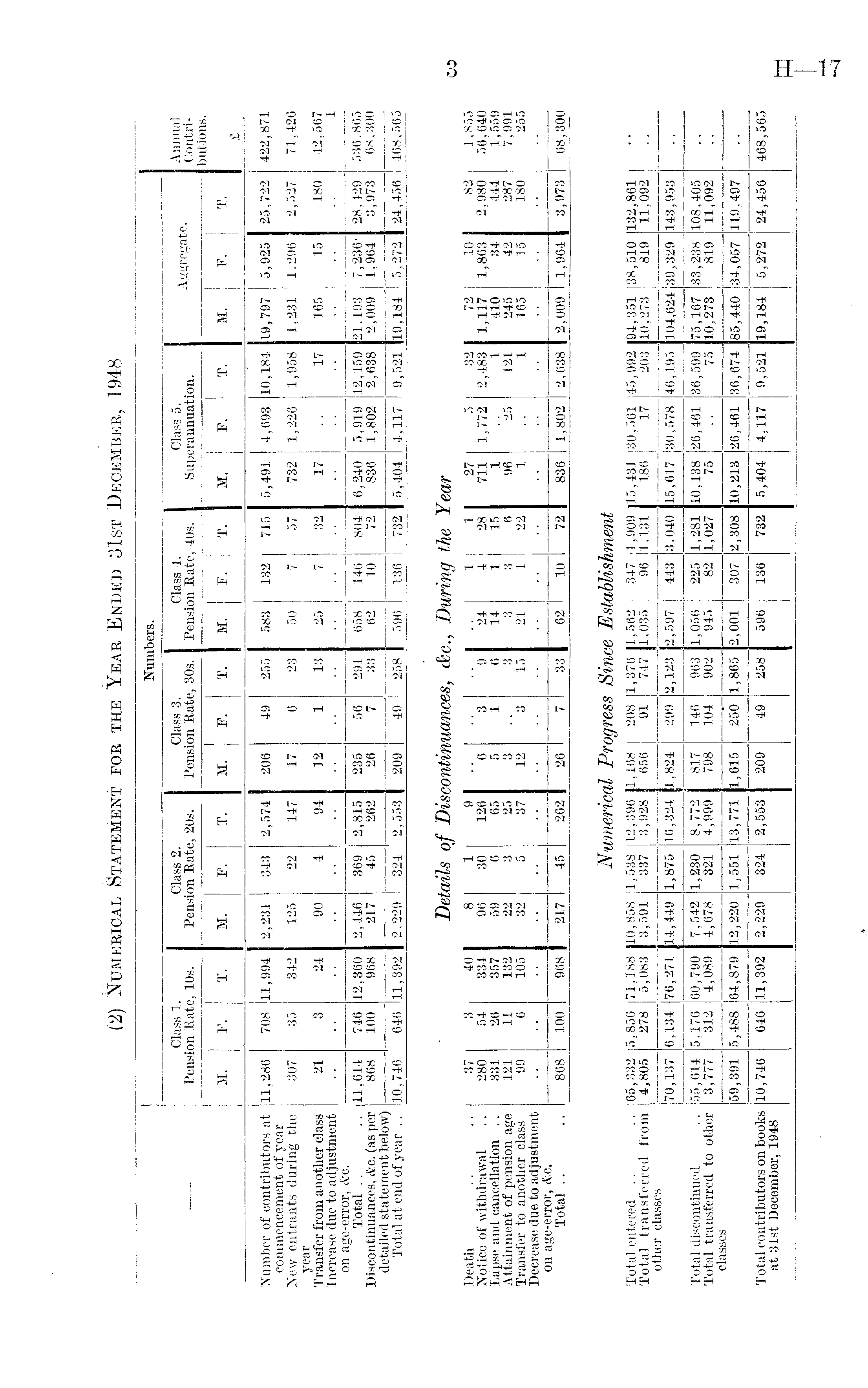 Numbers. Class 1 Pension Rat( >, 10s. Class 2. Pension Bate, 20s. Class 3. Pension Bate, 30s. Class 4. Pension Bate, 40s. Class 5. Superannuat ion. Aggregate. Annual Contributions. £ M. F. T. M. IT. T. 1 M. | F. T. M. F. T. M. F. T. M. F. T. Number of contributors at commencement of year New entrants during the year Transfer from another class Increase due to adjustment on age-error, &c. Total Discontinuances, <fcc. (as per detailed statement below) Total at end of year .. 11,286 307 21 708 35 3 11,994 342 24 2,231 125 90 343 22 4 2,574 147 94 206 17 12 49 6 1 255 23 13 583 50 25 132 7 7 715 57 32 5,491 732 17 4,693 1,226 10,184 1,958 17 19,797 1,231 165 5,925 1,296 15 25,722 2,527 180 422,871 71,426 42,567 1 11,614 868 746 100 12,360 968 2,446 217 369 45 2,815 262 235 26 56 7 291 33 658 62 146 10 804 72 6,240 836 5,919 1,802 12,159 2,638 21.193 2,009 7,2361,964 28,429 3,973 536,865 68,300 10,746 646 11,392 2,229 324 2,553 209 49 1 258 596 136 732 5,404 4,117 9,521 19,184 5,272 24,456 408,565 Death Notice of withdrawal Lapse and cancellation .. Attainment of pension age Transfer to another class Decrease due to adjustment on age-error, &c. Total .. 37 280 331 121 99 3 54 26 11 6 40 334 357 132 105 Details of Discontinuances, &c, During 8 1 9 1 96 30 126 6 3 9 24 4 59 6 65 5 1 6 14 1 22 3 25 3 .. 3 3 3 32 5 37 12 3 15 21 1 the Year 1 27 28 711 15 1 6 96 22 1 1,772 25 32 2,483 1 121 1 72 1,117 410 245 165 10 1,863 34 42 15 82 2,980 444 287 180 1,855 56,640 1,559 7,991 255 868 100 968 217 45 262 26 7 33 62 10 72 836 1,802 2,638 2,009 1,964 3,973 68,300 Total entered Total transferred from other classes 65,332 4,805 5,856 278 71,188 5,083 10,858 3,591 Ni 1,538 337 imeric 12,396 3,928 %l Pr 1,168 656 ogress 208 91 Since Establishment 1,376 1,562 347 1,909 747 1,035 96 1,131 15,431 186 30,561 17 45,992 203 94,351 138,510 10,273 1 819 l 132,861 11,092 70,137 6,134 76,271 14,449 1,875 16,324 1,824 299 2,123 2,597 443 3,040 15,617 30,578 46,195 104,624 39,329 143,953 Total discontinued Total transferred to other classes 55,614 3,777 5,176 312 60,790 4,089 7,542 4,678 1,230 321 8,772 4,999 817 798 146 104 963 902 1,056 945 225 82 1,281 1,027 10,138 75 26,461 36,599 75 75,167 10,273 33,238 819 108,405 11,092 59,391 5,488 64,879 12,220 1,551 13,771 1,615 250 1,865 2,001 307 2,308 10,213 26,461 36,674 85,440 34,057 119,497 Total contributors on books at 31st December. 1948 10,746 646 11,392 2,229 324 2,553 209 49 258 596 136 732 5,404 4,117 9,521 19,184 5,272 24,456 468,565
