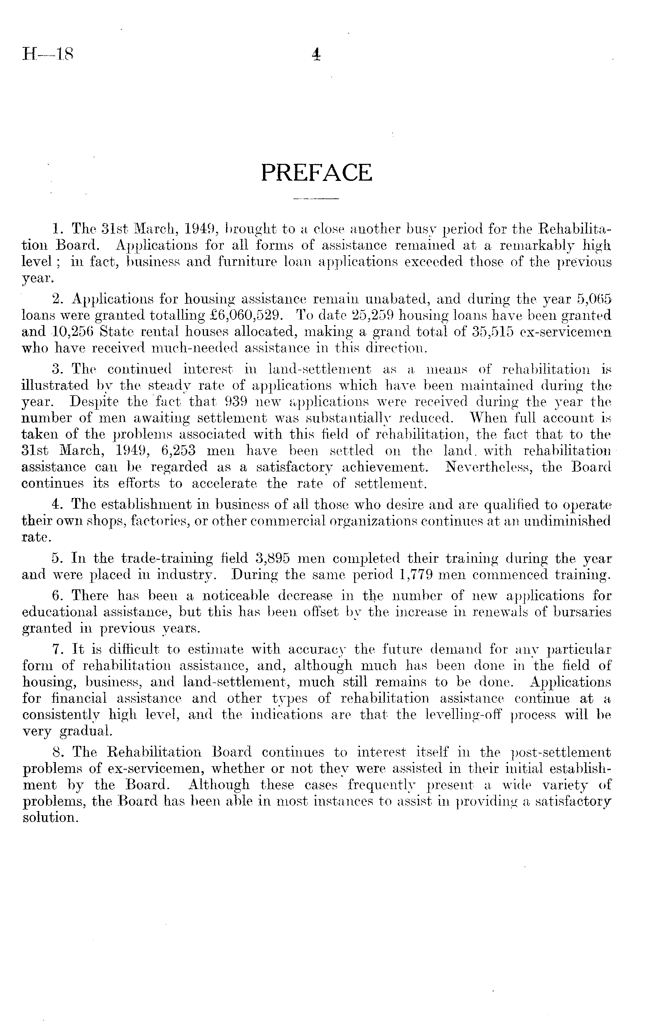 1. The 31st March, 1949, brought to a close another busy period for the Rehabilitation Board. Applications for all forms of assistance remained at a remarkably high level; in fact, business and furniture loan applications exceeded those of the previous year. 2. Applications for housing assistance remain unabated, and during the year 5,065 loans were granted totalling £6,060,529. To date 25,259 housing loans have been granted and 10,256 State rental houses allocated, making a grand total of 35,515 ex-servicemen who have received much-needed assistance in this direction. 3. The continued interest in land-settlement as a means of rehabilitation is illustrated by the steady rate of applications which have been maintained during the year. Despite the fact that 939 new applications were received during the year the number of men awaiting settlement was substantially reduced. When full account is taken of the problems associated with this field of rehabilitation, the fact that to the 31st March, 1949, 6,253 men have been settled on the land, with rehabilitation assistance can be regarded as a satisfactory achievement. Nevertheless, the Board continues its efforts to accelerate the rate of settlement. 4. The establishment in business of all those who desire and are qualified to operate their own shops, factories, or other commercial organizations continues at an undiminished rate. 5. In the trade-training .field 3,895 men completed their training during the year and were placed in industry. During the same period 1,779 men commenced training. 6. There has been a noticeable decrease in the number of new applications for educational assistance, but this has been offset by the increase in renewals of bursaries granted in previous years. 7. It is difficult to estimate with accuracy the future demand for any particular form of rehabilitation assistance, and, although much has been done in the field of housing, business, and land-settlement, much still remains to be done. Applications for financial assistance and other types of rehabilitation assistance continue at a consistently high level, and the indications are that the levelling-off process will be very gradual. 8. The Rehabilitation Board continues to interest itself in the post-settlement problems of ex-servicemen, whether or not they were assisted in their initial establishment by the Board. Although these cases frequently present a wide variety of problems, the Board has been able in most instances to assist in providing a satisfactory solution.