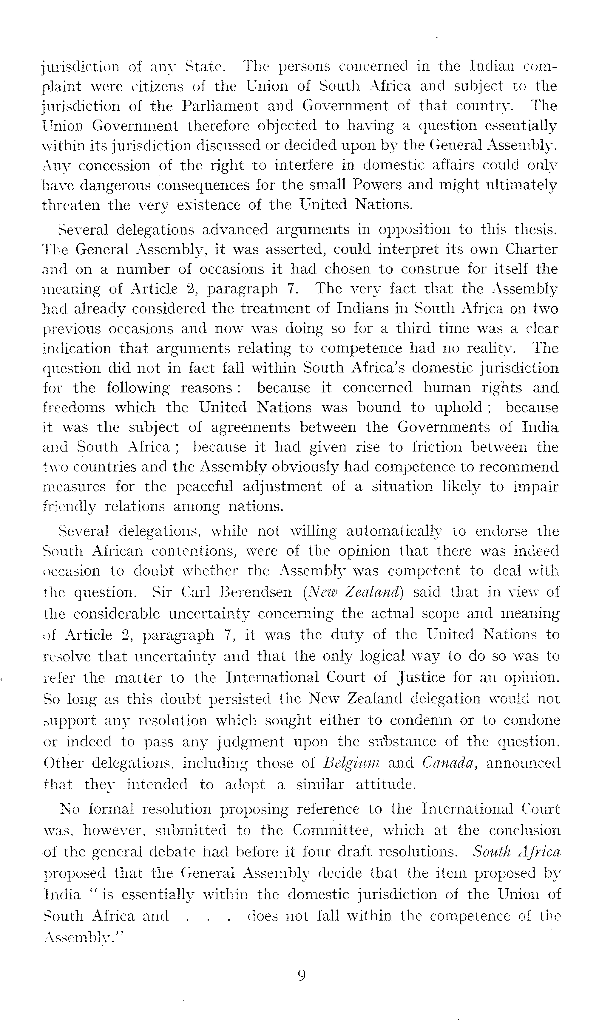 jurisdiction of any State. The persons concerned in the Indian complaint were citizens of the Union of South Africa and subject to the jurisdiction of the Parliament and Government of that country. The Union Government therefore objected to having a question essentially within its jurisdiction discussed or decided upon by the General Assembly. Any concession of the right to interfere in domestic affairs could only have dangerous consequences for the small Powers and might ultimately threaten the very existence of the United Nations. Several delegations advanced arguments in opposition to this thesis. The General Assembly, it was asserted, could interpret its own Charter and on a number of occasions it had chosen to construe for itself the meaning of Article -2, paragraph 7. The very fact that the Assembly had already considered the treatment of Indians in South Africa on two previous occasions and now was doing so for a third time was a clear indication that arguments relating to competence had no reality. The question did not in fact fall within South Africa's domestic jurisdiction for the following reasons : because it concerned human rights and freedoms which the United Nations was bound to uphold; because it was the subject of agreements between the Governments of India and South Africa ; because it had given rise to friction between the two countries and the Assembly obviously had competence to recommend measures for the peaceful adjustment of a situation likely to impair friendly relations among nations. Several delegations, while not willing automatically to endorse the South African contentions, were of the opinion that there was indeed ■occasion to doubt whether the Assembly was competent to deal with the question. Sir Carl Berendsen (New Zealand) said that in view of the considerable uncertainty concerning the actual scope and meaning •of Article 2, paragraph 7, it was the duty of the United Nations to resolve that uncertainty and that the only logical way to. do so was to refer the matter to the International Court of Justice for an opinion. So long as this doubt persisted the New Zealand delegation would not support any resolution which sought either to condemn or to condone ■or indeed to pass any judgment upon the substance of the question. Other delegations, including those of Belgium and Canada, announced that they intended to adopt a similar attitude. No formal resolution proposing reference to the International Court was, however, submitted to the Committee, which at the conclusion •of the general debate had before it four draft resolutions. South Africa proposed that the General Assembly decide that the item proposed by India " is essentially within the domestic jurisdiction of the Union of South Africa and . . . does not fall within the competence of the Assembly."