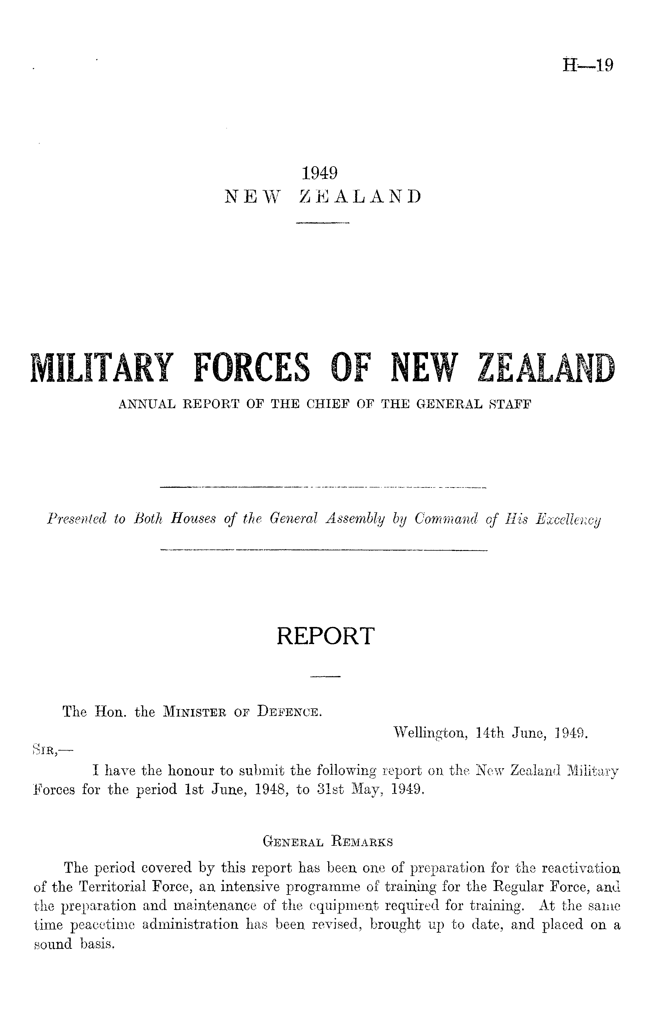 The Hon. the Minister of Defence. Wellington, 14th June, 1949. Sir, — I have the honour to submit the following report on the New Zealand Military Forces for the period Ist June, 1948, to 31st May, 1949. General Remarks The period covered by this report has been one of preparation for the reactivation of the Territorial Force, an intensive programme of training for the Regular Force, and the preparation and maintenance of the equipment required for training. At the same time peacetime administration has been revised, brought up to date, and placed on a sound basis.