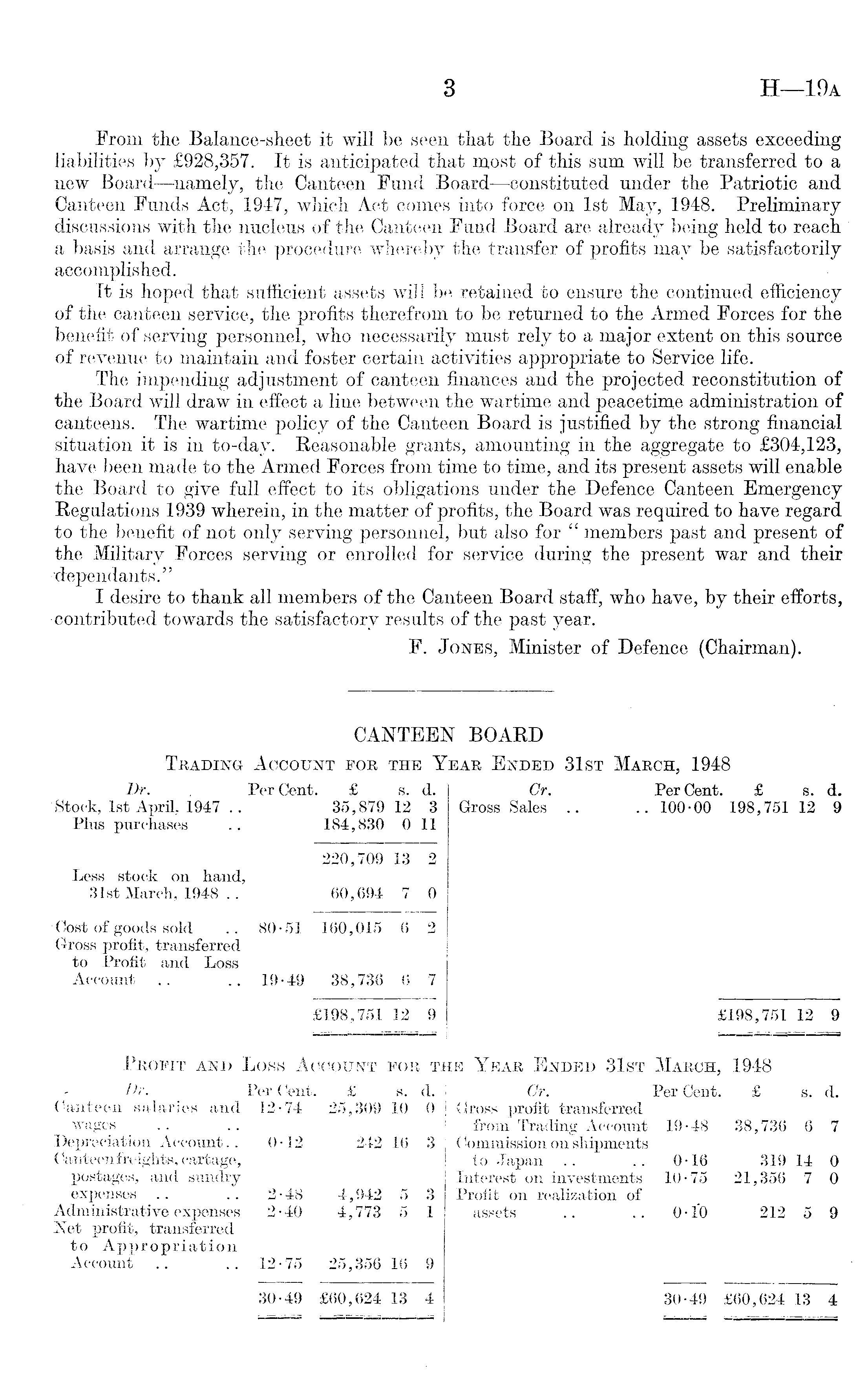 From the Balance-sheet it will be seen that the Board is holding assets exceeding liabilities by £928,357. It is anticipated that most of this sum will be transferred to a new Board —namely, the Canteen Fund Board—constituted under the Patriotic and Canteen Funds Act, 1947, which Act comes into force on Ist May, 1948. Preliminary discussions with the nucleus of the Canteen Fund Board are already being held to reach a basis and arrange the procedure whereby the transfer of profits may be satisfactorily accomplished. It is hoped that sufficient assets will be retained to ensure the continued efficiency of the canteen service, the profits therefrom to be returned to the Armed Forces for the benefit of serving personnel, who necessarily must rely to a major extent on this source of revenue to maintain and foster certain activities appropriate to Service life. The impending adjustment of canteen finances and the projected reconstitution of the Board will draw in effect a line between the wartime and peacetime administration of canteens. The wartime policy of the Canteen Board is justified by the strong financial situation it is in to-day. Reasonable grants, amounting in the aggregate to £304,123, have been made to the Armed Forces from time to time, and its present assets will enable the Board to give full effect to its obligations under the Defence Canteen Emergency Regulations 1939 wherein, in the matter of profits, the Board was required to have regard to the benefit of not only serving personnel, but also for " members past and present of .the Military Forces serving or enrolled for service during the present war and their dependants." I desire to thank all members of the Canteen Board staff, who have, by their efforts, ■contributed towards the satisfactory results of the past year. F. Jones, Minister of Defence (Chairman).
