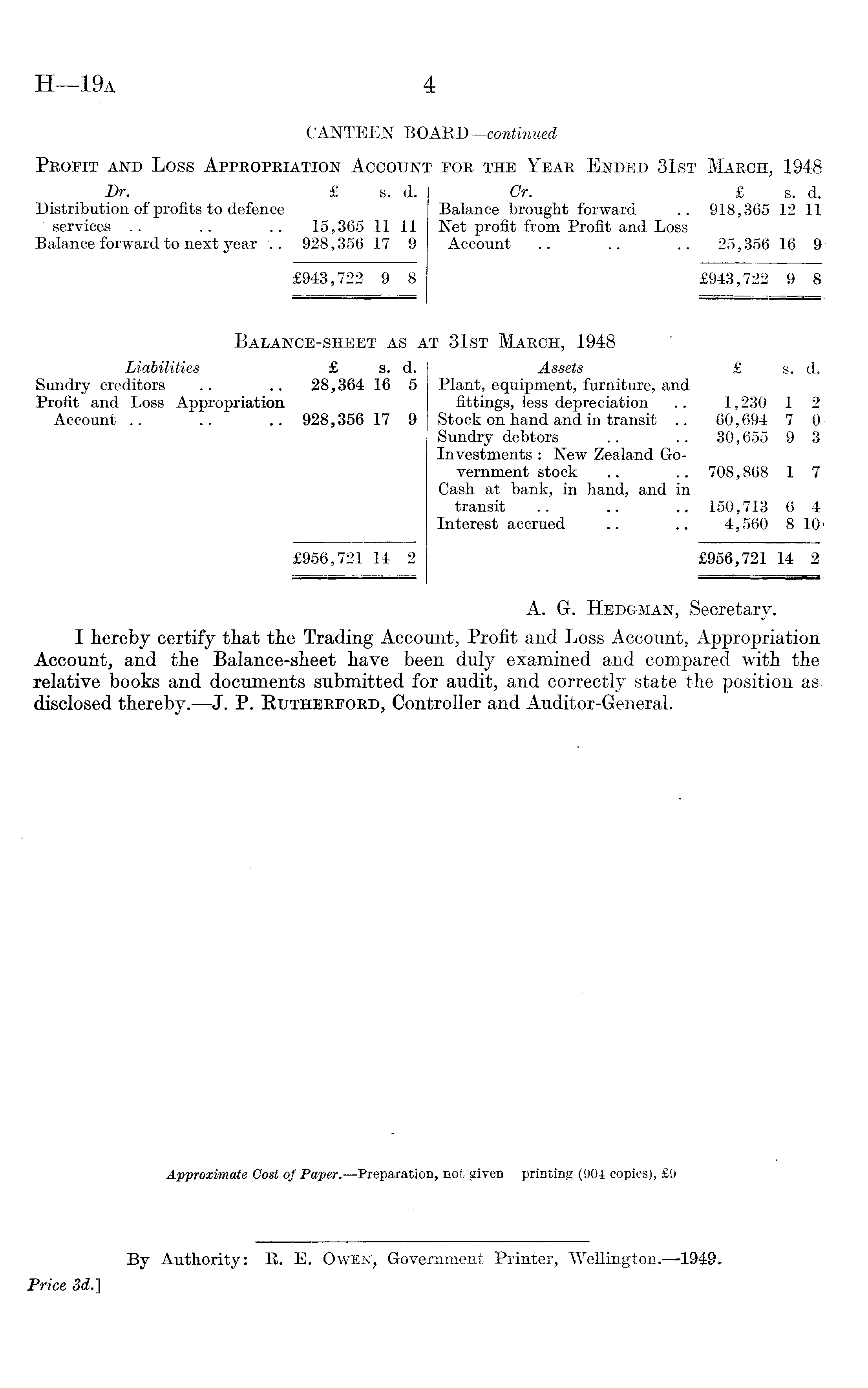 CANTEEN BOARD—continued Profit and Loss Appropriation Account for the Year Ended 31st March, 1948 Dr. £ s. d. Gr. £ s. d. Distribution of profits to defence Balance brought forward .. 918,365 12 11 services .. .. .. 15,365 11 11 Net profit from Profit and Loss Balance forward to next year .. 928,356 17 9 Account .. .. .. 25,356 16 9 £943,722 9 8 £943,722 9 8 Balance-sheet as at 31st March, 1948 Liabilities £ s. d. Assets £ s. deSundry creditors .. .. 28,364 16 5 Plant, equipment, furniture, and Profit and Loss Appropriation fittings, less depreciation .. 1,230 1 2 Account .. .. .. 928,356 17 9 Stock on hand and in transit .. 60,694 7 0 Sundry debtors .. .. 30,655 9 3 Investments : New Zealand Government stock .. .. 708,868 1 7" Cash at bank, in hand, and in transit .. .. .. 150,713 6 4 Interest accrued .. .. 4,560 8 10" £956,721 14 2 £956,721 14 2 A. Gr. Hedgman, Secretary. I hereby certify that the Trading Account, Profit and Loss Account, Appropriation Account, and the Balance-sheet have been duly examined and compared with the relative books and documents submitted for audit, and correctly state the position as. disclosed thereby. —J. P. Rutherford, Controller and Auditor-General.