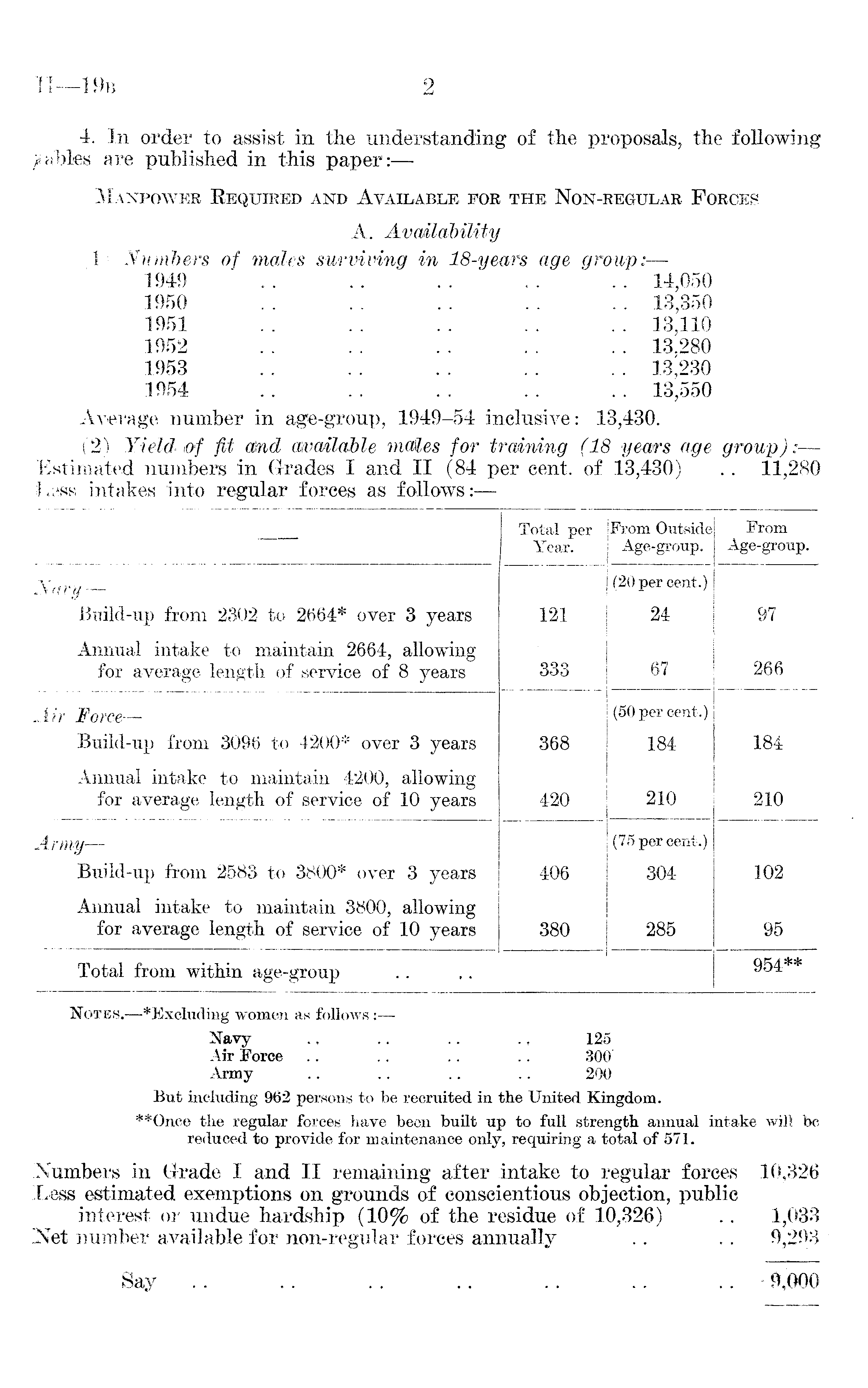 4. In order to assist in the understanding of the proposals, the following -tables are published in this paper:— Manpower Required and Available eor the Non-regular Forces A. Availability 1 Numbers of males surviving in 18-years age group: — 1949 . . . . . . . . . . 14,050 1950 .. .. .. .. .. 13,350 1951 .. .. .. .. .. 13,110 1953 '.'. '.'. '.'. '.'. '.'. 13*230 1954 . . . . . . . . . . 13,550 Average number in age-group, 1949-54 inclusive: 13,430. (2) Yield of fit and available males for training (18 years age group); — Estimated numbers in Grades I and II (84 per cent, of 13,430) . . 11,280 Lass intakes into regular forces as follows: