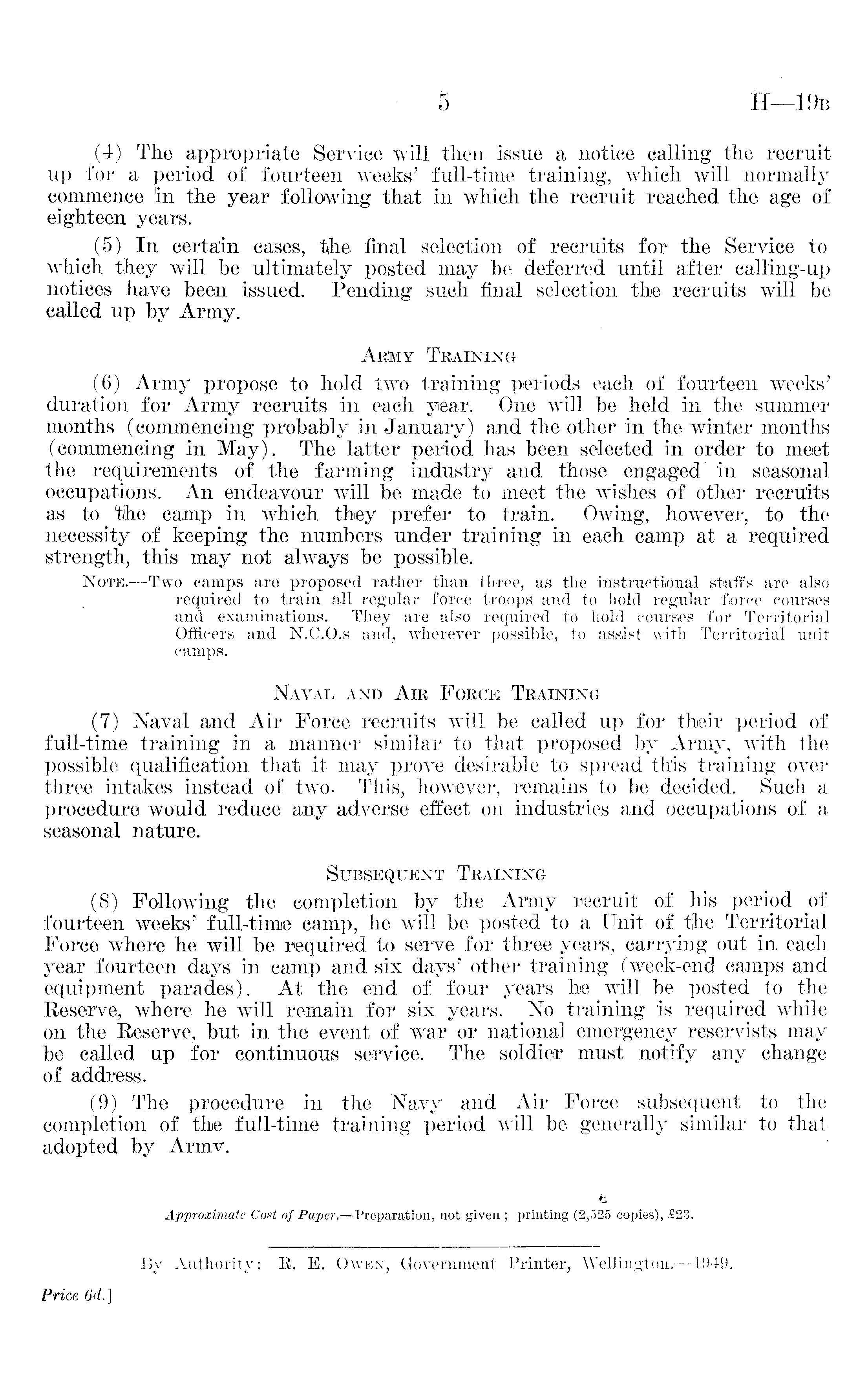 (4) The appropriate Service will then issue a notice calling the recruit up for a period, of fourteen weeks' full-time training, which will normally commence in the year following that in which the recruit reached the age of eighteen years. (5) In certain cases, tlhe final selection of recruits for the Service to which they will be ultimately posted may be deferred until after calling-up notices have been issued. Pending such final selection the recruits will be called up by Army. Army Training (6) Army propose to hold two training periods each of fourteen weeks' duration for Army recruits in each year. One will be held in the summer months (commencing probably in January) and the other in the winter months (commencing in May). The latter period has been selected in order to meet the requirements of the farming industry and those engaged in seasonal occupations. An endeavour will be made to meet the wishes of other recruits as to the camp in which they prefer to train. Owing, however, to the necessity of keeping the numbers under training in each camp at a required strength, this may not always be possible. Note.—Two camps are proposed rather than three, as the instructional staffs are also . required to train all regular force troops and to hold regular force courses and examinations. They are also required to hold courses for Territorial Officers and N.C.O.s and, wherever possible, to assist with Territorial unit camps. Naval and Air Force Training (7) Naval and Air Force recruits will be called up for their period, of full-time training in a manner similar to that proposed by Army, with the possible qualification that it may prove desirable to spread this training over three intakes instead of two. This, however, remains to be decided. Such a procedure would reduce any adverse effect on industries and occupations of a seasonal nature. Subsequent Training (8) Following the completion by the Army recruit of his period of fourteen weeks' full-time camp, he will be posted to a Unit of the Territorial Force where he will be required to serve for three years, carrying out in each year fourteen days in camp and six days' other training (week-end camps and equipment parades). At the end of four years he will be posted to the Keserve, where he will remain for six years. No training is required while on the Reserve, but in the event of war or national emergency reservists may be called up for continuous service. The soldier must notify any change of address. (9) The procedure in the Navy and Air Force subsequent to the completion of the full-time training period will be generally similar to that adopted by Armv.