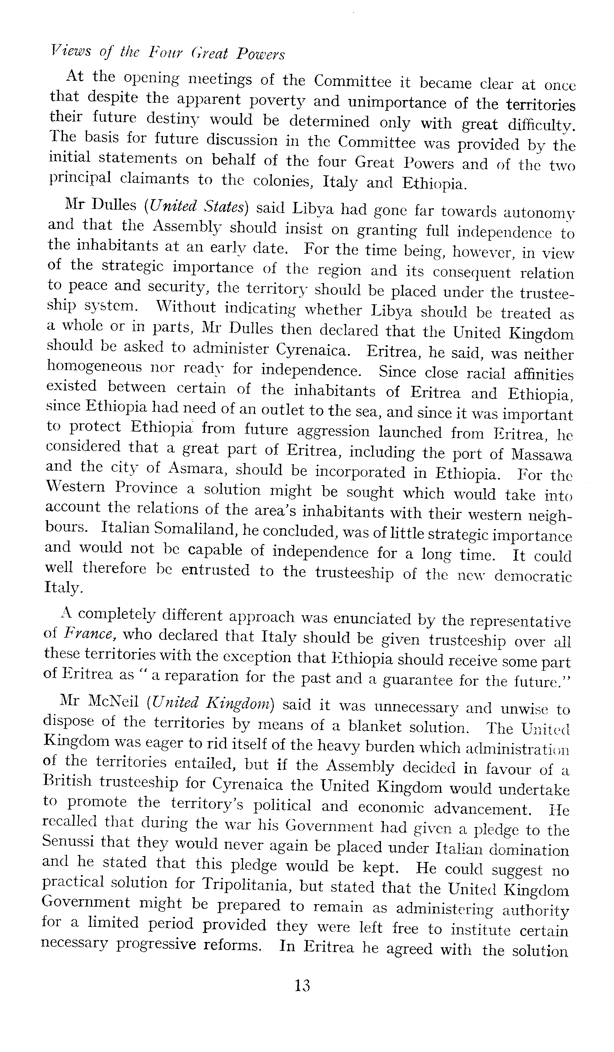 Views of the Four Great Powers At the opening meetings of the Committee it became clear at once that despite the apparent poverty and unimportance of the territories their future destiny would be determined only with great difficulty. The basis for future discussion in the Committee was provided by the initial statements on behalf of the four Great Powers and of the two principal claimants to the colonies, Italy and Ethiopia. Mr Dulles (United States) said Libya had gone far towards autonomy and that the Assembly should insist on granting full independence to the inhabitants at an early date. For the time being, however, in view of the strategic importance of the region and its consequent relation to peace and security, the territory should be placed under the trusteeship system. Without indicating whether Libya should be treated as a whole or in parts, Mr Dulles then declared that the United Kingdom should be asked to administer Cyrenaica. Eritrea, he said, was neither homogeneous nor ready for independence. Since close racial affinities existed between certain of the inhabitants of Eritrea and Ethiopia, since Ethiopia had need of an outlet to the sea, and since it was important to protect Ethiopia from future aggression launched from Eritrea, he considered that a great part of Eritrea, including the port of Massawa and the city of Asmara, should be incorporated in Ethiopia. For the Western Province a solution might be sought which would take into account the relations of the area's inhabitants with their western neighbours. Italian Somaliland, he concluded, was of little strategic importance and would not be capable of independence for a long time. It could well therefore be entrusted to the trusteeship of the new democratic Italy. A completely different approach was enunciated by the representative of France, who declared that Italy should be given trusteeship over all these territories with the exception that Ethiopia should receive'some part of Eritrea as a reparation for the past and a guarantee for the future." Mr McNeil (United Kingdom) said it was unnecessary and unwise to dispose of the territories by means of a blanket solution. The United Kingdom was eager to rid itself of the heavy burden which administration of the territories entailed, but if the Assembly decided in favour of a British trusteeship for Cyrenaica the United Kingdom would undertake to promote the territory's political and economic advancement. He recalled that during the war his Government had given a pledge to the Senussi that they would never again be placed under Italian domination and he stated that this pledge would be kept. He could suggest no practical solution for Tripolitania, but stated that the United Kingdom Government might be prepared to remain as administering authority for a limited period provided they were left free to institute certain necessary progressive reforms. In Eritrea he agreed with the solution